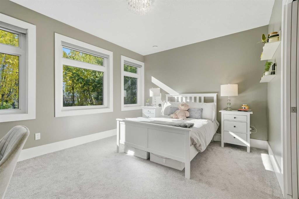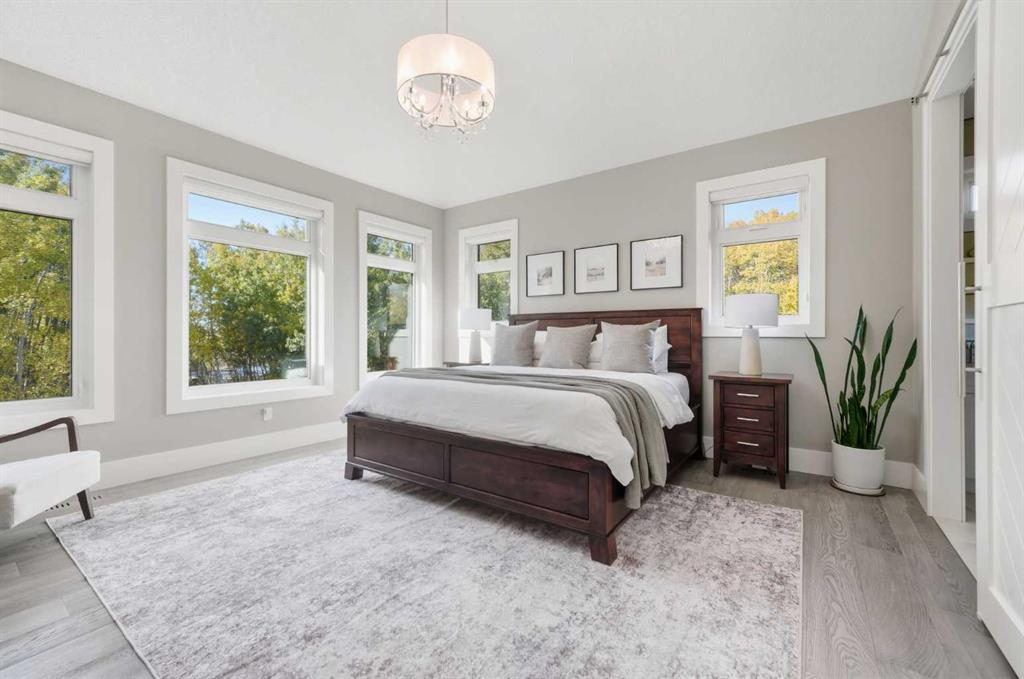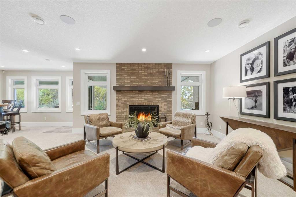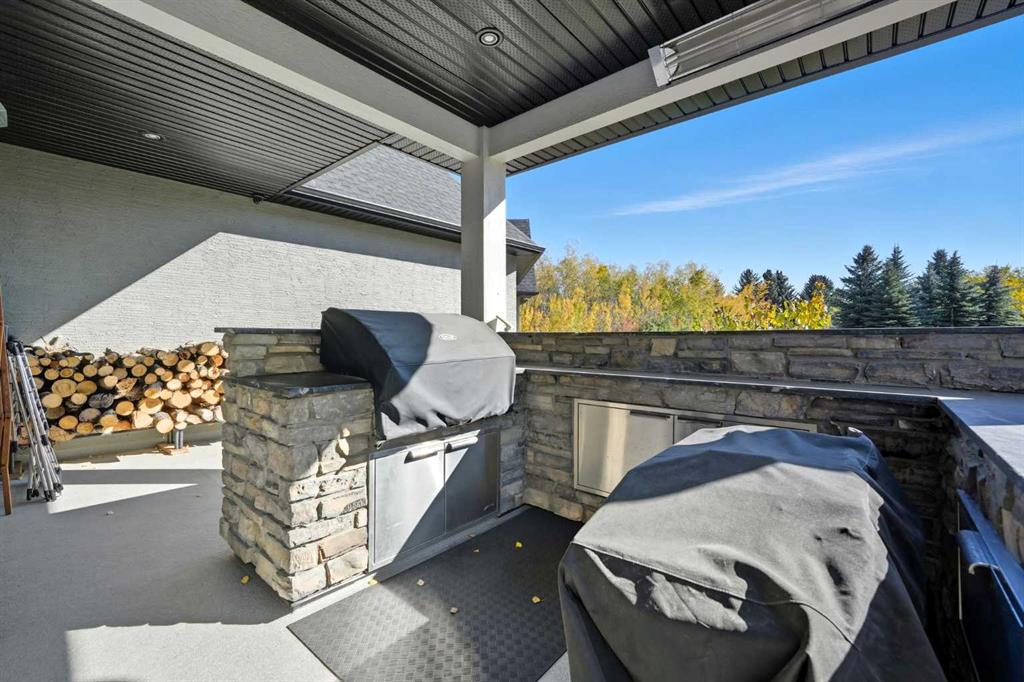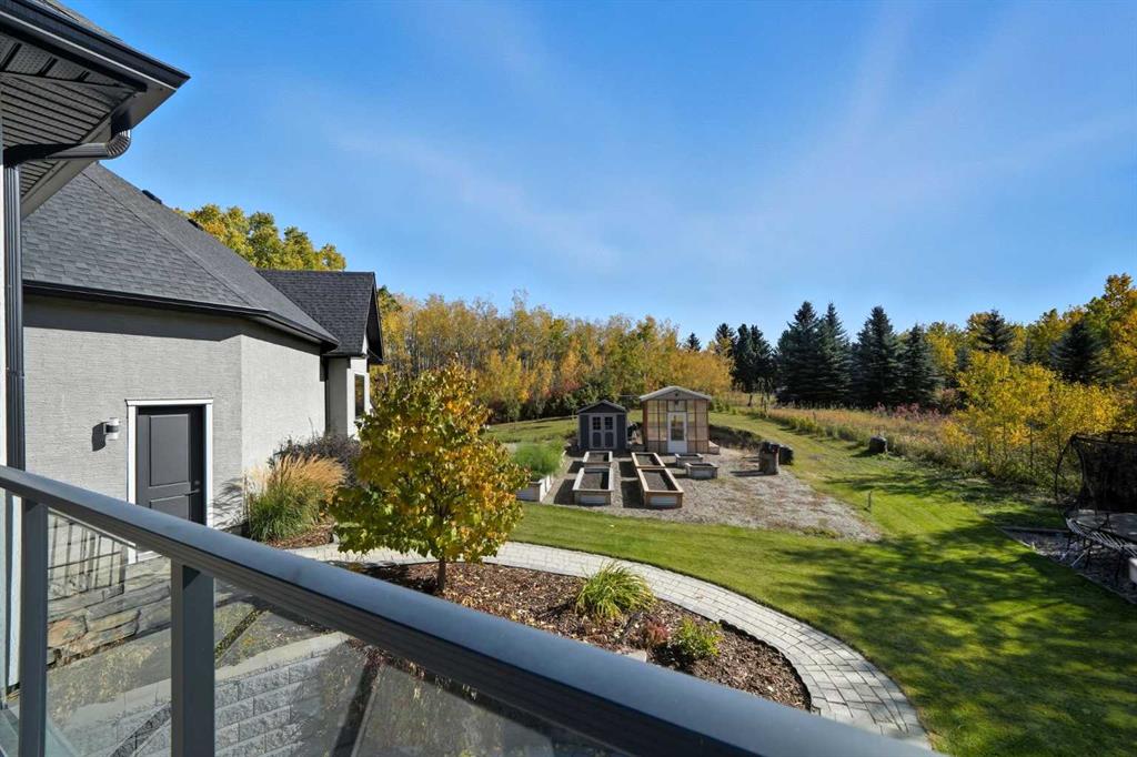 Welcome to this exceptional family acreage retreat in the peaceful community of Eagle Bend Estates, set on nearly 3 acres of beautifully landscaped grounds just minutes south of Calgary. This stunning 3+2 bedroom, 4.5 bath bungalow combines timeless design, quality craftsmanship, and modern comfort—perfect for families seeking space, serenity, and connection to nature without sacrificing convenience. Step inside to discover a warm, inviting main level featuring over 2,400 sq ft of thoughtfully designed living space. Vaulted ceilings and large windows flood the open concept great room with natural light, complementing hardwood floors and a striking feature fireplace that anchors the space. The gourmet kitchen is the heart of the home—designed for family gatherings and entertaining alike—with sleek quartz countertops, a large centre island, built-in appliances including a Miele steam oven, and a fully paneled fridge and freezer for a seamless custom look. Adjacent to the kitchen, the spacious dining area and sunroom open to a covered patio for effortless indoor-outdoor living. The primary suite is a peaceful retreat with a generous walk-in closet and a luxurious ensuite featuring a soaker tub, steam shower, and dual vanities. Two additional bedrooms (one currently used as an office) on the main level share a stylish 3-piece bath, while a well-planned mudroom and laundry area enhance everyday functionality. The fully developed lower level expands the living space with a large family and games area, wet bar, media room, two additional bedrooms each with a private ensuite—ideal for teens or guests. Comfort and quality are found throughout with central A/C, built-in sound, and abundant storage. Outdoors, this property truly shines. A paved lane leads to the home, framed by mature trees and meticulous landscaping. The oversized triple attached heated garage boasts 14-foot ceilings—perfect for large vehicles, hobbyists, or additional storage. A covered deck with infrared heaters, outdoor speakers and custom outdoor kitchen with BBQ oven and built-in grill create an ideal setting for outdoor entertaining. The nearly 3-acre lot includes gutter guards on the house, manicured lawns, a hot tub, greenhouse, and a sport court supplied by its own dedicated well, separate from the domestic well serving the home. Designed for families who love to live, entertain, and play, this property balances practicality with luxury. With underground sprinklers, thoughtful irrigation, and ample space to enjoy every season, it offers true country living with city convenience just minutes away. Located in a friendly, sought-after community close to schools, shopping, and major routes, this home provides the perfect blend of rural tranquility and urban accessibility. A rare offering where quality, comfort, and lifestyle come together—welcome home to Eagle Bend Estates.