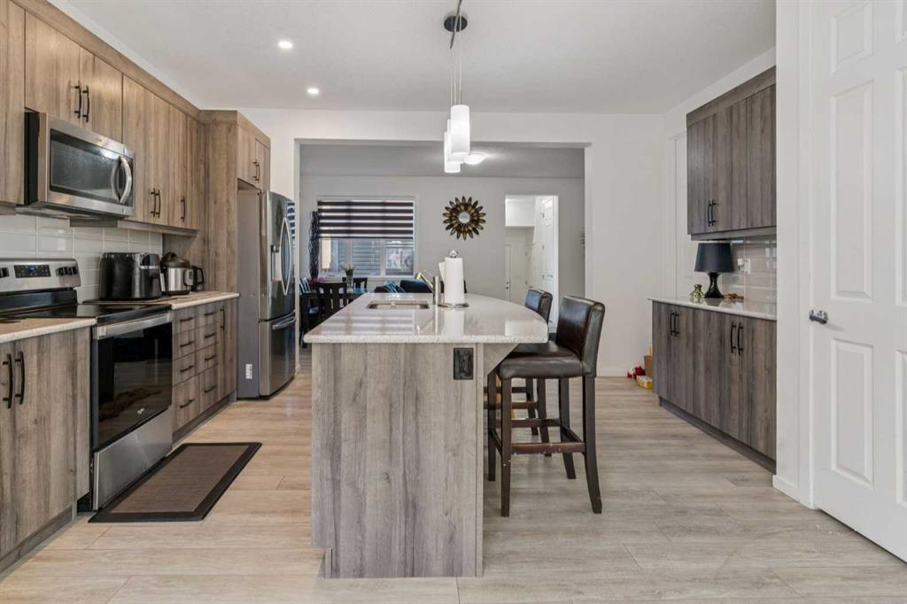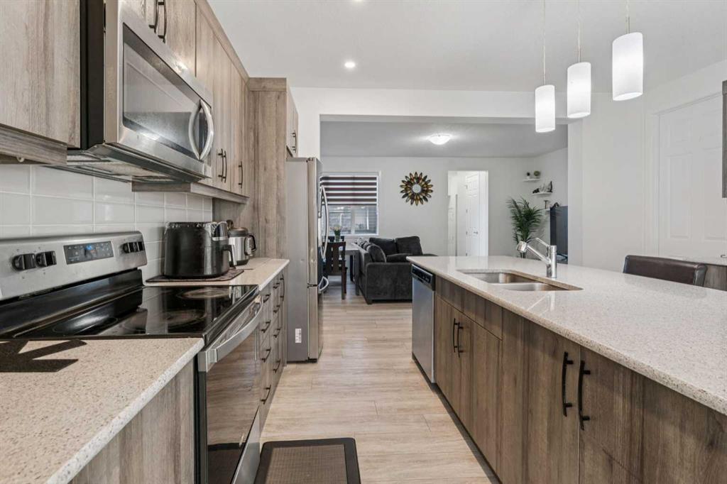 Stylish Duplex with Finished Walk-Up Basement in Carrington NW! Discover this beautifully maintained duplex in the sought-after community of Carrington NW. Where elegant design meets everyday convenience. Featuring 3+1 bedrooms, this home offers a perfect blend of style, comfort, and functionality. Step inside to find 9 knockdown ceilings, a bright open-concept main floor, and a spacious living and dining area ideal for entertaining. The chef-inspired kitchen is the heart of the home, showcasing custom soft-close cabinetry, quartz countertops, a large dining space, pantry, and premium appliances including a microwave and refrigerator — all designed to make cooking and gathering a joy. Upstairs, you’ll find three well-sized bedrooms, including an elegant primary suite complete with a walk-in closet and elegantly appointed ensuite. The convenient ample second-floor laundry makes daily living that much easier. Downstairs, the fully finished walk-up basement offers incredible flexibility — featuring a private suite with a spacious bedroom, modern bathroom, compact kitchen, and large family area — perfect for guests, extended family, or a mortgage helper. Enjoy the comfort of a finished, oversized rear attached garage, ideal for winter parking and extra storage. Located in Carrington NW, you’re just minutes from Stoney Trail, playgrounds, schools, shops, and everyday amenities — plus, only 15 minutes to the airport and 6 minutes to major shopping centers. This home has been lovingly cared for and possession is negotiable. Don’t miss your chance — book your private showing today and fall in love with your new home in Carrington!