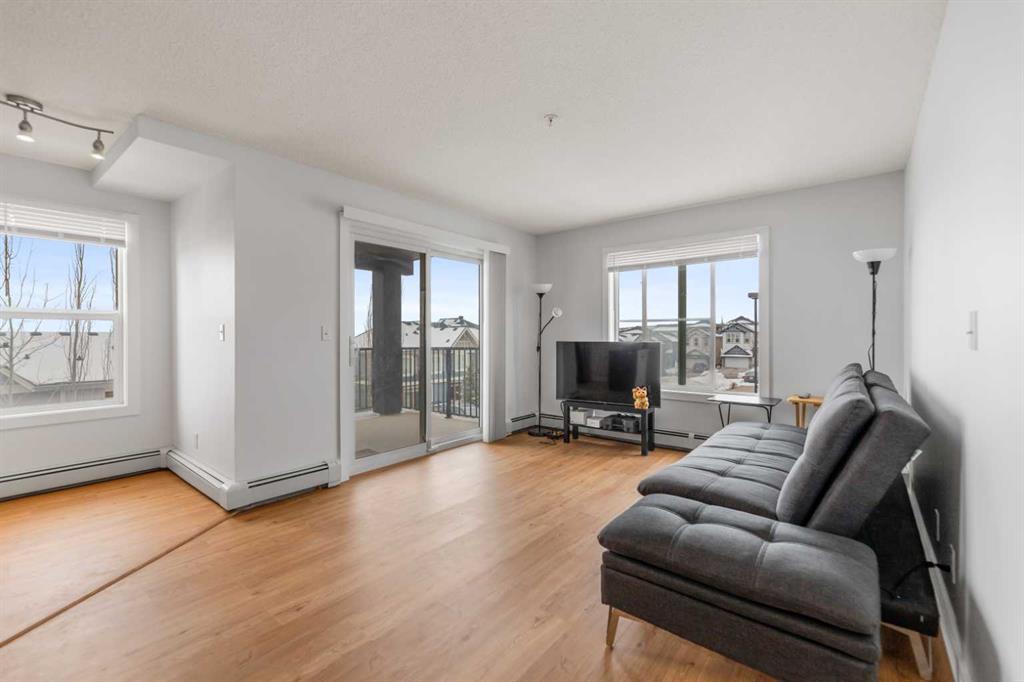 Welcome to this bright and spacious 2-bedroom, 2-bathroom corner unit in the highly sought-after community of Kincora. This well-designed home stands out with exceptional privacy and minimal shared walls. The open-concept layout seamlessly connects the living and dining areas, creating an inviting space for both everyday living and entertaining. Large windows allow for an abundance of natural light, enhancing the airy feel throughout. The thoughtfully designed floor plan features two generously sized bedrooms, including a primary suite with a walk-in closet and private 4-piece ensuite. A second full bathroom and in-suite laundry add to the overall convenience. Enjoy your private balcony—perfect for relaxing on warm summer days, complete with a natural gas hookup for your BBQ. Ideally located just minutes from major amenities including T&T Supermarket, Costco, Walmart, Co-op, Creekside Shopping Centre, and Beacon Hill Centre, along with parks, pathways, transit, and easy access to Stoney Trail. An excellent opportunity for first-time buyers, downsizers, or investors seeking comfort, privacy, and a prime location.