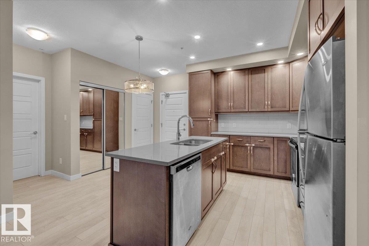 THESE VIEWS! They don't exist at this price or in a condo! Welcome to your OASIS, BACKING WATER, A WALKING TRAIL and POND SYSTEM for 2KM of peaceful trails in one of the BEST LOCATIONS in EDMONTON! Oh, and ITS WEST FACING! Natural light is no problem! SUNSETS ARE EPIC! UNDERGROUND PARKING, FRESH PAINT & professionally CLEANED. Come in to entry closet & SPACIOUS LAUNDRY ROOM! Kitchen is bigger than some house kitchens! WRAP AROUND cabinetry giving TONS OF PREP SPACE & a BUILT IN PANTRY, w a FULL SIZED QUARTZ ISLAND. Living room is SPACIOUS. QUARTZ continues in BOTH BATHROOMS, w an OVERSIZED ENSUITE counter and vanity, a HUGE SHOWER w built in bench, and MASSIVE WALK-IN CLOSET. Your view is ICONIC and the walking path is on the other side, so you maintain privacy in your outdoor space. Location wise, you’re at the back of the complex for extra peace, but at the same time, you are MINUTES AWAY from WHITEMUD, HENDAY, COSTCO, and 3 different shopping complexes! Building has a GYM, SOCIAL ROOM, & GUEST SUITE!