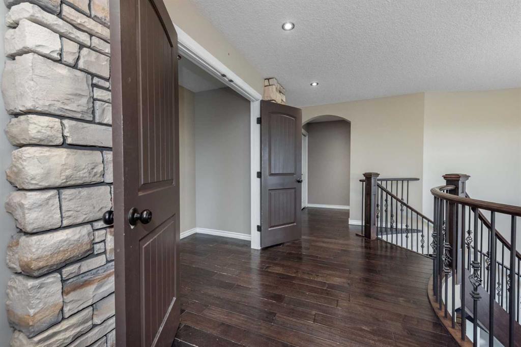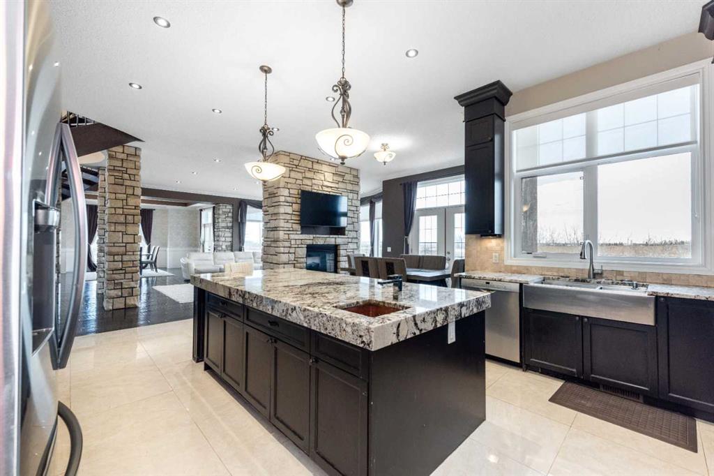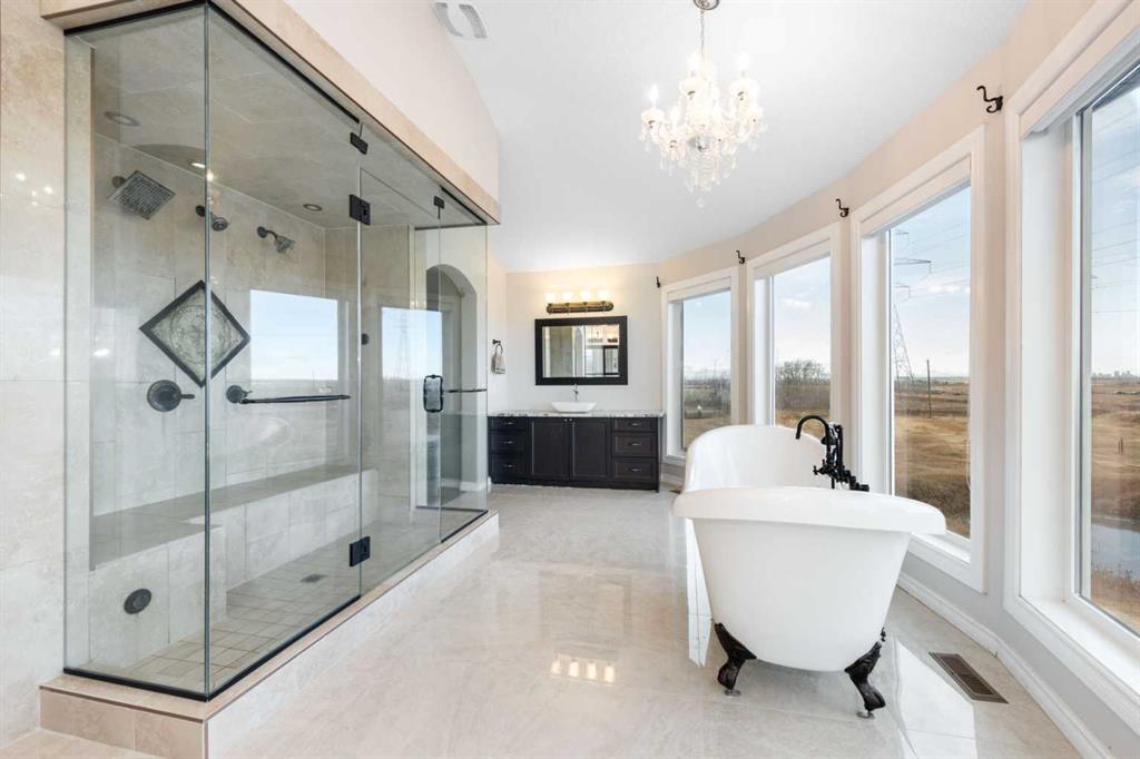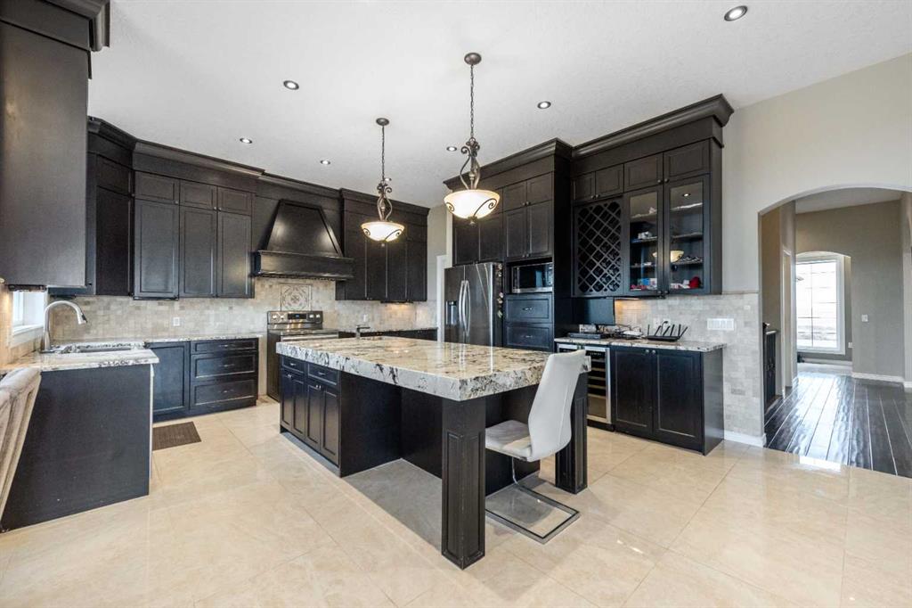 Welcome to this exceptional 4-acre estate offering breathtaking city and mountain views, a private gated driveway, and an unmatched blend of luxury and serenity—just 10 minutes east of Calgary. With over 4500 sq ft of beautifully designed living space across two levels, this custom home features a 4-car garage, walkout basement, and expansive indoor and outdoor areas ideal for both grand entertaining and everyday comfort. A dramatic double staircase and soaring open-to-below ceilings greet you in the impressive foyer, setting the stage for the home’s scale and elegance. The main level offers an open-concept design with rich hardwood flooring and large windows that frame peaceful landscape views. The chef’s kitchen is thoughtfully appointed with full-height cabinetry, stainless steel appliances, granite countertops, a hidden built-in range hood, wine cooler, and a built-in wine rack. A spacious centre island with bar seating and a bar sink adds both functionality and style. The walkthrough pantry flows directly into the mudroom and laundry room for exceptional convenience. The bright dining nook opens to a massive north-facing deck through French doors, creating seamless indoor-outdoor living. A formal dining room—also with French doors to the deck—adds versatility for hosting. The inviting living room features a double-sided gas fireplace shared with the kitchen, enhancing warmth and ambiance throughout the main floor. A main-level den provides an ideal workspace for professionals working from home. Upstairs, you’ll find three generous bedrooms and a large family room with lofted ceilings that elevate the home’s spacious feel. The primary suite is a true retreat, offering a private west-facing balcony with mountain views. The luxurious 5-piece ensuite includes a deep soaking tub set against a stunning window backdrop, a tiled steam shower with bench seating, dual vanities, and a private water closet. The custom walk-in closet provides exceptional storage and organization. Bedrooms 2 and 3 share a well-appointed 5-piece bathroom with dual sinks and a separate shower/tub and toilet area—ideal for busy families. The walkout basement is filled with natural light and is partially finished, including a recreation space, home theatre, gym, or additional bedrooms—designed to grow with your family’s needs. Located just minutes from Boulder Creek Golf Course, this extraordinary property combines peaceful country living with quick access to Calgary amenities. This is a truly remarkable estate home that must be seen to be fully appreciated.