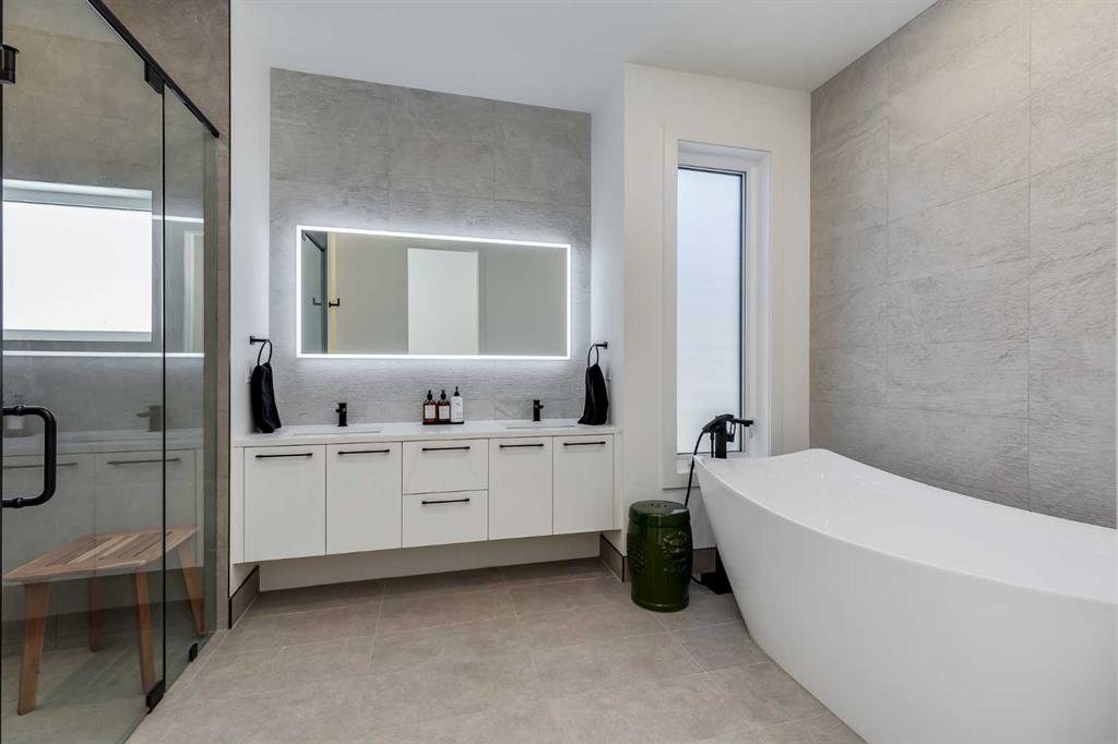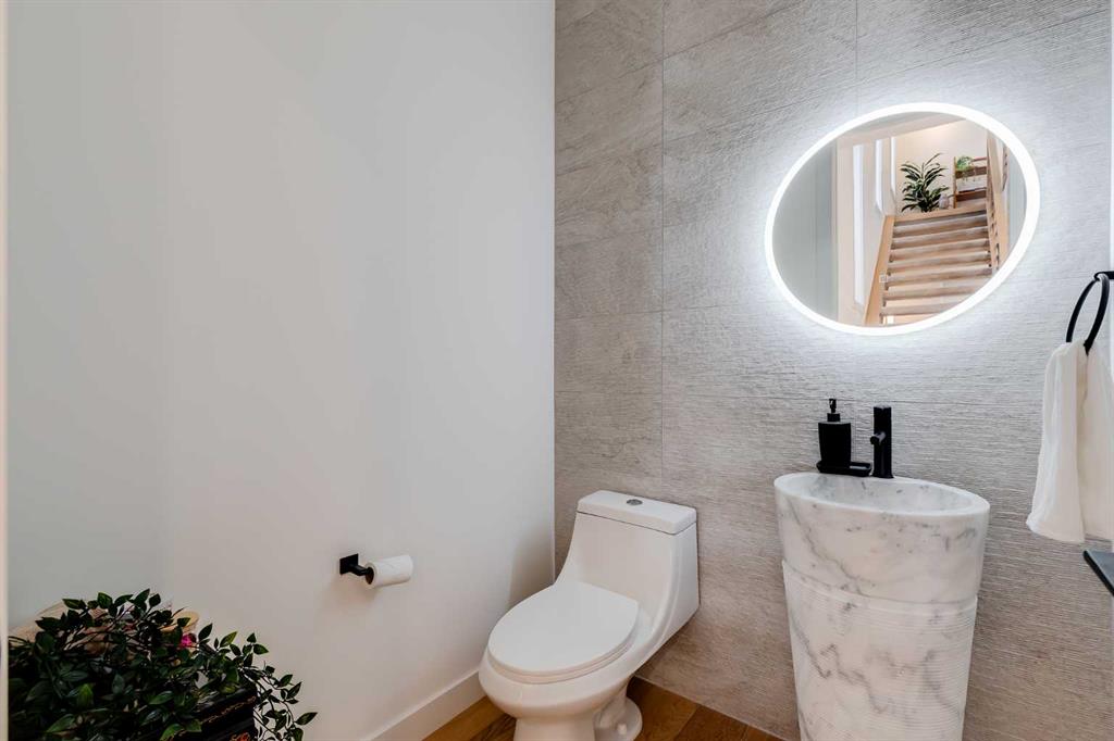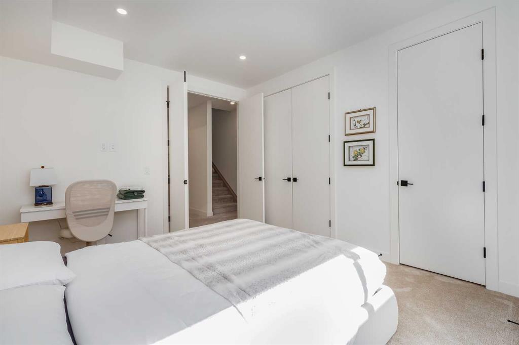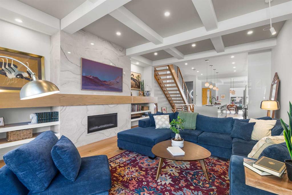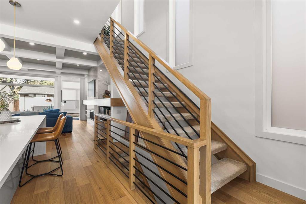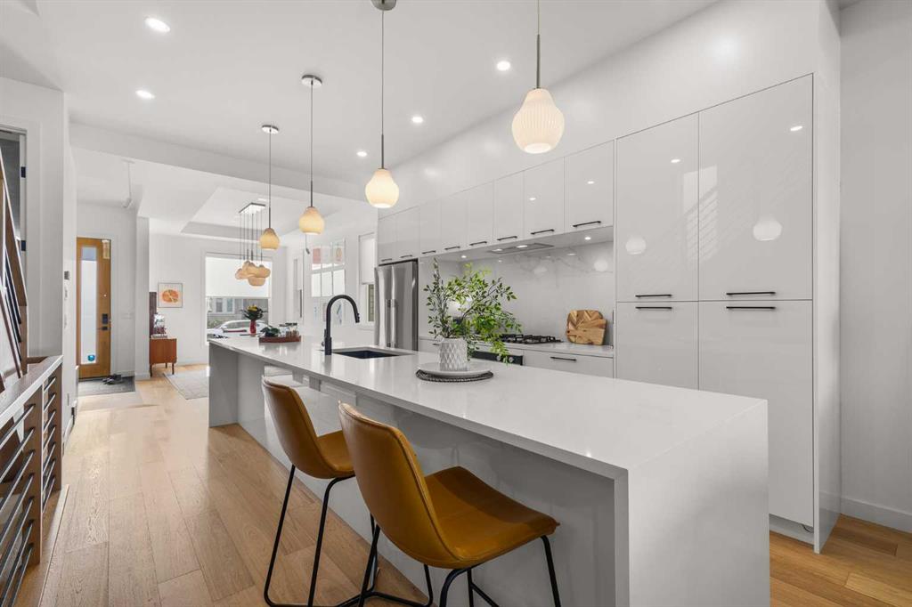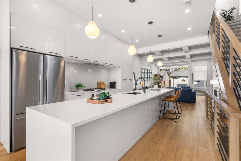 Located in the highly sought-after community of West Hillhurst, this exceptional two-storey home offers over 3,100 square feet of developed living area that blends refined luxury with timeless European-inspired design. Custom-built by Deanmark in 2023, every detail reflects superior craftsmanship and quality materials. With four bedrooms and three and a half bathrooms, this residence delivers both sophistication and functionality for modern family living.The inviting foyer sets the tone with tile flooring and a built-in bench, while wide-plank engineered hardwood extends seamlessly throughout the rest of the main level. Ten-foot ceilings and eight-foot solid core doors enhance the sense of height and elegance, while large windows fill the home with natural light. The open-concept layout connects the kitchen, dining, and living areas, creating an ideal setting for everyday living and entertaining alike. The kitchen is a showpiece, featuring sleek white cabinetry, quartz countertops, a massive waterfall island with seating, and premium Fisher & Paykel stainless steel appliances, including a gas cooktop. Ample storage and workspace make it as functional as it is beautiful. The adjacent dining area easily accommodates family gatherings, while the living room exudes warmth with its linear gas fireplace, tile surround, custom built-in display shelves, and coffered ceiling. A stylish two-piece powder room with a stone pedestal sink finishes the main floor. Upstairs, nine-foot ceilings and thoughtful design create a calm retreat. The primary suite is a luxurious escape, featuring soft carpeting, a spacious walk-in closet with custom shelving, and a spa-like ensuite with heated tile floors, dual sinks, a soaker tub, and an oversized shower. Two additional bedrooms, a four-piece bathroom, and a convenient laundry room round out the upper level. The fully developed basement features 9’4” ceilings, oversized windows, and a bright, open layout. A large recreation room with a sleek wet bar, complete with sink, beverage fridge, and wine display, creates an inviting space for entertaining. A guest bedroom, three-piece bathroom with steam shower, and dedicated storage add functionality. Outside, the backyard offers a concrete patio and grass area leading to a double detached garage with alley access. Hunter Douglas blinds and central air conditioning add year-round comfort. West Hillhurst is one of Calgary’s most desirable inner-city neighbourhoods, known for its blend of family-friendly charm and urban accessibility. You’re within walking distance to the vibrant shops, cafés, and restaurants of Kensington, offering an unmatched lifestyle. Families will appreciate being just a 15-minute walk from both Queen Elizabeth Schools. Nearby parks and the Bow River pathways provide endless opportunities to enjoy the outdoors, while commuting is effortless with easy access to major roadways and transit. Check out the 3D tour for a closer look!