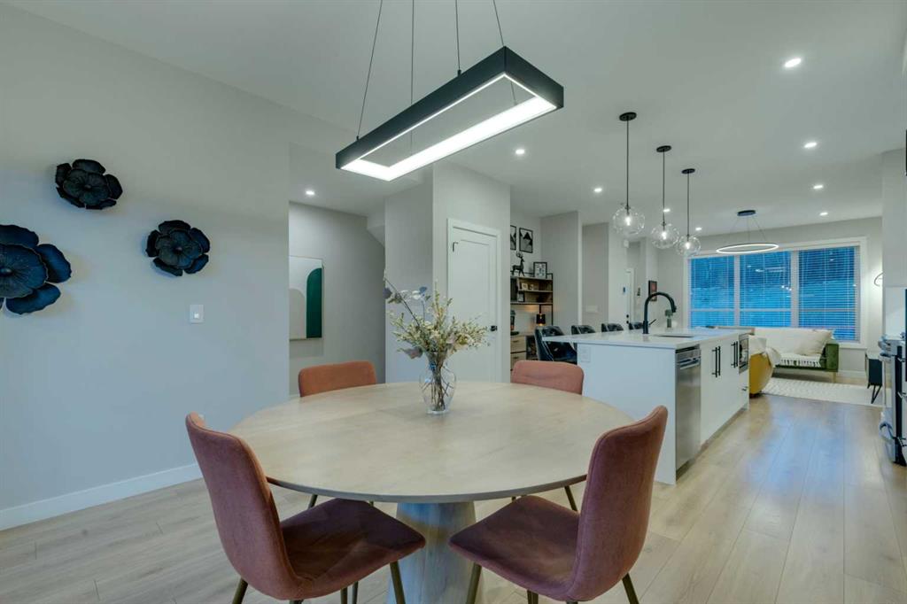 Live the Calgary dream in this stunning, luxury executive townhome in the prestigious Springbank Hill. Enjoy the lifestyle; only 15 minutes to downtown and a mere 55 minutes to beautiful Canmore. Whether it's an efficient morning commute or a spontaneous mountain escape, this location delivers it all. This beautifully designed 3-bedroom townhome blends modern style with warm, designer inspired touches throughout. The focal brick facade leads to the welcoming entry with a bright foyer, mirrored closet, and clean white tile, before opening into a spacious main floor with soft, light luxury hardwood laminate flooring and sleek black accents. 9ft flat panel ceilings with recessed led lighting allow for ample front to back natural light. The living room sits to the left, while the central kitchen offers white cabinetry, under-cabinet lighting, a long flush top granite island with seating for four, a black modern sink, pendant lighting, gas range, and a built-in panelled fridge for a seamless designer look. To the right, the dining area features contemporary LED lighting and patio doors leading to a balcony with stunning sunset skies and a peaceful treed view to the side. A discrete, stylish half bath finishes the main level and provides lower access to the double width, TRIPLE attached garage(tandem depth on one side). Upstairs, the primary bedroom captures beautiful light and mountain views above the rooftops, with a gorgeous tray ceiling, a walk-in closet and a modern ensuite featuring white finishes, black fixtures, and a fully tiled walk-in shower. Two additional bedrooms with peaked ceilings & full windows offer versatility, including a charming nursery with a soft woodland mural, and the other with a flexible Murphy bed, all centered with a lovely 4-piece bathroom, upper laundry, and space in the hallway for an accent table or open tech area. Offering central A/C, an incredible accessible location near the C-Train station(s), and many desirable schools nearby, along with the excellent premier shops in Aspen Landing, this home offers enduring value and ideal location. With its thoughtful design, absolutely immaculate condition, and twilight views that make every evening feel special, this home delivers a perfect blend of comfort, style, and convenience. Even convenient shopping is nearby. This like-new townhome offers a fresh, modern lifestyle with a welcoming sense of personality from the moment you step through the front door. Offered in pristine move-in ready condition with flexible possession. Make sure to watch the video! Welcome home!
