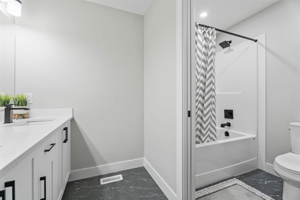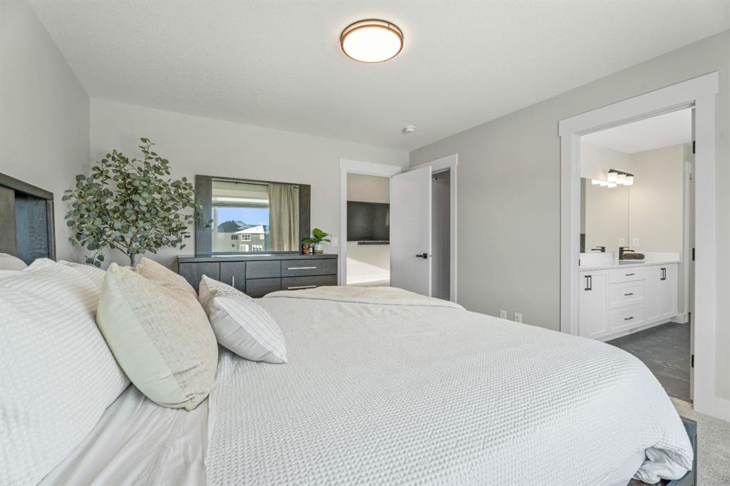 OPEN HOUSE SAT DECEMBER 13 NOON-2:30 P.M. WELCOME TO 235 CHELSEA PARK, CHESTERMERE Nestled in family-friendly Chelsea Park, this stunning Anthem built home backs onto beautiful park space and a serene pond—your private oasis with no rear neighbors. Close to amenities and a future school, you'll enjoy the perfect balance of tranquility and convenience. The contemporary design with striking mountain blue siding, stone accents, and triple attached garage sets this home apart. Step through the bright, wide entry and discover over $108,000 in premium builder upgrades. Nine-foot ceilings on the main floor create an airy feel. Rich grey walls contrast beautifully with crisp white trim and luxury vinyl plank flooring. A private den with elegant French doors offers the perfect home office. The open-concept kitchen, dining room, and great room are designed for today's lifestyle. The show-stopping gourmet kitchen features a massive waterfall-edge island with brown cabinetry complemented by crisp white upper cabinets. The chef will love the gas cooktop, upgraded built-in wall oven and microwave in a stunning tower cabinet, French door fridge with WiFi, and large walk-in pantry. Custom tile backsplash extends to the ceiling, complementing beautiful quartz countertops. All black hardware, fixtures, and lighting add that executive touch. The spacious dining room showcases three large picture windows flooding the space with natural light and flows into the great room with a linear fireplace featuring floor-to-ceiling tile and dramatic black mantle. Step through to your extended deck with spectacular pond and park views. A stairway leads to the backyard and generous concrete patio—perfect for entertaining. Multiple gas line hookups mean you're ready for outdoor cooking year-round. Upstairs find your large primary bedroom—perfect for a king-sized bed—with generous walk-in closet and spa-inspired five-piece ensuite featuring heated floors, fully tiled walk-in shower with frameless glass, and soaker tub—all with executive black fixtures and quartz counters. Two additional generous bedrooms with walk-in closets share a five-piece bathroom. A vaulted bonus room with oversized picture window and upper-level laundry complete this floor. The walkout basement with 9-foot ceilings is roughed-in—bathroom plumbing ready, electrical outlets in place. The triple-insulated garage with gas rough-in offers workspace potential. Every detail matters: triple-pane windows, custom blind package, upgraded stacked kitchen cabinetry, executive black plumbing and lighting, luxury flooring, and quartz countertops throughout. More than just a home, this is where memories are made. Check out our virtual tour—you will not be disappointed. Welcome home.