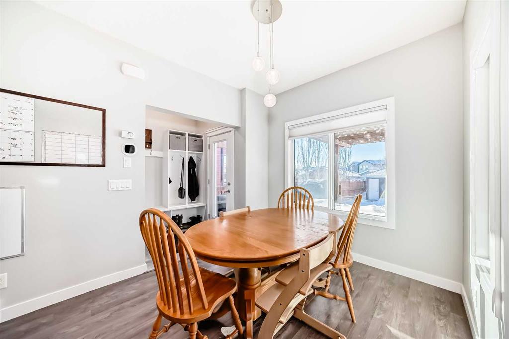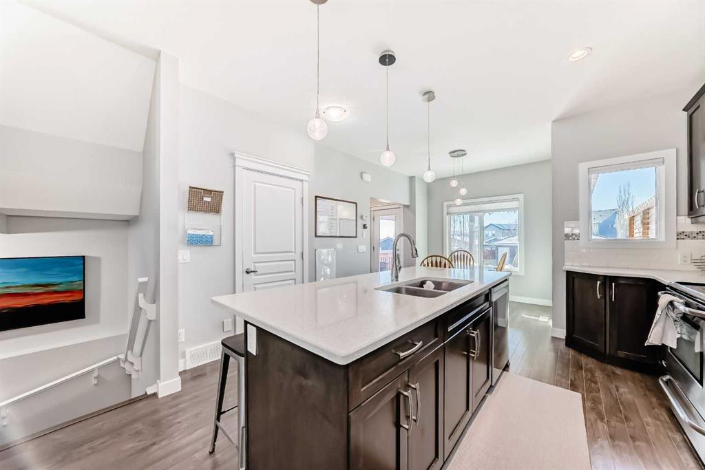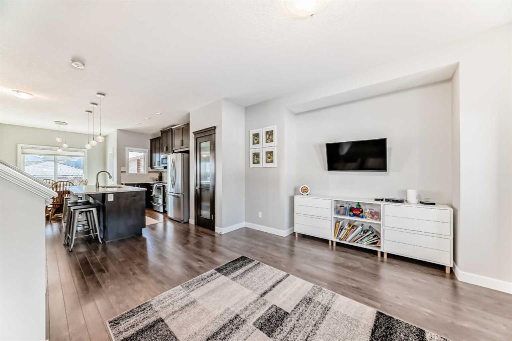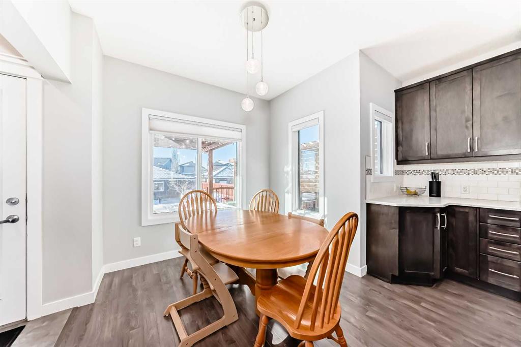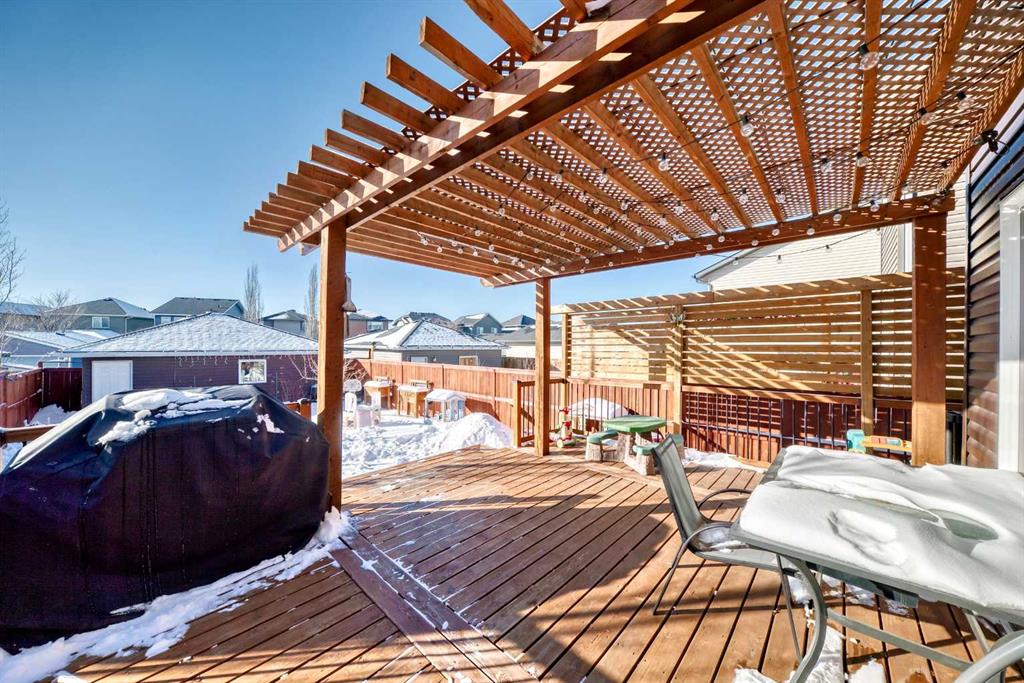 Perfect home for first time owners or a growing family, 2015 vintage 3+ bedroom 2 storey in Airdrie's district of Ravenswood. Lovely curb appeal with covered veranda. Upgraded wood laminate flooring on main floor with tiled front and rear entries. Large and spacious kitchen with 8 foot working island, separate pantry, 9 ft ceilings and tall cabinetry, dining room nook over looks rear yard, spacious great room expanding into flex space before kithen area, main floor laundry room with storage space. 3 Bedroom upstairs, 4 pce ensuite plus 4 pce for other bedrooms, All bedrooms have walk-in closets. Huge lot (142 ft+ long lot with sunny western exposure). Rear yard b. house and garage is about 65 ft long and 30 ft wide., lots of room for children or adults to play. Huge 16 ft X 18 ft wood deck with pergola, small decorative rocked side yards for low maintenance. Completely fenced lot. Basement fully dev'd with 9 foot ceilings, raised floors with laminate flooring, an office/bedroom, large recreation room, large storage room. High efficient furnace, A/C, over sized water heater for future teenagers. Oversized double garage 24 ft wide and 22 ft deep. Large lots are rare without backing onto busy locations.