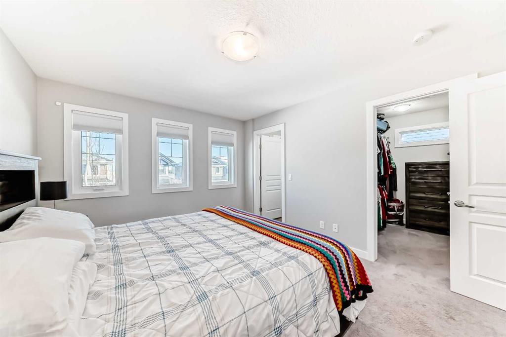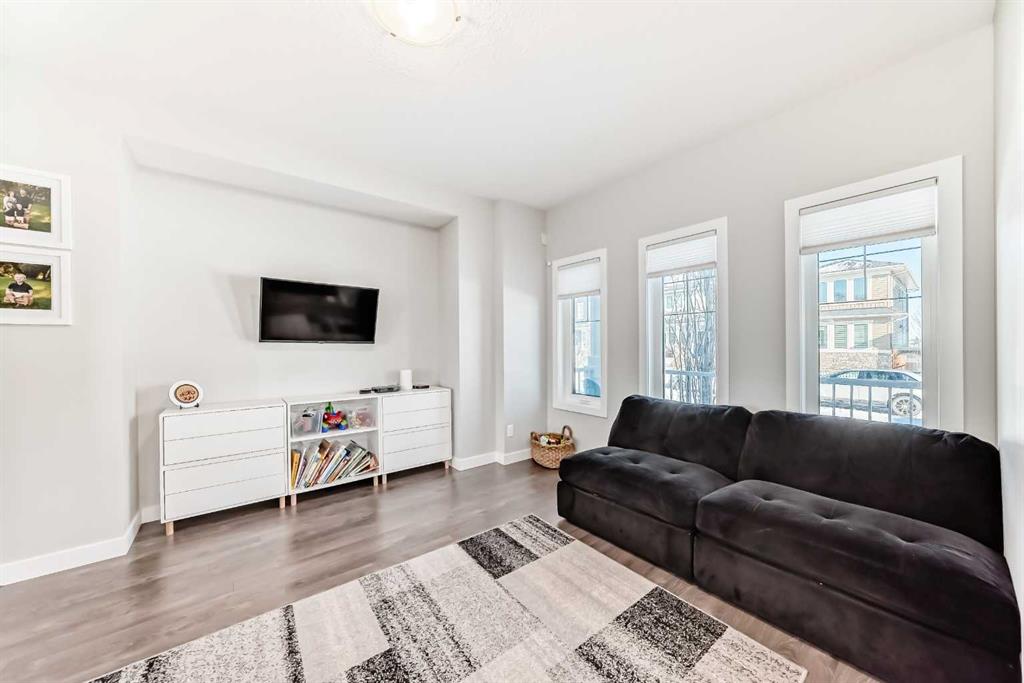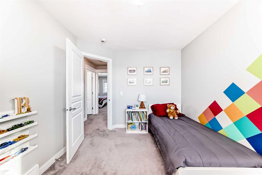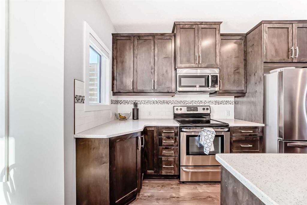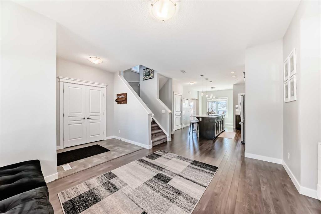 Perfect home for first time owners or a growing family, 2015 vintage 3+ bedroom 2 storey in Airdrie's district of Ravenswood. Lovely curb appeal with covered veranda. Upgraded wood laminate flooring on main floor with tiled front and rear entries. Large and spacious kitchen with 8 foot working island, separate pantry, 9 ft ceilings and tall cabinetry, dining room nook over looks rear yard, spacious great room expanding into flex space before kithen area, main floor laundry room with storage space. 3 Bedroom upstairs, 4 pce ensuite plus 4 pce for other bedrooms, All bedrooms have walk-in closets. Huge lot (142 ft+ long lot with sunny western exposure). Rear yard b. house and garage is about 65 ft long and 30 ft wide., lots of room for children or adults to play. Huge 16 ft X 18 ft wood deck with pergola, small decorative rocked side yards for low maintenance. Completely fenced lot. Basement fully dev'd with 9 foot ceilings, raised floors with laminate flooring, an office/bedroom, large recreation room, large storage room. High efficient furnace, A/C, over sized water heater for future teenagers. Oversized double garage 24 ft wide and 22 ft deep. Large lots are rare without backing onto busy locations.