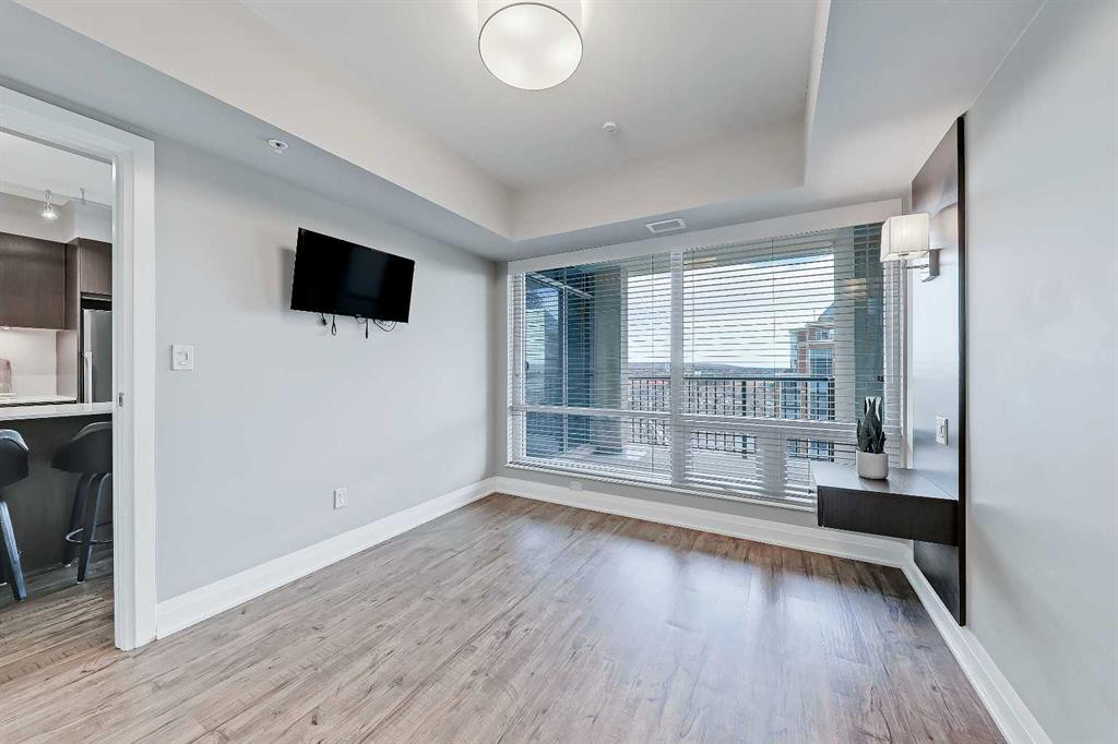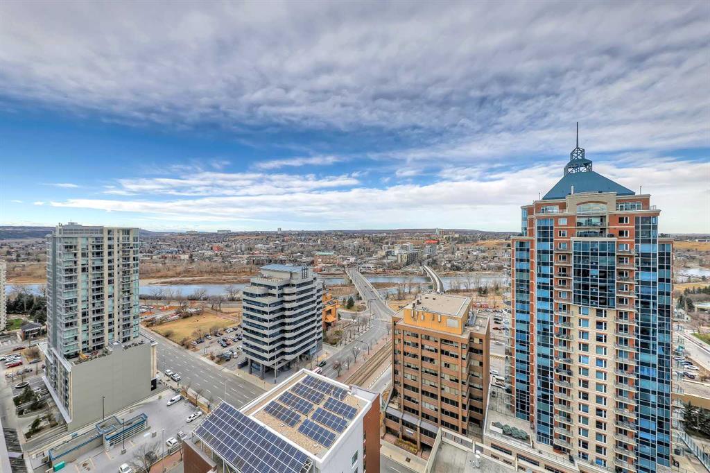 *VISIT MULTIMEDIA LINK FOR FULL DETAILS, INCLUDING IMMERSIVE 3D TOUR & FLOORPLANS!* This bright NORTH-facing 1-bed + den unit with stunning PANORAMIC RIVER VIEWS from the 24th floor in the upscale Vogue building is a must-see! There are only 4 upgraded floors in the Vogue building, which were specially customized for Bedouin Suites, and this is one of them! EXCLUSIVE BEDOUIN FEATURES include upgraded hallways and common areas, as well as INCREDIBLE UNIT UPGRADES like custom kitchen islands with bar seating, upgraded appliances & lighting including dimmers throughout, custom bedroom panelling including built-in side tables with convenience plugs, upgraded bathrooms with tile wainscoting and glass shower doors, built-in walnut entertainment units, a Smart Sensor energy management system for the eco-minded buyer and MORE! This customized ‘VARSITY’ floorplan also had a kitchen wall removed for improved flow and natural light, and WOW, does it look good! This condo presents modern living at its finest, including an open-concept layout filled with natural light through ample floor-to-ceiling windows, complemented by luxury vinyl plank flooring adorning the main living spaces. The modern kitchen boasts wood-grain cabinets with modern hardware and under-cabinet lighting, a specially designed central island with quartz counters, a tile backsplash, a dual-basin undermount sink, and upgraded stainless steel appliances, including a chimney-style hood fan. The open main living area features a built-in walnut entertainment unit with a wall-mount TV included and access to a large balcony with a gas line for a BBQ and panoramic views of the Bow River. The bedroom features custom wall panelling with built-in side tables, wall sconce lighting and a convenient receptacle with a USB port, plus an included wall-mounted TV. A large walkthrough closet with built-in organizers and a stacked laundry leads to the 4-pc bathroom complete with occupancy-sensored lights, quartz countertops, tile wainscoting, an undermount sink with modern faucet, tile backsplash, modern vanity with storage, tile floors, and a large tub/shower combo with full height tile and an upgraded glass door. Additionally, a sizable den makes the perfect home office or flexible space. VOGUE is a high-end building with a ton of amenities, including UNDERGROUND HEATED PARKING, central A/C, an elegant formal lobby, full-time concierge, gym, billiards, a large party room with a kitchen, a yoga studio, a Sky Lounge on the 36th floor, and multiple rooftop terraces. Surrounded by parks, transit, the LRT, shopping & more, & within walking distance to the downtown core & all Kensington shops & services – this location offers the best urban lifestyle in the Downtown Commercial Core.
