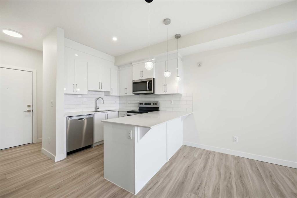 TOP FLOOR/CORNER UNIT/ BEAUTIFUL VIEWS FROM UNIT/2 BEDROOM/1 BATH/BALCONY. Discover modern living in this brand-new, never-occupied 2-bedroom, 1-bathroom condominium in the highly desirable community of Skyview Ranch NE Calgary Offering 656 of living space (Included Balcony) & immediate possession, this beautifully finished unit combines style, functionality, and convenience in one exceptional package. Key location features- WALKING DISTANCE TO SCHOOL, SHOPPING, PARK & more. Step inside to find a bright and airy open layout enhanced by 9-foot ceilings and oversized windows that allow natural light to pour in. The contemporary design is highlighted by wide-plank luxury vinyl flooring and elegant quartz surfaces throughout, creating a clean and upscale aesthetic. The kitchen is thoughtfully upgraded with stainless steel appliances, quartz countertops, soft-close cabinets, a generous PANTRY, and a convenient BREAKFAST ISLAND perfect for dining, meal prep, or casual entertaining. The kitchen flows effortlessly into the dining and living areas, providing a comfortable and welcoming space for both daily living and hosting guests. Two well-sized bedrooms offer flexibility for a home office, guest room, or roommate setup. The stylish 4-piece bathroom features modern finishes and quartz counters for a polished look. Additional features include in-suite laundry and upgraded window coverings for added comfort and privacy. Enjoy outdoor relaxation on the spacious private balcony complete with a gas line for BBQs—ideal for summer evenings. This unit also includes TITLED UNDERGROUND PARKING, a titled storage locker, and secure bike storage for added convenience. Located in a newly built complex, this property offers low-maintenance living close to shopping, schools, transit, major roadways including Stoney Trail, and Calgary International AIRPORT. Perfect for first-time buyers, young professionals, downsizers, or investors looking for a turnkey opportunity in a growing neighborhood. Move in right away or choose a flexible possession timeline to suit your needs. An excellent opportunity to own in one of Calgary’s most dynamic communities. Call your favorite realtor to book showings.