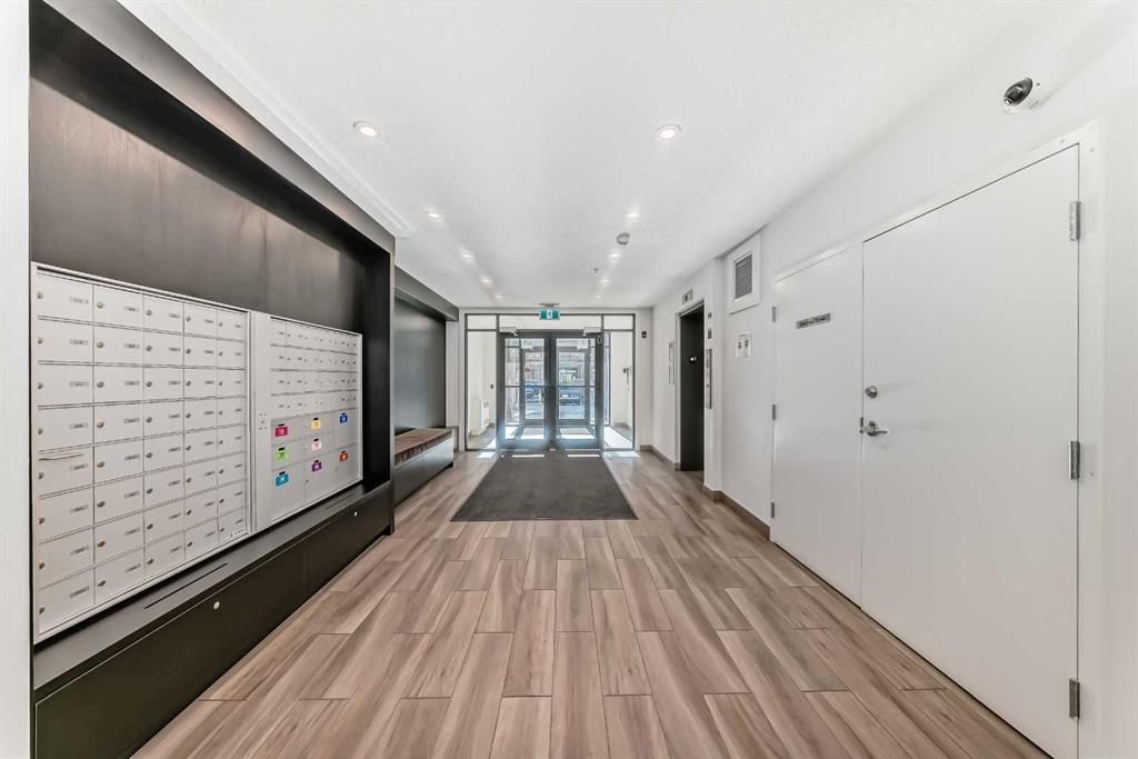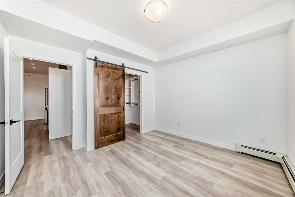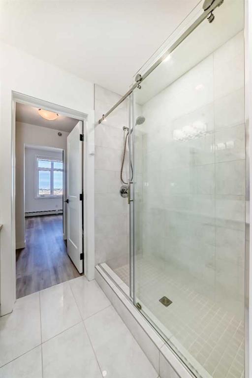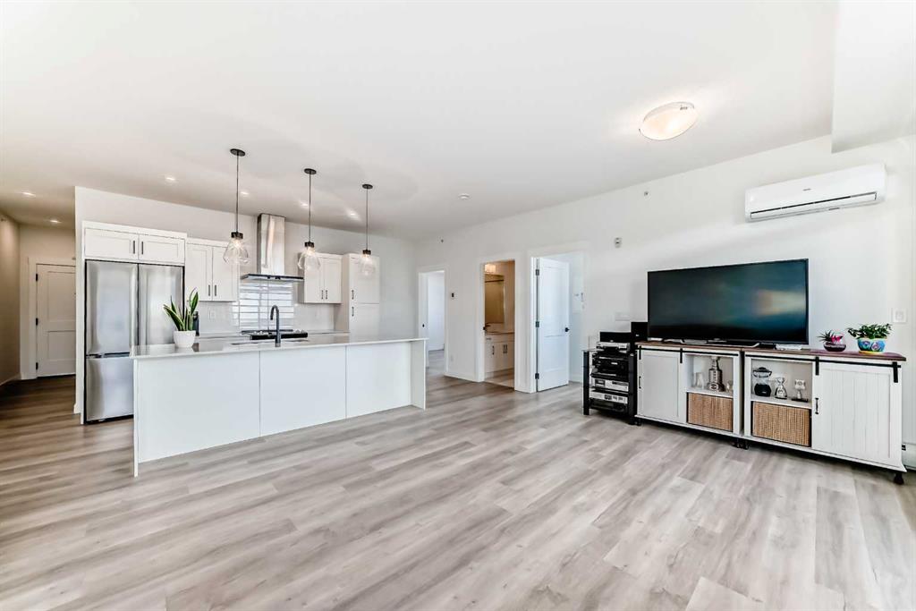 Welcome to this beautiful upgraded apartment condo unit with 2 bedrooms, 2 full baths on the top floor corner unit in the vibrant community of Seton SE area. The open concept floor plan features 9-foot ceilings, insuite laundry room with upgraded laundry doors and full side stainless steel washer & dryer, luxury vinyl plank floorings all over for easy mainternance & style, large windows offering plenty natural lights throughout. Modern white finished kitchen with high end kitchen shaker cabinetry package and soft-close doors and drawers, good size pot drawers. Upgraded stainless steel appliances and chimney style range-hood, stunning Pendant lighting and huge extended central island with Quartz countertops is perfect for preparing meals or hosting family gatherings overlooking to a spacious living room/dining room combine offering a wall-mounted air conditioner unit to keep you comfortable during hot summer days, you also have patio door step out on to your private big balcony with a gas-line for BBQ and a glimpse of the surrounding community. The bedrooms are separate by a spacious bathroom for additional privacy. The primary bedroom is a spacious retreat with a good size walkthrough closet made by Calgary California Closets company offers abundant storage for all clothing & accessories and you also have a good size 4-pc stand shower ensuite with full height tiles, ceramic tile floorings & backsplash, Quartz countertop on dual sinks and a elegant barn door to separate the primary bedroom and walkthrough closet. This unit is measured at 971 sqft by the Builder floor plan. It also comes with a fresh air in-take system, one titled underground heated parking stall and one good size assigned storage cage, both of these are located close to the elevator and stairs. This condo complex is conveniently located within walking distance to transit, HOA, the Real Candian Superstore, Save on Foods, Cinemas, Tim Hortons, various restaurants and Pubs, the South Health Campus, the largest YMCA, Library, Schools, playground, dog park and future LRT Green line. Easy access to Deerfoot Trail, Stoney Trail and to the rest of the city. This home shows better than new and priced to sell. Quick possession negotiable. Don't miss out on this chance to make this property your own!