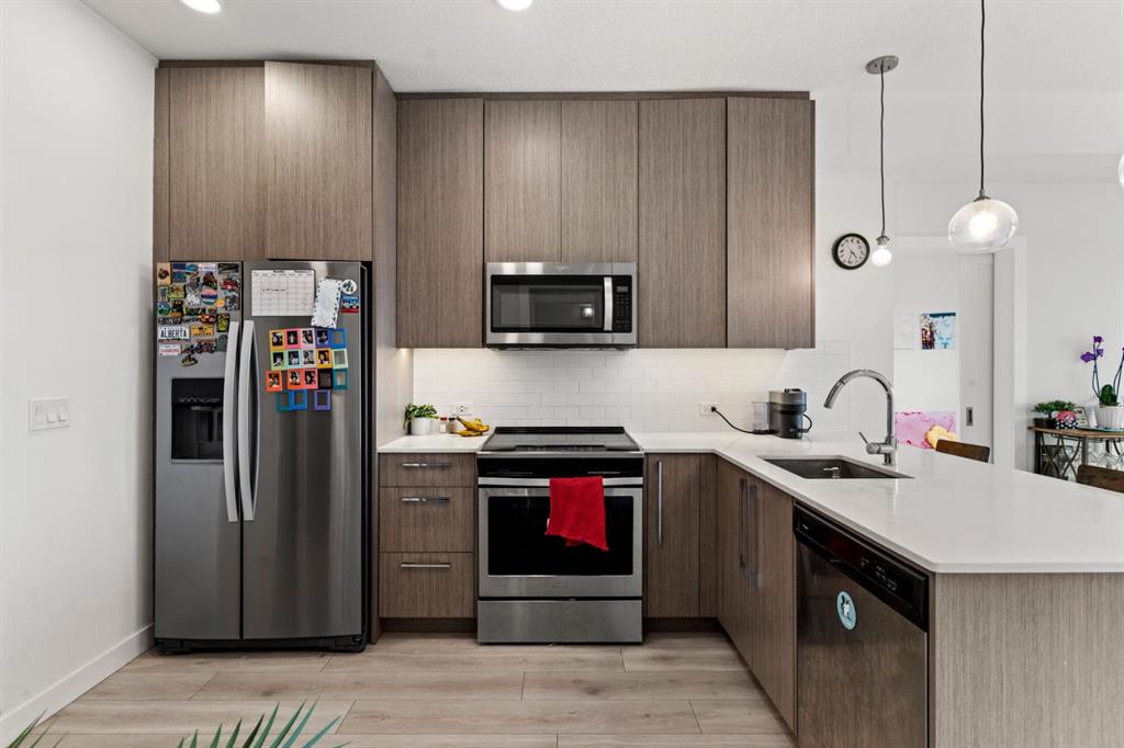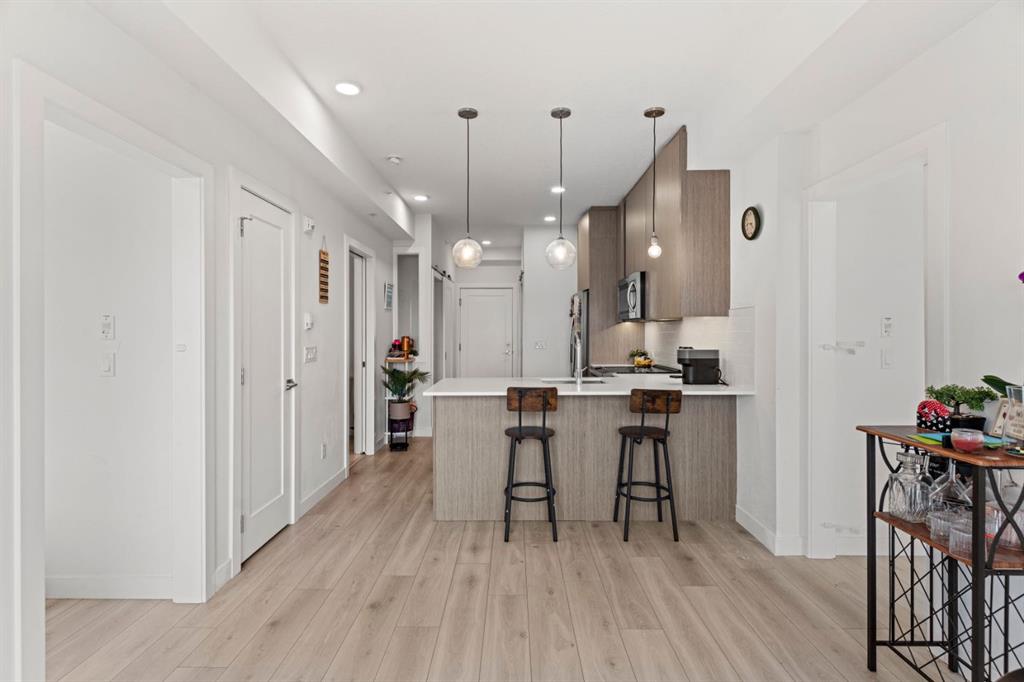 Welcome to Top-Floor Living in the Vibrant Community of Cornerstone Discover this bright and beautifully positioned corner unit offering 680 sq ft of thoughtfully designed living space. Located on the top floor, this 3-bedroom, 1.5 bathroom home offers enhanced privacy, quiet surroundings, and abundant natural light throughout the day. The open-concept layout seamlessly connects the kitchen, dining, and living areas—creating a functional space ideal for both everyday living and entertaining. Large windows on multiple sides elevate the home’s airy feel, a key advantage of its desirable corner positioning. The kitchen is well-appointed with modern finishes and ample cabinetry, flowing effortlessly into the main living area. The primary bedroom features a private ensuite, while two additional bedrooms offer flexibility for family, guests, or a home office setup. A second full bathroom adds everyday convenience. Perfectly situated in Cornerstone, one of Calgary’s fastest-growing communities, this home offers close proximity to parks, walking paths, and shopping, as well as easy access to major routes. Whether you're a first-time buyer, an investor, or a downsizer, this top-floor corner unit delivers exceptional value, functionality, and a lifestyle. Don’t miss your opportunity, book your private showing today.