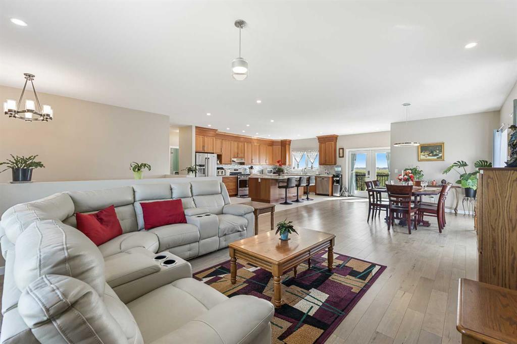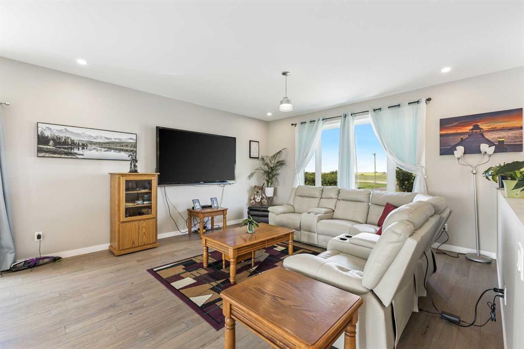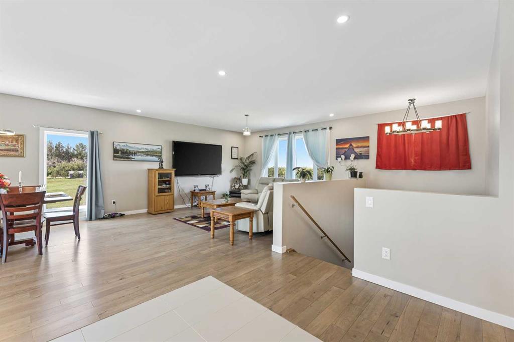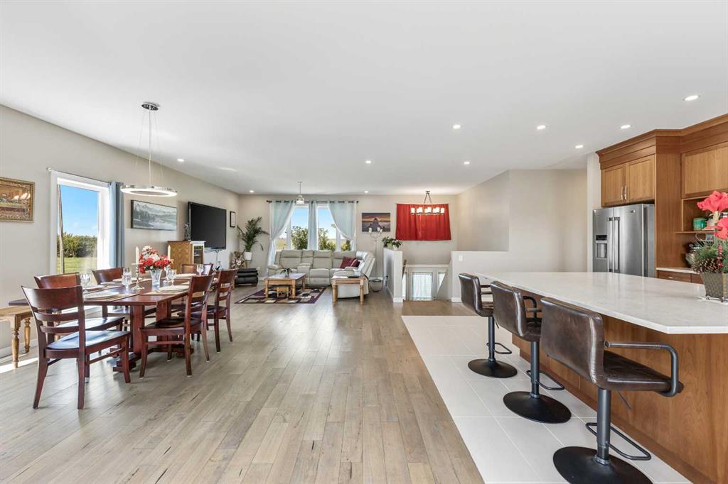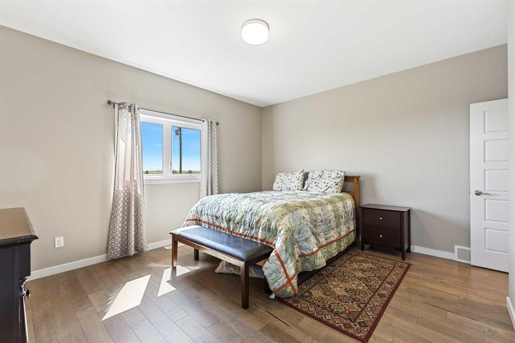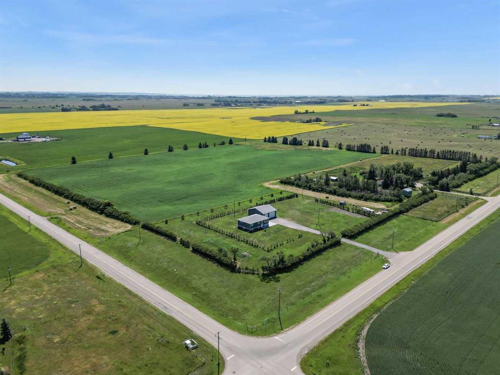 **Welcome to your spacious acreage just minutes from Strathmore!** Enjoy the perfect balance of country serenity and city convenience with quick access to all amenities and an easy commute to Calgary via Highway 1. Set on 5 acres with paved access and no gravel roads, this impressive property offers breathtaking west-facing mountain views on clear days. The well designed, air-conditioned bi-level home offers over 3,760 sq. ft of developed living space, featuring five bedrooms (plus two potential rooms you could convert to extra bedrooms) and three full bathrooms. The primary suite is a true retreat with a large walk-in closet and a beautifully appointed ensuite with dual vanities. Recent upgrades include hardwood floors and a custom gourmet kitchen with quartz countertops, ample cabinetry, and a large island—ideal for entertaining. The bright dining and living areas are framed by west-facing windows that capture stunning sunsets. The fully developed basement boasts in-floor heating, and includes a large family room, three additional bedrooms, a full bathroom, a laundry room, and a versatile flex/storage space. The home is equipped with triple-glazed windows, Hardie board siding, a Dura Deck, two sump pumps, a boiler, a forced air system, and in-floor heating throughout. Central air conditioning keeps the home comfortable year-round. Outside, the 45' x 40' heated shop is a showstopper. It includes 220V power, 12-foot and 18-foot doors, and space to accommodate up to nine vehicles, making it perfect for car enthusiasts, contractors, or hobbyists. This is more than just a home—it's a lifestyle. Schedule your private viewing with your favourite real estate professional today.
