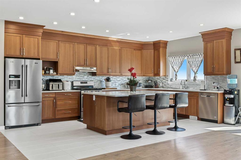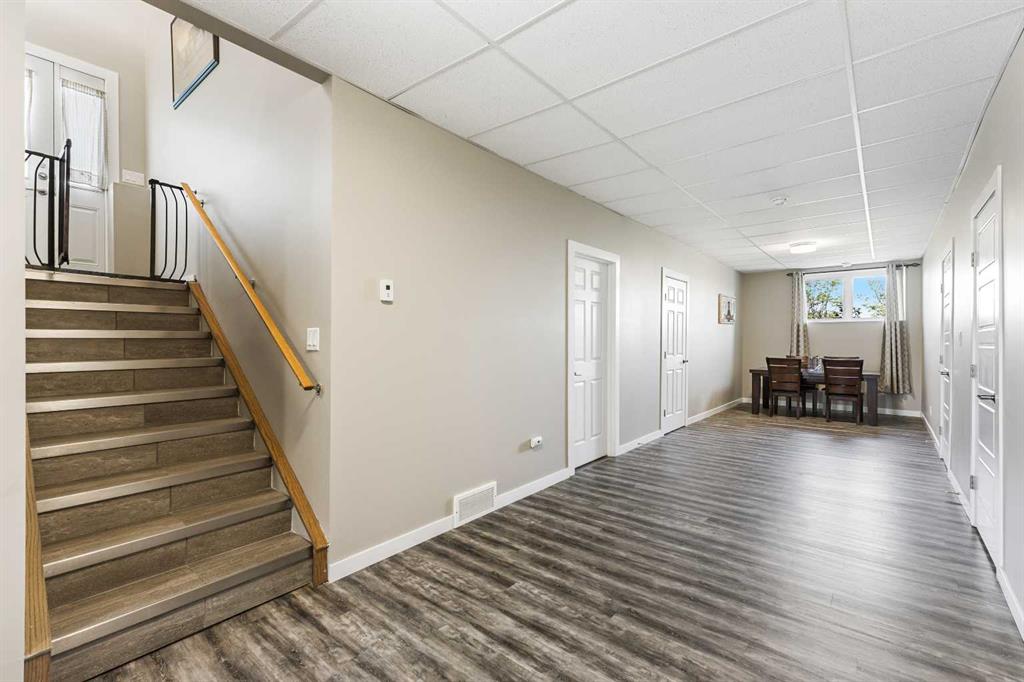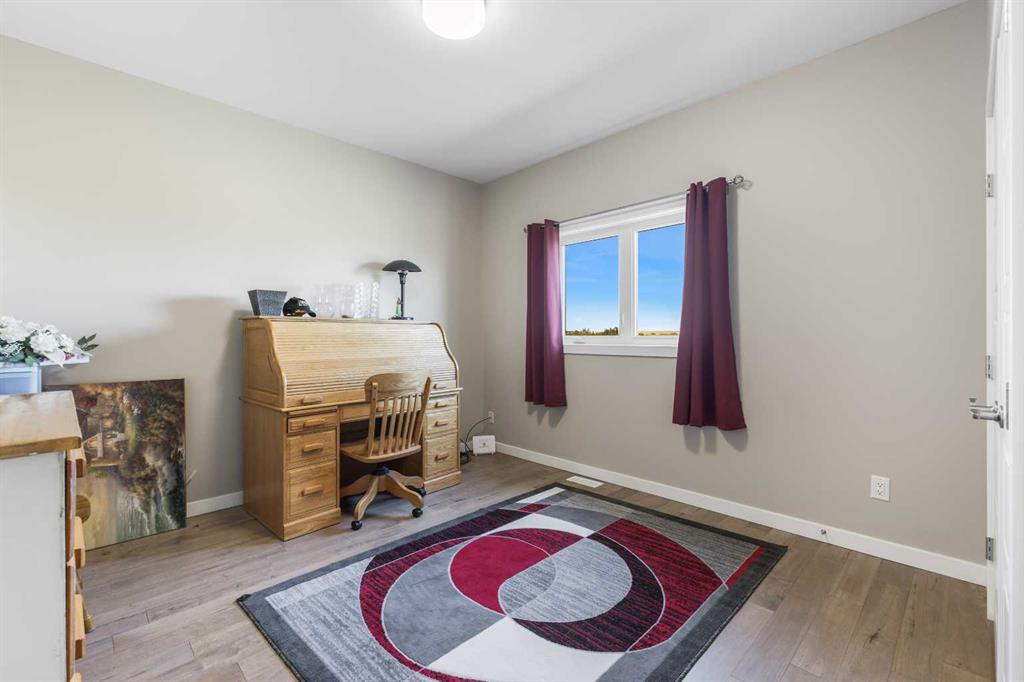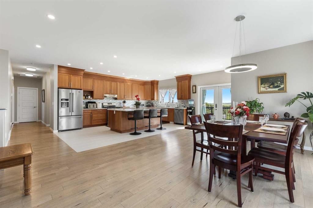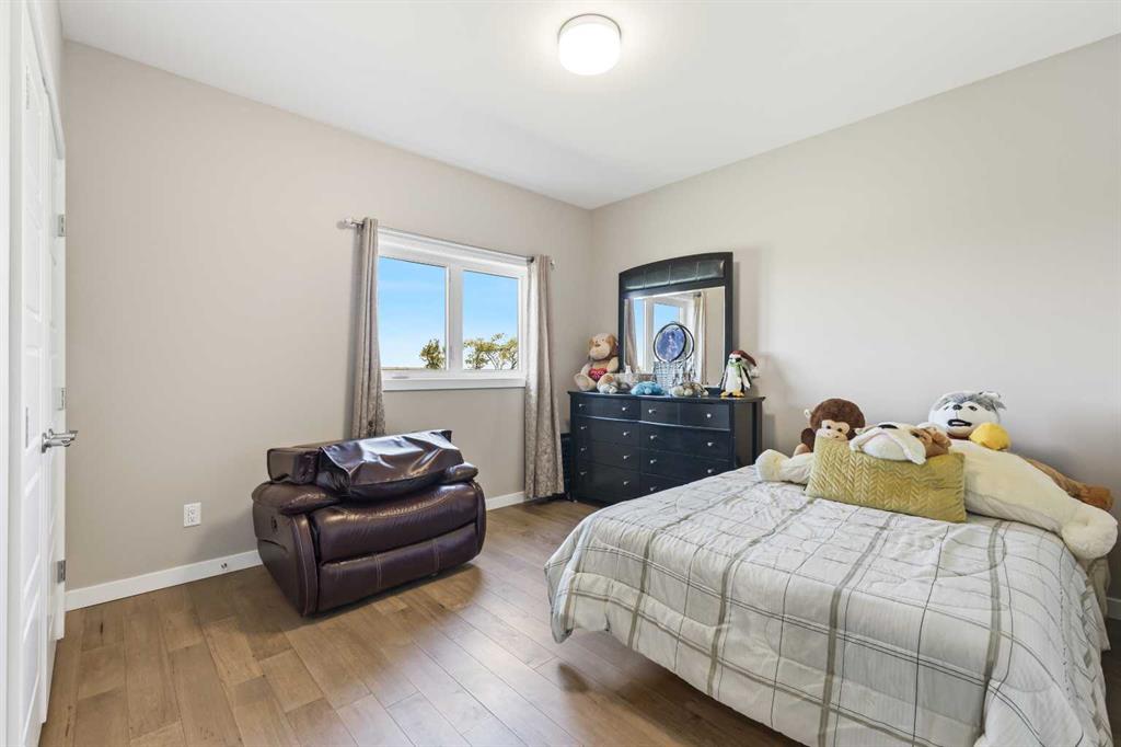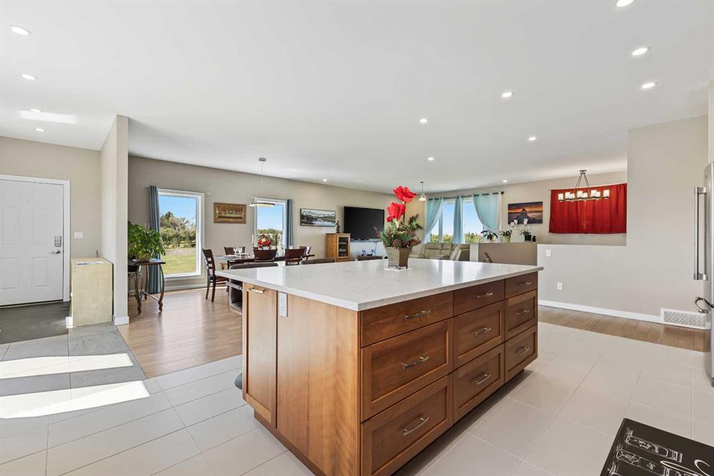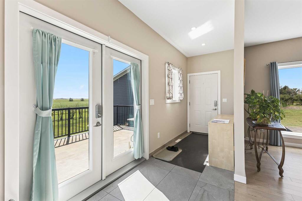 **Welcome to your spacious acreage just minutes from Strathmore!** Enjoy the perfect balance of country serenity and city convenience with quick access to all amenities and an easy commute to Calgary via Highway 1. Set on 5 acres with paved access and no gravel roads, this impressive property offers breathtaking west-facing mountain views on clear days. The well designed, air-conditioned bi-level home offers over 3,760 sq. ft of developed living space, featuring five bedrooms (plus two potential rooms you could convert to extra bedrooms) and three full bathrooms. The primary suite is a true retreat with a large walk-in closet and a beautifully appointed ensuite with dual vanities. Recent upgrades include hardwood floors and a custom gourmet kitchen with quartz countertops, ample cabinetry, and a large island—ideal for entertaining. The bright dining and living areas are framed by west-facing windows that capture stunning sunsets. The fully developed basement boasts in-floor heating, and includes a large family room, three additional bedrooms, a full bathroom, a laundry room, and a versatile flex/storage space. The home is equipped with triple-glazed windows, Hardie board siding, a Dura Deck, two sump pumps, a boiler, a forced air system, and in-floor heating throughout. Central air conditioning keeps the home comfortable year-round. Outside, the 45' x 40' heated shop is a showstopper. It includes 220V power, 12-foot and 18-foot doors, and space to accommodate up to nine vehicles, making it perfect for car enthusiasts, contractors, or hobbyists. This is more than just a home—it's a lifestyle. Schedule your private viewing with your favourite real estate professional today.