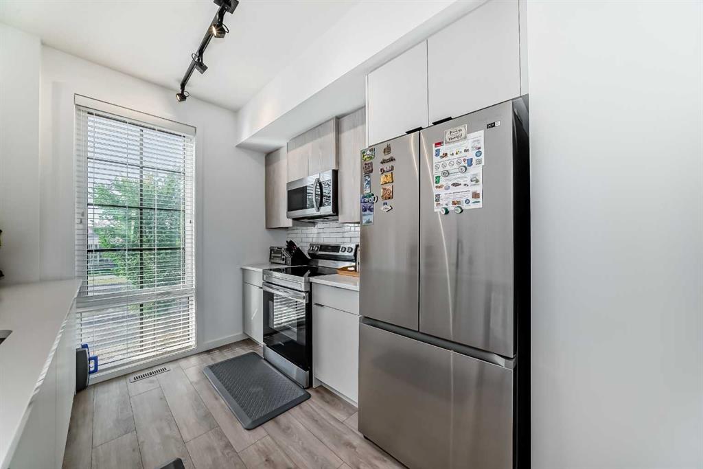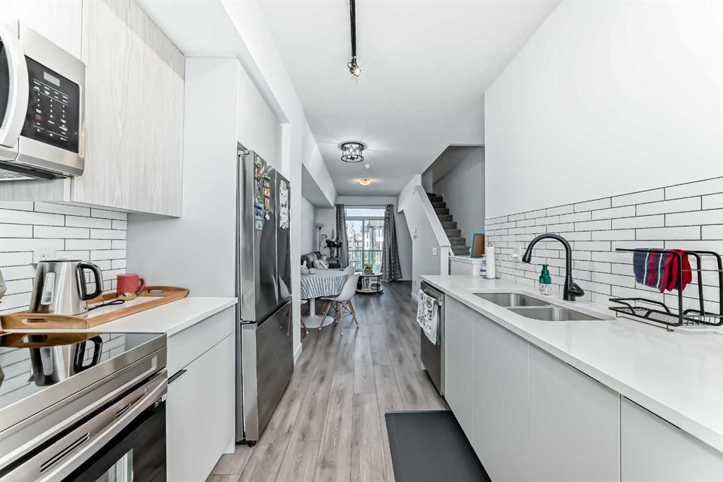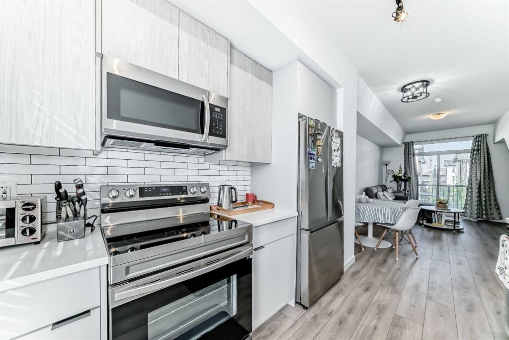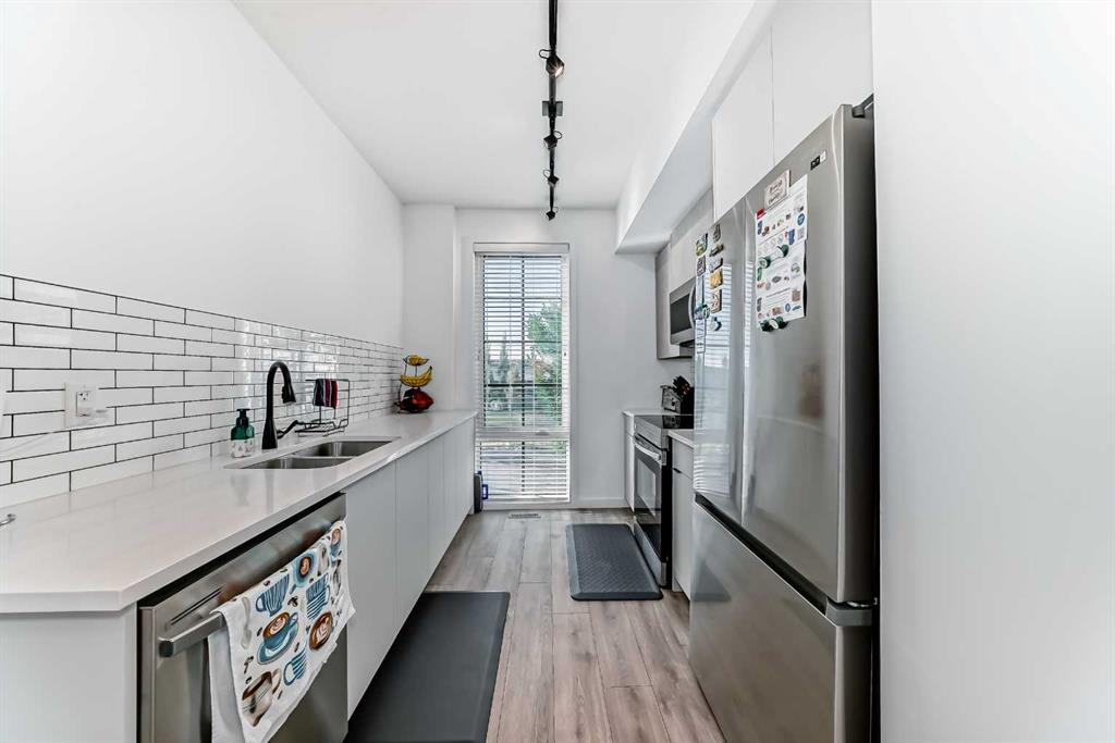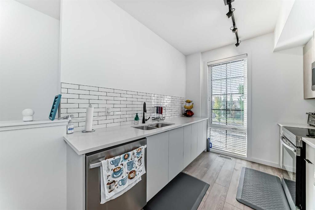 WOW – Pride of Ownership Shines Throughout! This immaculately maintained unit feels like new and is tucked away in a quiet location. From the moment you enter, you’ll be impressed by the thoughtful layout and modern finishes. The contemporary kitchen features stunning quartz countertops, stainless steel appliances, and flows seamlessly into a spacious living room that opens onto a covered balcony – perfect for relaxing or entertaining. The primary bedroom offers a generous layout with a 3-piece ensuite, while the second bedroom is conveniently located next to a 4-piece main bathroom. Pride of ownership is clearly visible throughout the home. Additional highlights include, Single attached garage, covered parking stall – for a total of 2 parking spaces. Close proximity to a soon-to-open K-9 school. Walking distance to daycare, gym, and retail shops like Domino’s Pizza. This unit is Move-in ready! Whether you're a first-time buyer, downsizer, or investor, this home is an excellent opportunity. Don't miss out!