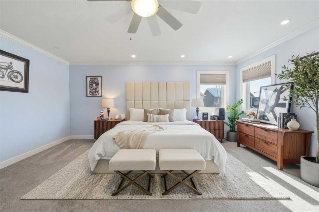 Welcome to 247 Kingston Way SE — an exceptional executive home situated on a massive corner lot in the prestigious community of Kings Heights. Offering over 2,600 sq ft above grade plus a professionally developed basement, this rare 5-bedroom property combines luxury, space, and thoughtful upgrades with outstanding functionality for growing or multi-generational families. From the moment you step inside, you are greeted by soaring 9’ ceilings, expansive windows, and an abundance of natural light that fills the main level. The open-concept design is anchored by a stunning gourmet kitchen featuring granite countertops, high-end cabinetry, a convenient walk-through pantry, a huge island, and new stainless steel appliances including fridge, dishwasher, and stove. The kitchen flows seamlessly into the spacious dining area and inviting living room, highlighted by a cozy fireplace and custom built-ins — creating the perfect space for both everyday living and entertaining. A main floor den/home office offers privacy for remote work, while the bright sunroom provides additional flexible living space ideal for relaxing or hosting guests. Upstairs, the impressive primary retreat offers generous proportions, a walk-in closet with direct access to the ensuite, and a luxurious 5-piece ensuite designed for comfort and relaxation. Two additional large bedrooms share another 5-piece bath, plus laundry room, ensuring no one compromises on space. A vaulted bonus room with a second fireplace completes the upper level — perfect for movie nights or a quiet family retreat. The professionally developed basement expands your living space even further with two additional bedrooms, a full bathroom, a spacious recreation area, and ample storage. Significant recent upgrades include a new furnace, new 50-gallon hot water tank, new air conditioning unit (2023), new garage doors, and new carpet — providing peace of mind and modern comfort for years to come. The oversized triple attached heated garage is a true standout feature, offering incredible storage and functionality, including a unique rear overhead door providing direct access to the backyard. Outside, the west-facing yard is fully landscaped and designed for low maintenance, complete with a private deck, RV parking, storage shed, garden boxes and full fencing — ideal for entertaining, relaxing, or accommodating recreational vehicles. Located within walking distance to parks, scenic pathways, water features, new schools, shopping, and with convenient access out of town, this home offers executive living in one of Airdrie’s most desirable communities. A rare opportunity to own a move-in-ready estate property that delivers luxury, space, and lifestyle — all in one remarkable address.