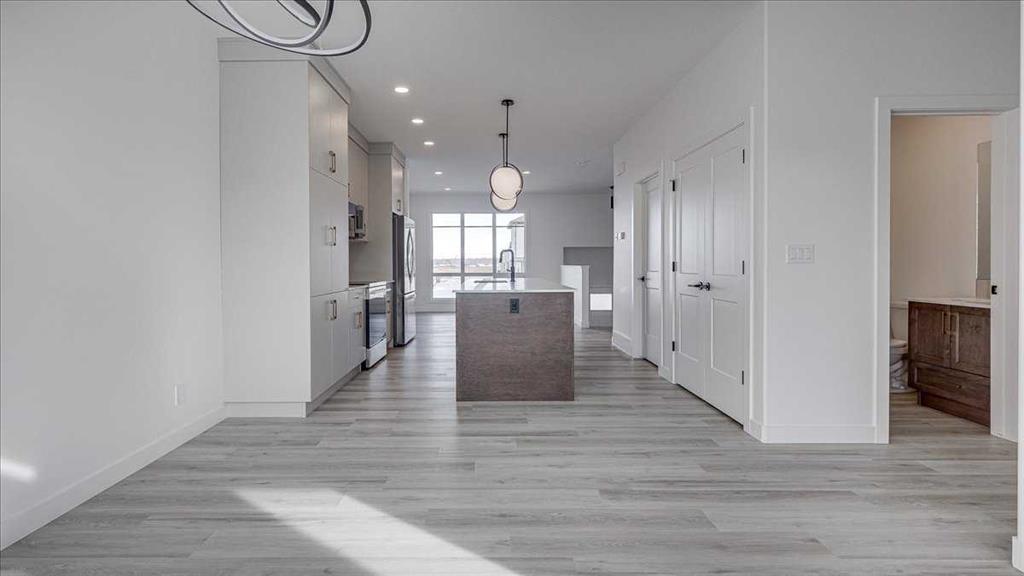NO CONDO FEES & Great Location! This Brand new, stylish bi-level townhouse has 3 bdrms, 2.5 baths, with 4 appliances, conveniently located in Liberty Landing, close to Costco, restaurants + Highway 2 access. With lovely curb appeal, step into this bright home w/triple pane windows, up the stairs to this open floor plan that features a bright living room & dining room, with a chef's dream kitchen in the middle, with quartz countertops, stainless appliances & double door pantry. This huge island will become the centerpiece for family gatherings, favorite meals & deep conversations. Check out this mud room coming from your south facing backyard, that hides all your shoes & coats from your main area. There is also a convenient flex space outside this 1/2 bath area, perfect for a desk for working @ home, or dog crates or freezer...just imagine what you could use it for! On the lower level, you will find the primary bedroom master with a huge window w/barn door leading to your ensuite & walk in closet. 2 more good sized bdrms, full bath & laundry area fit also neatly on this level. There is also a spacious storage area under the stairs. Front yard will have sod, back yard will have top soil to grade + dividing fence done on the east & west property lines towards the parking area will be completed for you. This south facing backyard is where you will spend your summer evenings & 2 car off street parking off Paved back lane. This unique floor plan will impress with all the natural light & affordable price without being too small! GST included with rebate to builder. Interior pictures are of another unit with the exact floor plan and colors. Proposed possession is April 30/26