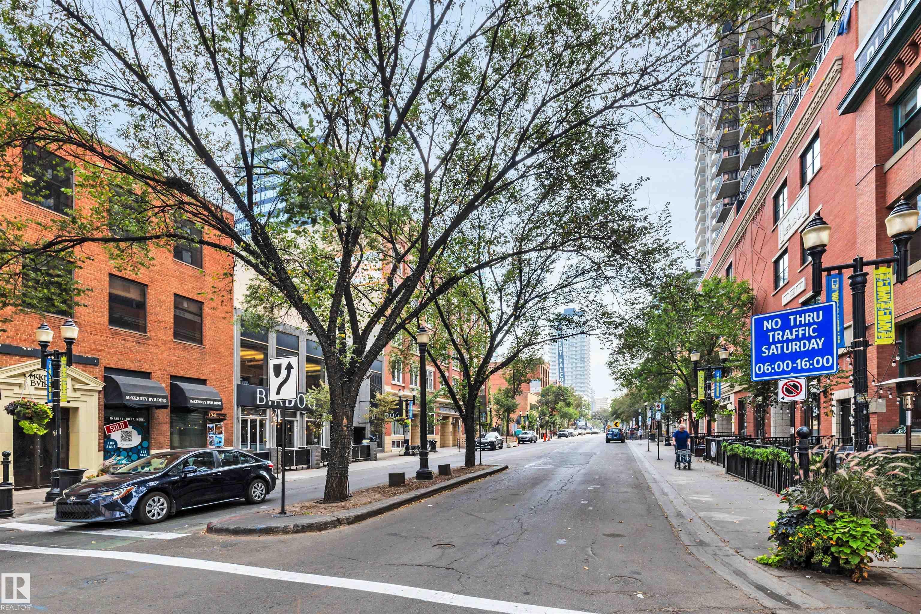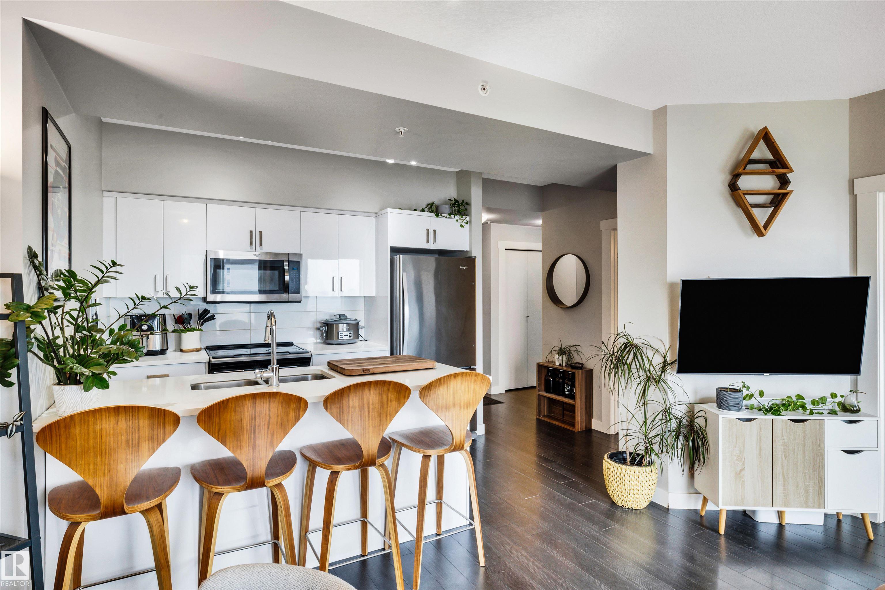 Welcome to the 25th floor of FOX Two. Experience refined urban living in the heart of Edmonton’s Ice District. This modern 1-bedroom PLUS DEN condo features huge south-facing windows with sweeping skyline views, A/C, 9' ceilings and a modern kitchen with quartz countertops, stainless steel appliances, and a breakfast bar for four. The well-designed bedroom includes a walk-through closet with access to the 4-piece bathroom. Den just off the entry way makes for the perfect office space. Enjoy the large south-facing, covered balcony with gas hookup—perfect for a BBQ or patio heater. Includes IN-SUITE laundry, titled, heated underground parking and Bluebox package locker system. Steps from all the best downtown has to offer: YMCA, entertainment, festivals, farmers markets, dining, shopping, and schools. Walkable to the LRT (incl. new Valley Line), Beaver Hills House Park, Michael Phair Park, and the upcoming Warehouse Park. Your peaceful sanctuary in the center of it all.