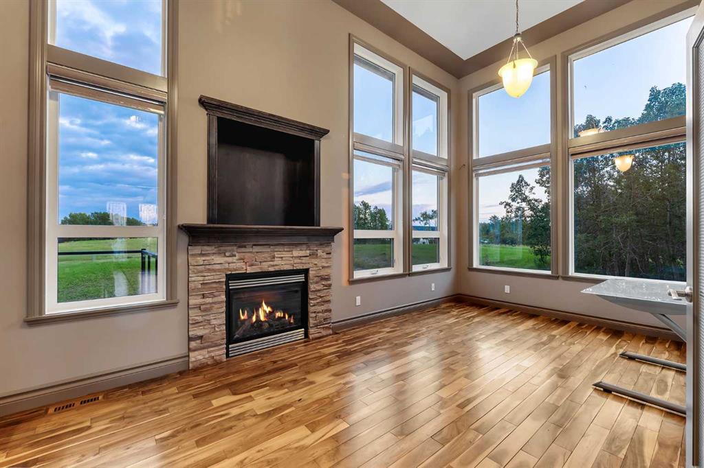 Discover refined acreage living on a fully landscaped 2-acre lot in one of Bearspaw’s most coveted locations. This over 6,000 sq ft walkout estate blends timeless elegance with modern versatility, offering spaces designed for both everyday comfort and impressive entertaining. A striking open-riser staircase and upper walkway welcome you into a light-filled main floor. A stone-faced fireplace warms the private den, ideal for a home office or reading nook, while the gourmet kitchen features cherry cabinetry, stainless appliances, a gas range, and a spacious walk-in pantry. The kitchen flows into the vaulted-ceiling living room and dining area, where a double-sided fireplace and expansive windows frame lush greenery and distant mountain views. Thoughtfully designed for both privacy and connection, the home offers a serene main-level primary suite with private deck access, panoramic windows, and a spa-inspired ensuite. Upstairs, a second private suite with its own fireplace and 5-piece ensuite provides flexibility for guests or older children, alongside two additional generously sized bedrooms and a full bath—perfect for younger family members or long-term guests. The fully finished walkout basement is an entertainer’s dream, with a wet bar, wine storage, theatre room, two additional bedrooms (one with ensuite), and space for a gym, studio, or hobbies. This level opens directly to your outdoor oasis, where mature trees, manicured gardens, and multiple seating areas create a year-round retreat for gatherings or quiet relaxation. With exceptional craftsmanship, a versatile layout, and a prime Bearspaw address just minutes from Calgary, this home offers the perfect balance of luxury, space, and lifestyle. Book your private showing today and experience Bearspaw living at its finest.