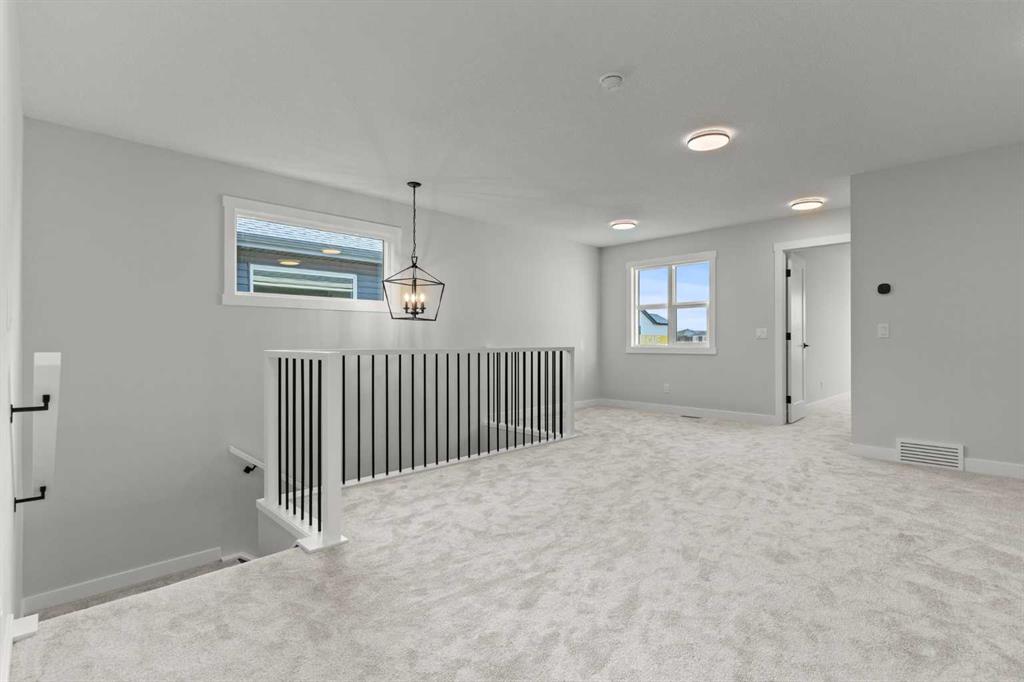 Welcome to 263 Kinniburgh Loop, a truly exceptional luxury home offering 2,457 sq. ft. of beautifully designed living space, featuring 4 bedrooms and 3 full bathrooms, thoughtfully crafted for both everyday living and entertaining. From the moment you arrive, you’re welcomed by an impressive oversized front door and a spacious, open entry that immediately sets the tone for the quality found throughout the home. Just off the foyer is a large main-floor bedroom or office, conveniently connected to a full bathroom with a standing shower—ideal for guests or multigenerational living. As you move further into the home, you’ll be captivated by the stunning chef’s kitchen featuring a nearly 9-foot island, quartz countertops, stainless steel appliances, full-height cabinetry, and high-end luxury finishes. The main floor is completed by a spacious living room with an electric fireplace, dining area, spice kitchen, and a walk-through mudroom with direct access to the garage. Everyday convenience is elevated with three main-floor closets, including two in the kitchen and one in the mudroom. Upstairs, a generous bonus room and sitting area create the perfect secondary living space. The expansive primary bedroom offers breathtaking pond views and connects to a spa-inspired 5-piece ensuite featuring dual vanities, a large glass shower with mosaic tile base, a freestanding tub, and a private toilet room. The primary flows seamlessly back into the laundry room, which also offers access back to the bonus room for added functionality. The upper level is completed by two additional large bedrooms and another beautifully finished 5-piece bathroom, with no dropped beams on the main or upper floors for a clean, open feel. This home includes all of the renowned Golden Homes standards, such as true 9-foot ceilings on the main floor, triple-pane windows, side entry, matte black iron spindle railings, matte black hardware and fixtures, built-in shelving in the pantry and primary walk-in closet, upgraded carpet underlay, a tankless hot water heater, smart home features, gas lines to both the deck and garage, and a solar panel rough-in. The exterior is fully landscaped with the lot graded and loamed, sod installed to the side entry, and a front yard tree—completing this luxury home in one of Chestermere’s most desirable communities.