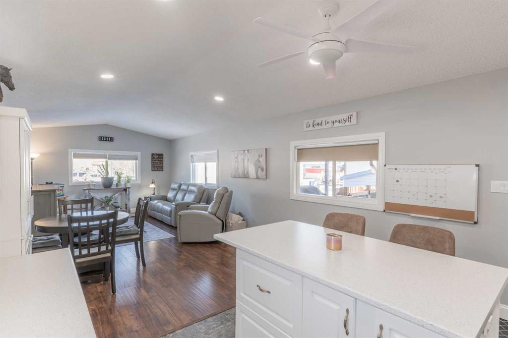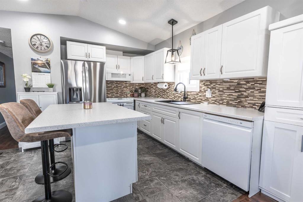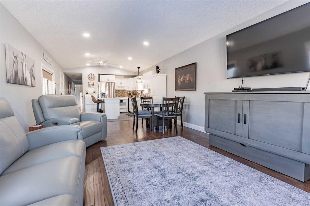 OWNED LAND, NO LOT FEES! Want low maintenance living with everything on one level...with fully fenced yard for your pets or kids? Welcome to this 3 bed 2 bath home that has been meticulously maintained inside and out. The large covered deck (19'5"x 10'5") is welcoming and a great addition to morning coffees, entertaining friends and family in the warmer months, all while being protected from the elements. It's an extension of the home! Step inside to find a beautiful open concept kitchen/dining/living room with vaulted ceilings and newly incorporated pot lights to add to the abundance of natural light. The kitchen has new countertops, new sink and new side by side fridge. Enjoy simple meals at the counter seated island which also supplies numerous storage drawers/cupboards and an electrical outlet for further convenience. Down the hall, away from the noise of living, you will find a four pc bath with laundry, a generous master bedroom with 3pc ensuite and two additional bedrooms..one currently used as an office with outdoor access. No detail has been missed, inside or outside...the list is endless. A new furnace installed in July 2025, with a pump so it doesn't drain under the home (affecting moisture below)but rather into the sewer lines, new light fixtures/fans...washer/dryer and dishwasher approximately 2 years old, new flooring in master bedroom. The office has been freshly painted. Moving outside, the covered deck was stained this past summer and the gazebo has sliding panels to control level of sun etc. The yard has been completely transformed into a maintenance free zone including pea gravel and artificial grass. New sidewalks and rubber pads were installed to keep walking easy as well as a new garbage platform. There are 3 sheds and two container holding racks for added storage and convenience. Finally, the home was relevelled with new footings on cement pads and new 8ml poly/pea gravel installed with heat tape on water lines below for optimal comfort and security. Parking is never a problem, there is plenty extra in the roundabout directly in front of the home. Don't miss the opportunity to check out this great home!