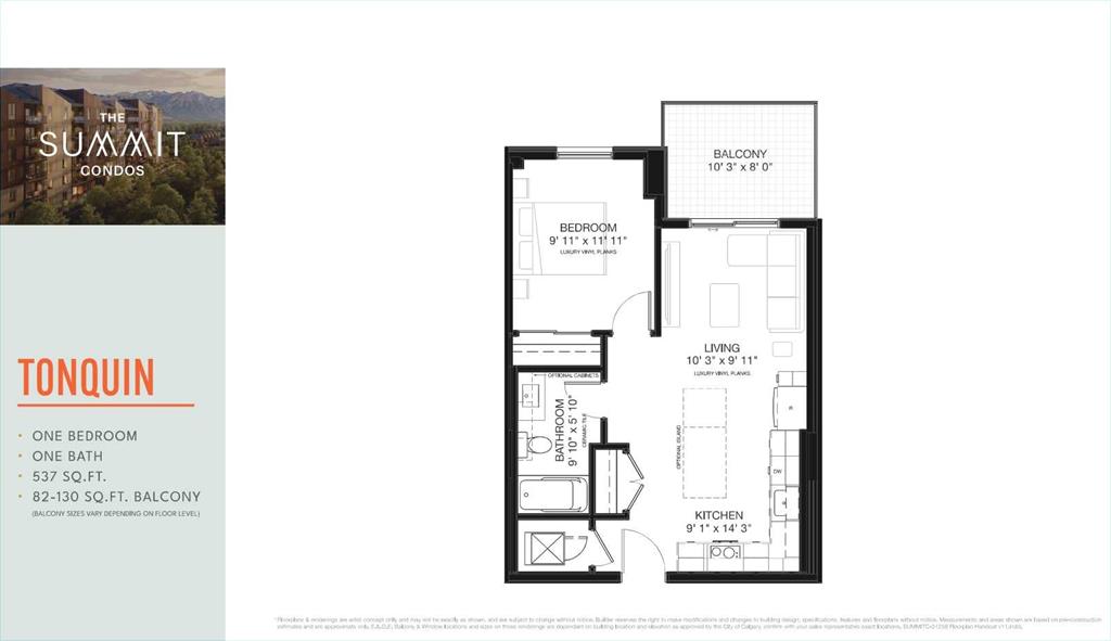 Introducing The Summit at Wentworth South, a modern 6-storey condominium community by Trico Homes, coming Summer 2028 to one of west Calgary’s newest master-planned neighbourhoods. Thoughtfully designed to combine style, comfort, and smart value. Constructed with durable concrete slab construction, this tech-smart building is designed for enhanced privacy, quiet living, and long-term quality. Interior features are carefully curated to provide modern comfort, including 9’ ceilings, creating bright and open living spaces filled with natural light. Each residence showcases luxury vinyl plank flooring, quartz countertops with undermount sinks, ceramic tile in bathrooms, and fully tiled bath and shower surrounds with 10mm glass enclosures. Contemporary lighting and plumbing fixtures add a refined finishing touch throughout. The kitchen is equipped with a premium stainless steel appliance package, including a counter-depth refrigerator, induction electric range, built-in dishwasher, chimney hood fan, and microwave, along with a waterline to the fridge for added convenience. Additional features include air conditioning, zebra blinds, full-size stacked washer and dryer, and a gas line connection on the balcony, making this home move-in ready and thoughtfully designed for everyday living. Buyers can further personalize their home by selecting from three designer colour palettes and three upgraded finish packages. Residents of The Summit will enjoy access to lifestyle-focused amenities including a fitness centre, indoor and outdoor gathering spaces, and a pet relief area, supporting both comfort and community connection. Ideally located in Wentworth South, this development offers convenient access to shopping, dining, services, parks, and pathways, while remaining just 15 minutes to downtown Calgary by C-Train or car. With close proximity to Stoney Trail and Bow Trail, commuting throughout the city is simple, and weekend trips to the mountains are easily accessible with Banff approximately 55 minutes away. The Summit at Wentworth South presents an exceptional opportunity to own a brand-new home in a vibrant west Calgary community designed for modern living. This is the Tonquin Floor Plan.