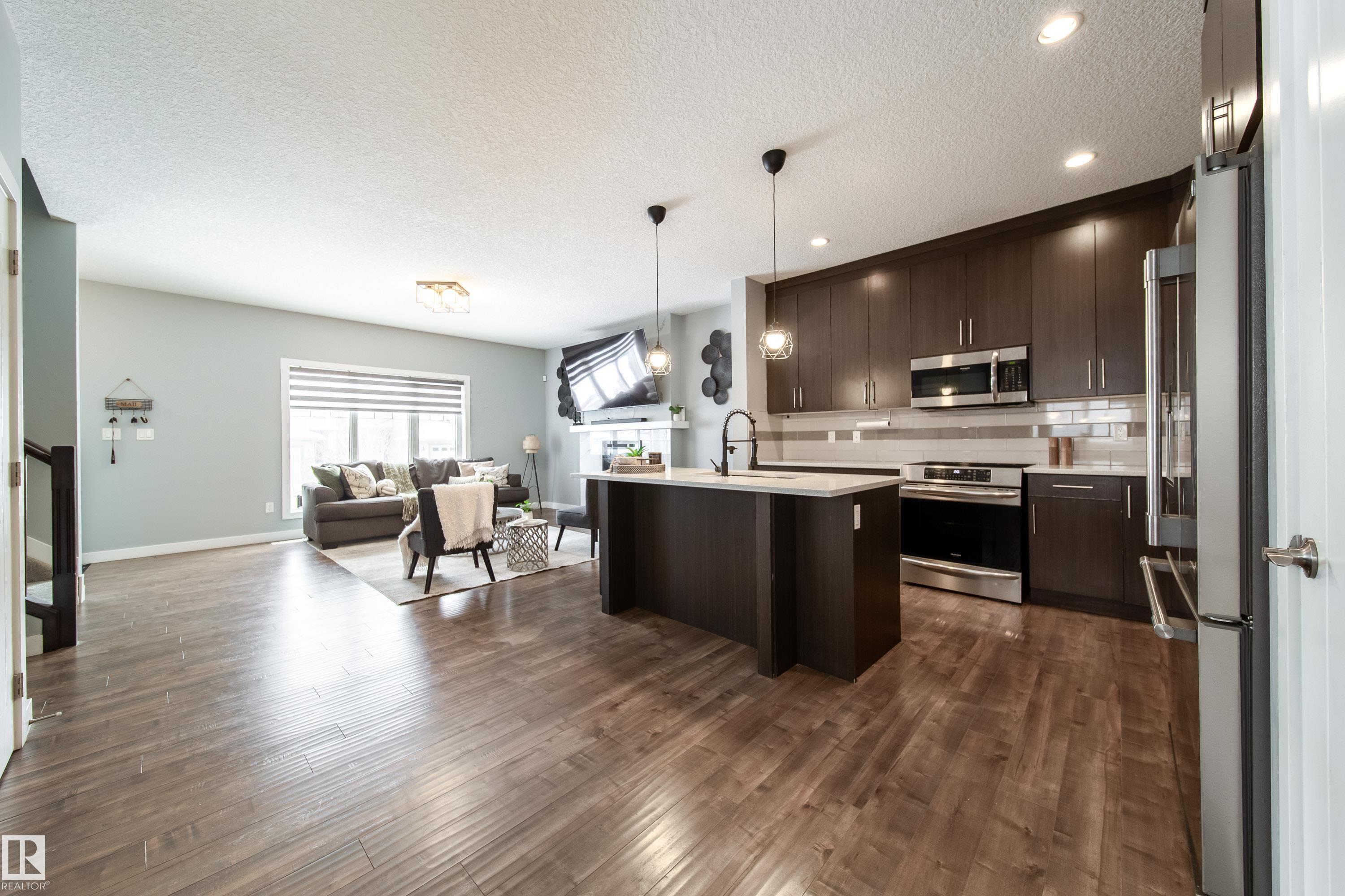 Welcome to this stunning, move-in ready home in the highly desirable Tamarack community. This spacious, custom-built 2-storey offers 6 bedrooms and 4 full bathrooms with over 2,635 sq.ft. of total living space. A concrete sidewalk leads to a separate side entry providing access to the fully finished basement in-law living complete with a secondary kitchen featuring new appliances, 2 bedrooms, and a full bath. The main floor showcases hardwood flooring, 9-foot ceilings, quartz countertops throughout, premium appliances, & a beautifully designed kitchen with ceiling-height cabinetry and pantry. A rare main floor bedroom and full bath add flexibility for guests or multi-generational living. Upstairs features laundry, well-sized secondary bedrooms, and a HUGE primary retreat with walk-in closet, double vanity 5pc ensuite, and walk-in shower. Enjoy the backyard deck with gazebo coverage. Close to schools, parks, pond, shopping, transit, and the Meadows Rec Centre. A perfect blend of space, comfort & location!