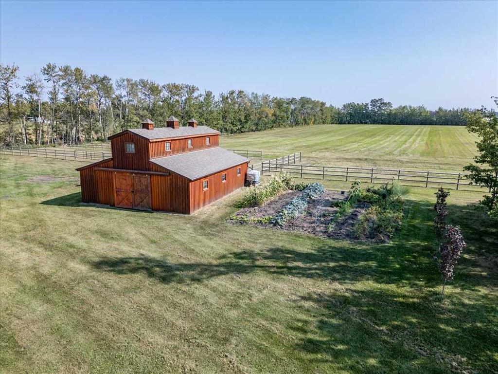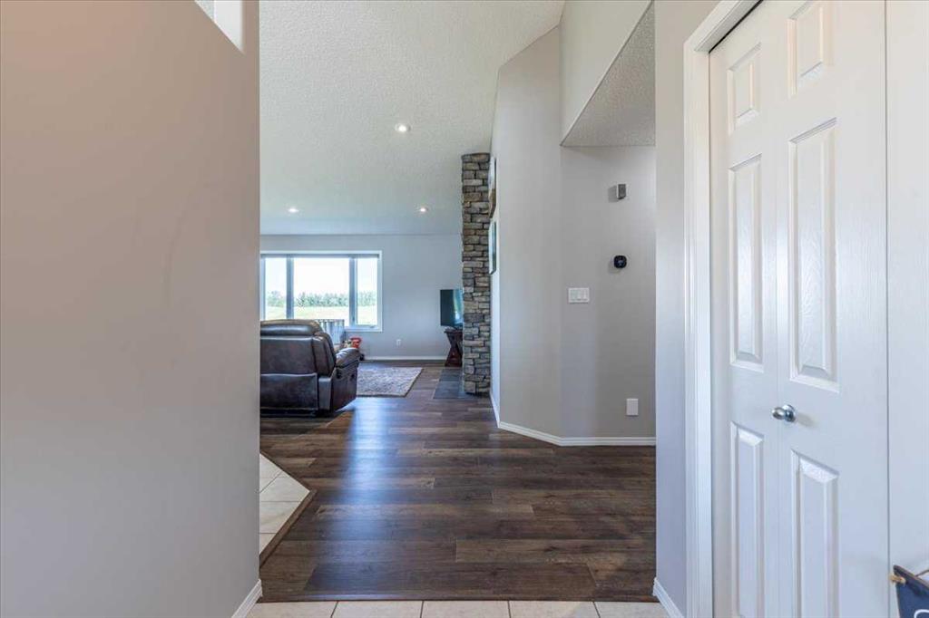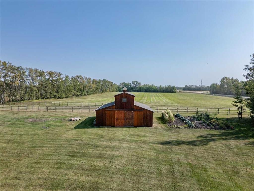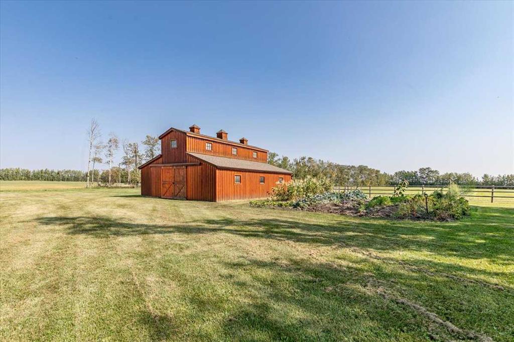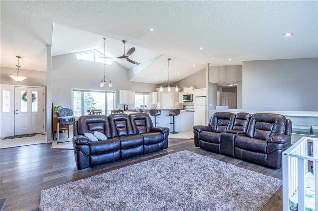 This Beautiful Home with an Oversized Double Attached Garage, Barn, and Double Detached Garage is situated on 55 Acres. Inside the home are 3 Bedrooms Including the Primary with a walk-in closet. The Primary also hosts a 5 piece Ensuite Bathroom, and a Double Sided Fireplace shared with the Living Room. The Den could be used as another Bedroom if needed. The Laundry Room has its own sink and extra storage. The Kitchen has an island with a second sink and is open to the Dining Room, and Living Room with Vaulted Ceilings. A 4 Piece Bathroom, and 2 Piece Bathroom are also on the Main floor with access to the Attached Heated Garage. The Basement is unfinished but open and ready to take in any direction. The Barn has 4 Box Stalls, a Tie Stall, a Loft in the center, and sliding doors on both ends. Rail Fencing off the back of the Barn makes it Great for animals. The Detached Garage has Power and a Concrete Floor. A prepared pad is in place for a future shop. This Gorgeous Property also has 2 Drilled Wells.