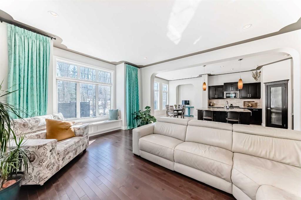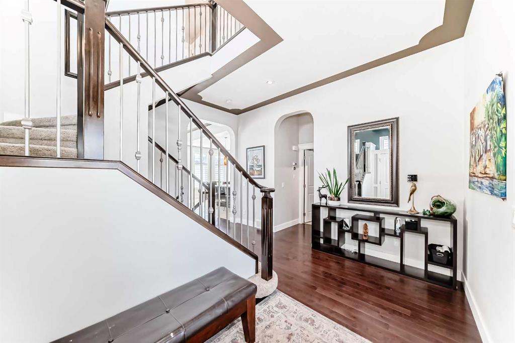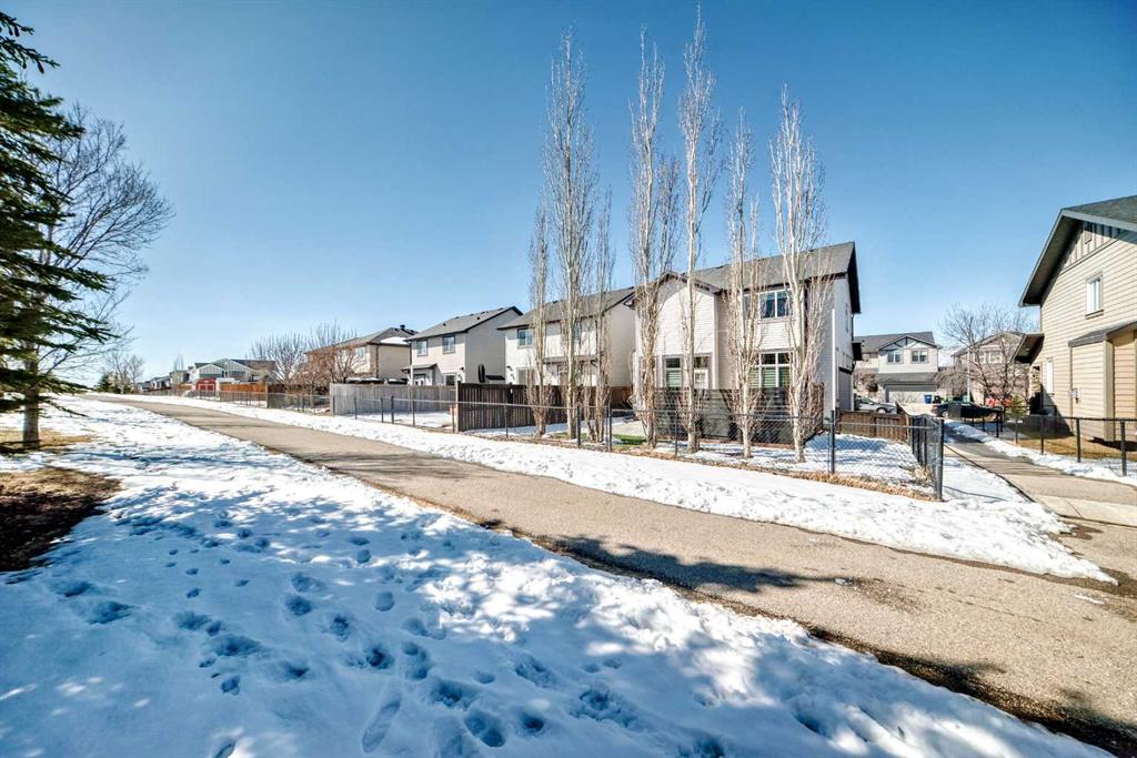 Impressively large and fully finished 2-storey offering a double attached garage, 4 bedrooms, 3 bathrooms and an unbeatable location—backing onto a greenspace & path, just a short walk to both Heloise Lorimer School and École des Hautes-Plaines schools. From the moment you walk in, you’re welcomed by a bright, open foyer with impressive 10-foot ceilings and a modern-looking floating staircase. The well-lit main living space is warm and inviting, featuring a fireplace and large, upgraded window package that fill the home with natural light. You’ll also notice the attention to detail throughout including bullnose granite countertops, beautiful architecture with arches, several built-ins, floor to ceiling tiled fireplace and custom crown molding & baseboards. The kitchen is designed for both everyday living and entertaining, complete with a massive centre island layout and a convenient walkthrough pantry. Step outside and you’ll find a backyard that truly stands out. With over $40,000 in upgrades, it features a stamped concrete patio, custom deck, mature trees, and low-maintenance astroturf. Backing onto greenspace with neighbours set far back, it’s a private setting with plenty of room to relax or host. Upstairs, the primary bedroom offers a peaceful retreat with vaulted ceilings, a spacious 5-piece ensuite with double vanity, and a walk-in closet. You’ll also find two additional bedrooms and a large bonus room—perfect for a growing family. A bright and big laundry room with room for a sink complete the upper floor (Owner has converted this room into a salon, but could easily be converted back to a laundry room). The fully finished basement adds even more living space with a large fourth bedroom (bedroom window may not be egress), a versatile rec room, a full bathroom and lots of storage. Recent updates include a tankless hot water system (2023) and newer appliances (fridge, stove, and washer in 2022), giving you peace of mind. All of this is located on a quiet street, close to shopping, restaurants, and with easy access to major routes. This is a great opportunity to get into a move-in-ready home in one of Airdrie’s most popular communities. Reach out to your favorite Realtor to book your showing.