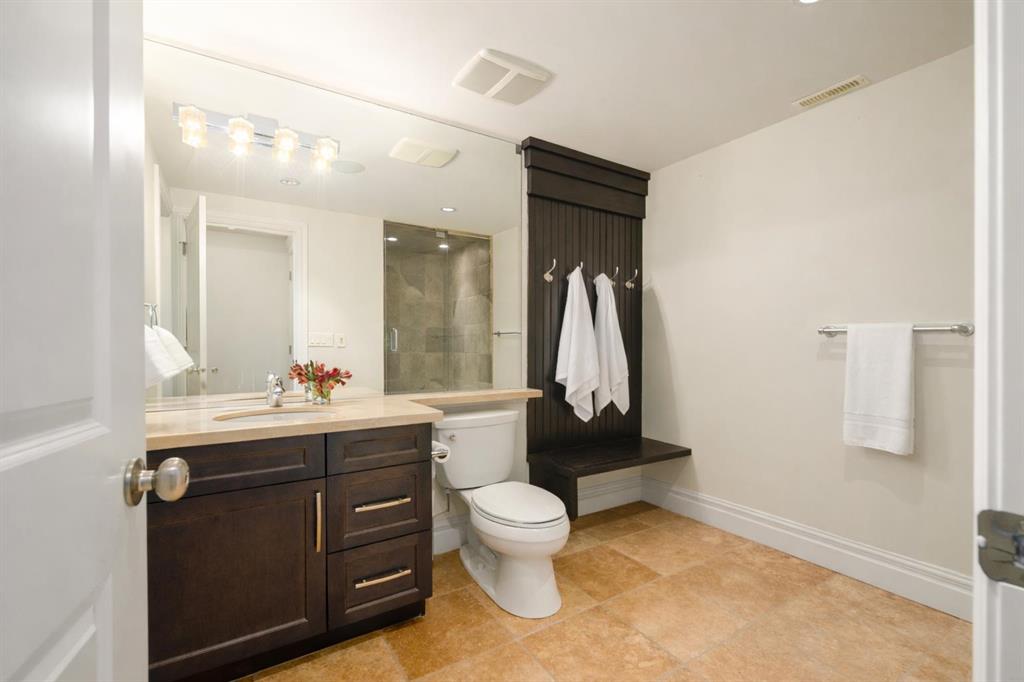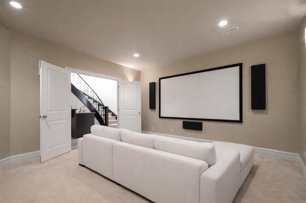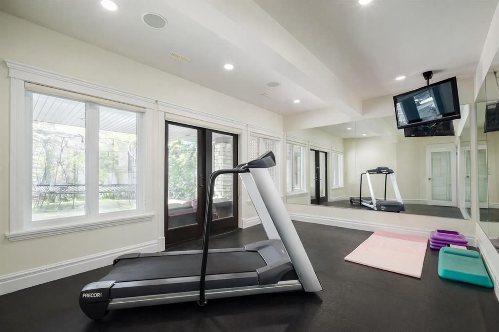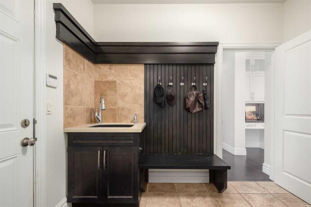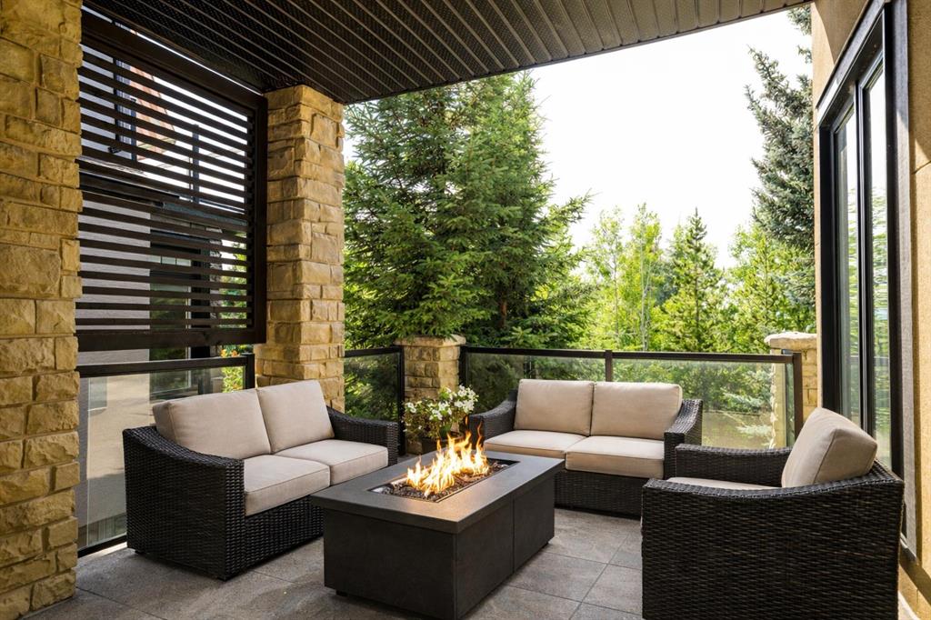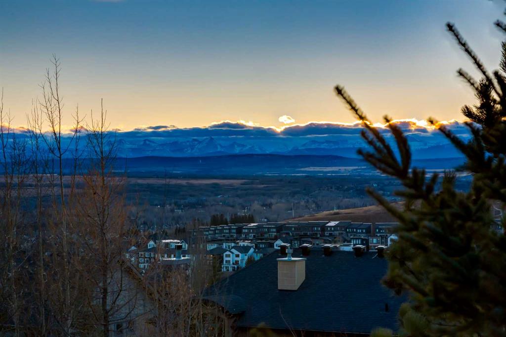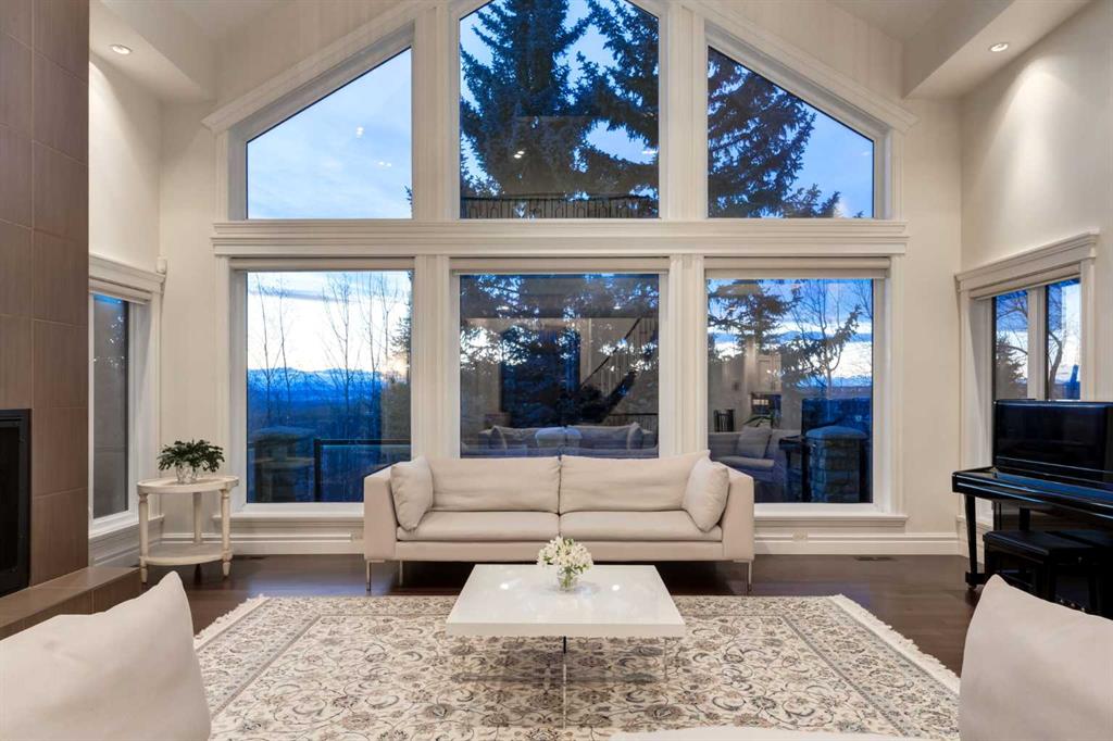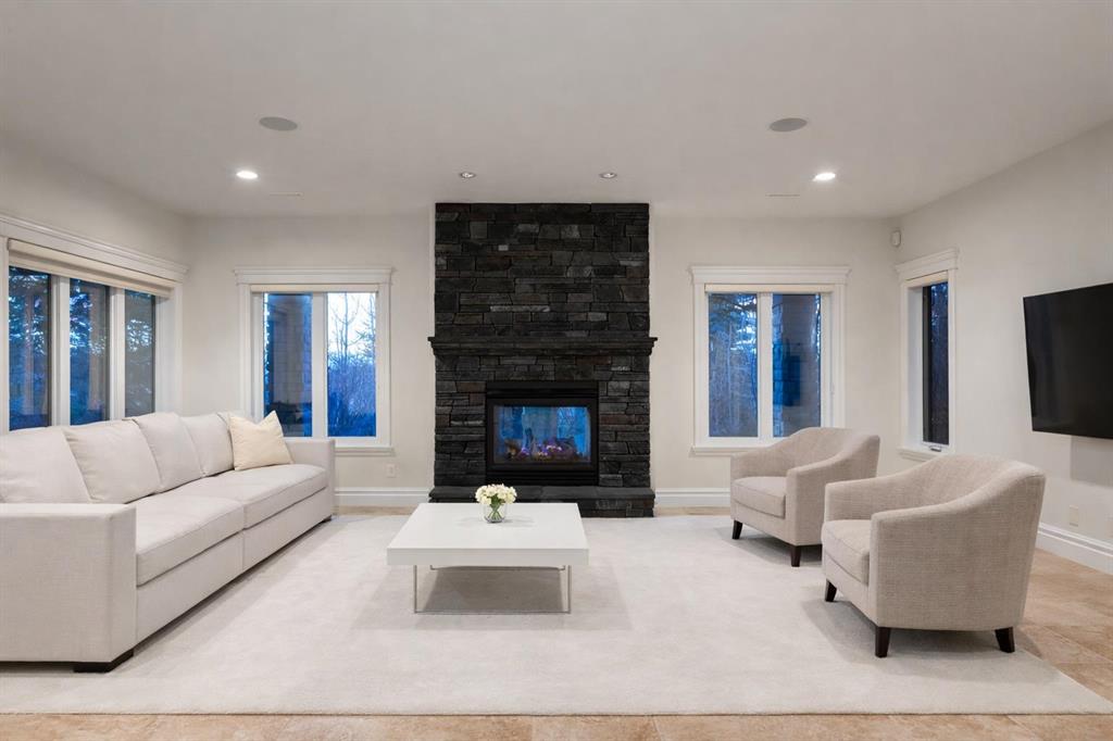 Balanced with natural light, this beautifully crafted family home captures breathtaking West-facing views of the Rocky Mountains, set against a serene, tree-lined backdrop. A timeless custom maple front door creates a warm first impression, complemented by natural stone detailing. Thoughtfully designed with custom-built cabinetry throughout, the home blends elegance with everyday functionality. Inside, a vaulted sitting room immediately draws the eye. Expansive windows frame the views while a sleek floor-to-ceiling fireplace adds contemporary architectural presence. Just off the foyer, a private executive office with French doors and coffered ceilings connects seamlessly to the formal dining room through a double-sided fireplace. The kitchen features Sub-Zero, Wolf, and Miele appliances and flows into a bright breakfast nook that opens onto the west-facing deck—ideal for alfresco dining. Overlooking the private, treed backyard, the pergola-covered deck includes stairs leading to the spacious yard below. A generous walk-through pantry connects to a fully equipped mudroom with extensive storage, a sink, and access to the triple garage. The grand curved wood staircase leads upstairs to three spacious bedrooms and a large flex room. The primary suite offers a private terrace with sweeping Rocky views, his & her custom closets, and an expansive ensuite with heated floors, his & her vanities, and a dedicated vanity area. Above the garage, the inviting flex room features its own fireplace and ample space for media & games. Two additional bedrooms share a 5-piece Jack-and-Jill bathroom with a double vanity, ideal for siblings. A well-appointed laundry room with built-in cabinetry, a sink, and hanging space completes the upper level. The fully developed walkout basement features travertine flooring and radiant in-floor heating throughout. A double-sided fireplace connects the interior family room to the covered exterior deck. This level is designed for versatility, offering a theatre room, bright home gym, additional bedroom, and a 4-piece bath with a steam shower. With a wet bar and private backyard access from two points, the lower-level functions beautifully as a retreat for growing or multigenerational families. Ideally located near Calgary’s top private and public schools—including Rundle College, Webber Academy, and Ernest Manning High School—this home also offers quick access to Westside Rec Centre, Aspen Landing Shopping Centre, and Highway 1 for easy escapes to Banff.