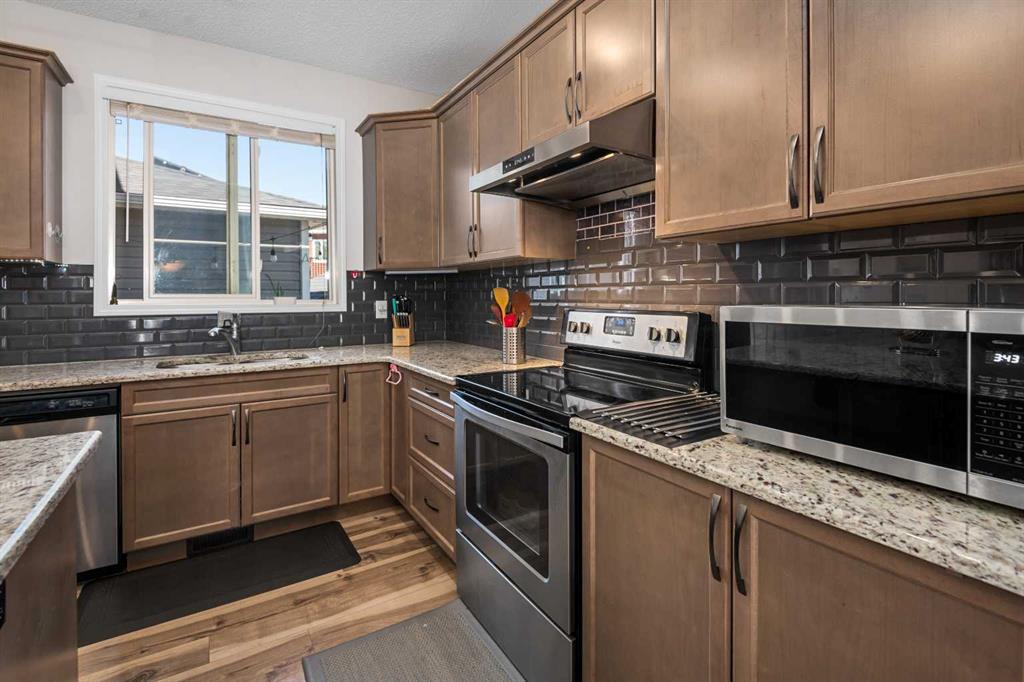 NO CONDO FEE!!!!! LOCATION, LOCATION, LOCATION!!!!! Brand new solar panels! This 1968 sf two level duplex is tucked in on a quiet inner street of Carrington and yet just one block away from all the convenient amenities like supermarkets (No frills, Sobeys, Save on foods, Co-op), gas stations, schools, restaurants, coffee shops, clinic, pharmacy, bus stops, parks and playground. Also you are mins away from Superstore, Canadian Tire, Dollarama, Shoppers Drug Mart, Winners, Michaels, Staples, Home Depot, Vivo Recreation Center, IMAX movie theatre. The house has an easy access to Stoney trail, Deerfoot trail, Bedlington Trail and 144 Ave which will be a main road in the NW. It is built on a pie lot, it has a huge fenced east facing side yard that you can enjoy all day in the spring and summer, You will have lots of room to play with your pet, your kids, turn it into a garden, build your green house, build your sunroom….your imagination is the limit. Upon entering the house from the front door, you can relax in a south facing living room where large windows invite in natural light. And it flows into a large dining room that can accommodate a large full size dining table. The kitchen, overlooking the large side yard, has an oversized granite countertop with tons of storage and maple cabinets. All stainless-steel appliances like Fridge, dishwasher, glass top stove, oven and a recently installed powerful hood fan are all included. A large attached insulated double garage is connected to the back of the house with long driveway, that puts you further away from your neighbor. Upstairs it has a large master bedroom with 3 pcs ensuite and a walk-in closet and south facing large windows. There are two other bedrooms and a separate 3pcs bathroom. There is also a laundry room that comes with high end Samsung washer and dryer with steam clean function 21 Solar panels have been installed on the brand new roof in the summer of 2025, that give you ample power to offset whatever amount of power you use. This house also has around 800 ft of undeveloped basement with rough in for another bathroom. You pay for a duplex and get all the benefits of a single house with a giant yard.