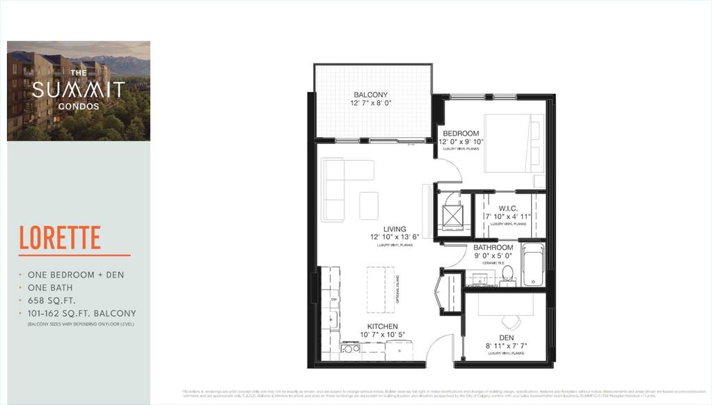 Introducing The Summit at Wentworth South, a modern 6-storey condominium community by Trico Homes, coming Summer 2028 to one of west Calgary’s newest master-planned neighbourhoods. Thoughtfully designed to combine style, comfort, and smart value. Constructed with durable concrete slab construction, this tech-smart building is designed for enhanced privacy, quiet living, and long-term quality. Interior features are carefully curated to provide modern comfort, including 9’ ceilings, creating bright and open living spaces filled with natural light. Each residence showcases luxury vinyl plank flooring, quartz countertops with undermount sinks, ceramic tile in bathrooms, and fully tiled bath and shower surrounds with 10mm glass enclosures. Contemporary lighting and plumbing fixtures add a refined finishing touch throughout. The kitchen is equipped with a premium stainless steel appliance package, including a counter-depth refrigerator, induction electric range, built-in dishwasher, chimney hood fan, and microwave, along with a waterline to the fridge for added convenience. Additional features include air conditioning, zebra blinds, full-size stacked washer and dryer, and a gas line connection on the balcony, making this home move-in ready and thoughtfully designed for everyday living. Buyers can further personalize their home by selecting from three designer colour palettes and three upgraded finish packages. Residents of The Summit will enjoy access to lifestyle-focused amenities including a fitness centre, indoor and outdoor gathering spaces, and a pet relief area, supporting both comfort and community connection. Ideally located in Wentworth South, this development offers convenient access to shopping, dining, services, parks, and pathways, while remaining just 15 minutes to downtown Calgary by C-Train or car. With close proximity to Stoney Trail and Bow Trail, commuting throughout the city is simple, and weekend trips to the mountains are easily accessible with Banff approximately 55 minutes away. The Summit at Wentworth South presents an exceptional opportunity to own a brand-new home in a vibrant west Calgary community designed for modern living. This is the Lorette Floor Plan.