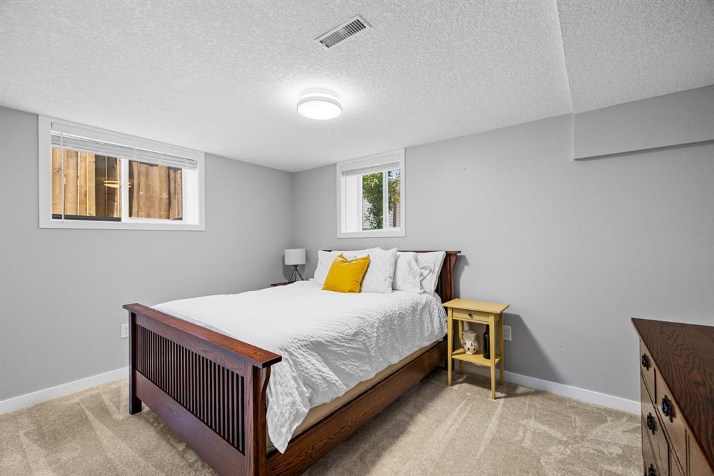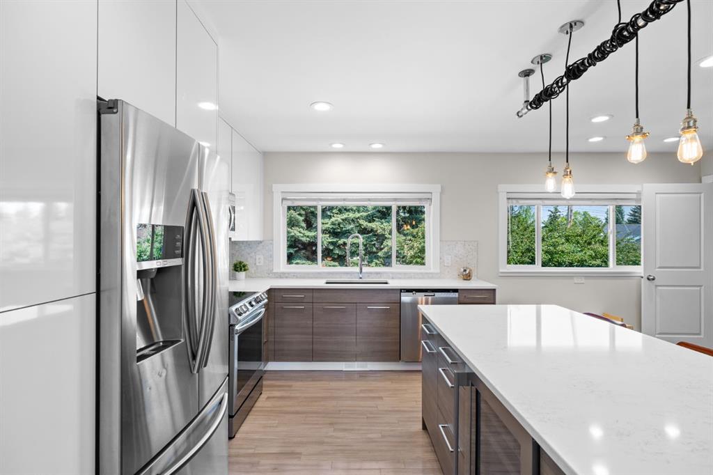 *OPEN HOUSE Sat Oct 18th 2-4 pm* Welcome to this thoughtfully renovated 4-bedroom, 2-bath bungalow offering over 1,900 sq. ft. of beautifully finished living space in one of Calgary’s most desirable inner-northwest communities. Inside, natural light fills the open-concept main floor, blending modern design with timeless comfort. The stunning kitchen showcases sleek two-tone cabinetry, quartz countertops, a large island with seating, and stainless-steel appliances—perfect for everyday living or entertaining. The spacious living room enjoys views of mature trees through a picture window and a cozy gas fireplace, while the adjoining dining area provides the perfect setting for family dinners. Two generous bedrooms and a stylish 4-piece bathroom complete the main level. The fully developed lower level brings exceptional versatility with two additional bedrooms, a full bathroom, a comfortable recreation area with wet bar, and a bright laundry room—ideal for families, guests, or a work-from-home setup. Step outside to enjoy multiple outdoor spaces: a large front deck perfect for morning coffee, a private rear patio with fire-pit area, and a rare rooftop patio above the garage—a peaceful retreat for evenings under the stars. The attached single-car garage and additional off-street parking add year-round convenience. With a newer furnace, hot water tank, windows, A/C, roof, and sewer line, all the big-ticket items have been taken care of, giving you complete peace of mind. Located on a quiet, tree-lined street, this home is just minutes from Confederation Park, SAIT, the Winter Club, and downtown. With quality craftsmanship, smart updates, and a welcoming atmosphere, this home delivers modern living in a mature, established neighbourhood.