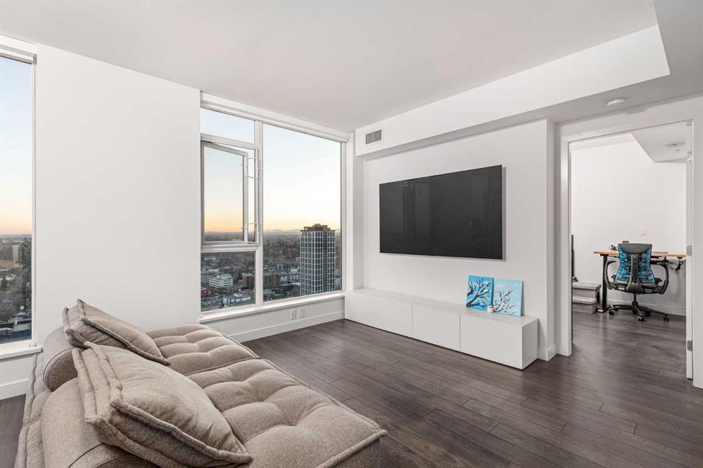 Perched on the 30th floor of the prestigious Park Point building, this stunning corner end unit offers an exceptional blend of luxury, sophistication, and urban convenience in the heart of Calgary’s vibrant Beltline. With soaring 9' ceilings, this thoughtfully designed residence features 2 bedrooms, a versatile office/den, and 2 full bathrooms, creating a perfect balance of style and functionality. Floor-to-ceiling windows flood the space with natural light, showcasing breathtaking panoramic views of downtown Calgary, Central Memorial Park, and the majestic Rocky Mountains. The open-concept design enhances the spacious feel, making it ideal for both relaxing and entertaining. At the heart of the home, the Italian-designed Armony Cucine kitchen is a masterpiece of form and function, featuring full-height cabinetry with soft-close drawers, under-cabinet lighting, premium stainless steel appliances including a gas cooktop, real granite countertops and backsplash, and high-end Hansgrohe fixtures. The expansive island with a breakfast bar provides additional prep space, while a dedicated coffee/beverage station adds a touch of everyday luxury. The living and dining areas offer an inviting ambiance with south-facing views, creating the perfect setting for unwinding or hosting guests. The den/office is surrounded by large windows, provides an inspiring workspace with incredible unobstructed views of the downtown skyline and the Rocky Mountains—a rare feature that elevates both productivity and relaxation. The primary suite is a private retreat, featuring a walk-through closet leading to a spa-inspired 5-piece ensuite with a soaker tub, dual sinks, and an oversized glass-enclosed shower. The second bedroom offers additional comfort with expansive city views and ample storage space, while the 4-piece guest bath includes an oversized shower. Completing the home is a full-size in-suite laundry and air conditioning, ensuring comfort and convenience year-round. This unit comes with underground parking and storage locker for added convenience. The pet-friendly Park Point building offers world-class amenities, including a fully equipped fitness center, Yoga studio, sauna and steam room, resident’s lounge, party room, outdoor courtyard with a BBQ station, and a car/pet wash bay. Ideally located in the heart of the Beltline, Park Point provides unmatched walkability with Central Memorial Park and the Memorial Park Library right across the street, Haultain Park and its tennis courts just steps away, and an array of top-rated restaurants and cafés nearby. The shopping, entertainment, and nightlife of 17th Avenue are minutes away, while the Saddledome and Stampede Park offer year-round events and sports. For those who work downtown, the +15 entrance is just one block away, ensuring seamless connectivity. This meticulously crafted residence delivers the ultimate urban lifestyle with unparalleled views, premium finishes, and top-tier amenities. Don’t miss this opportunity!