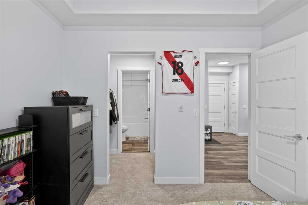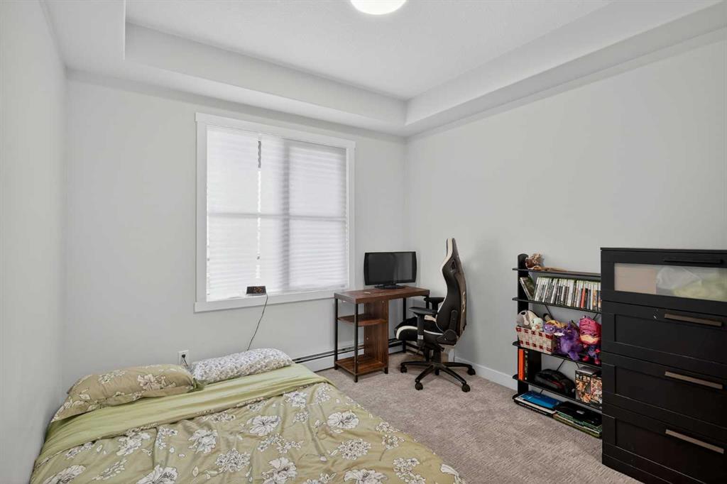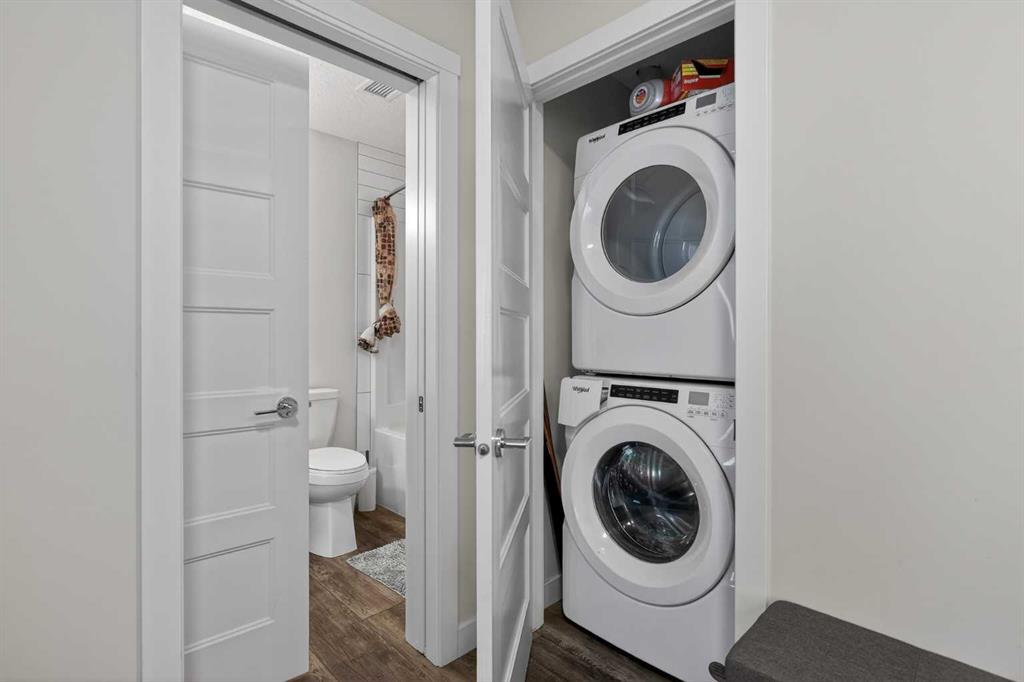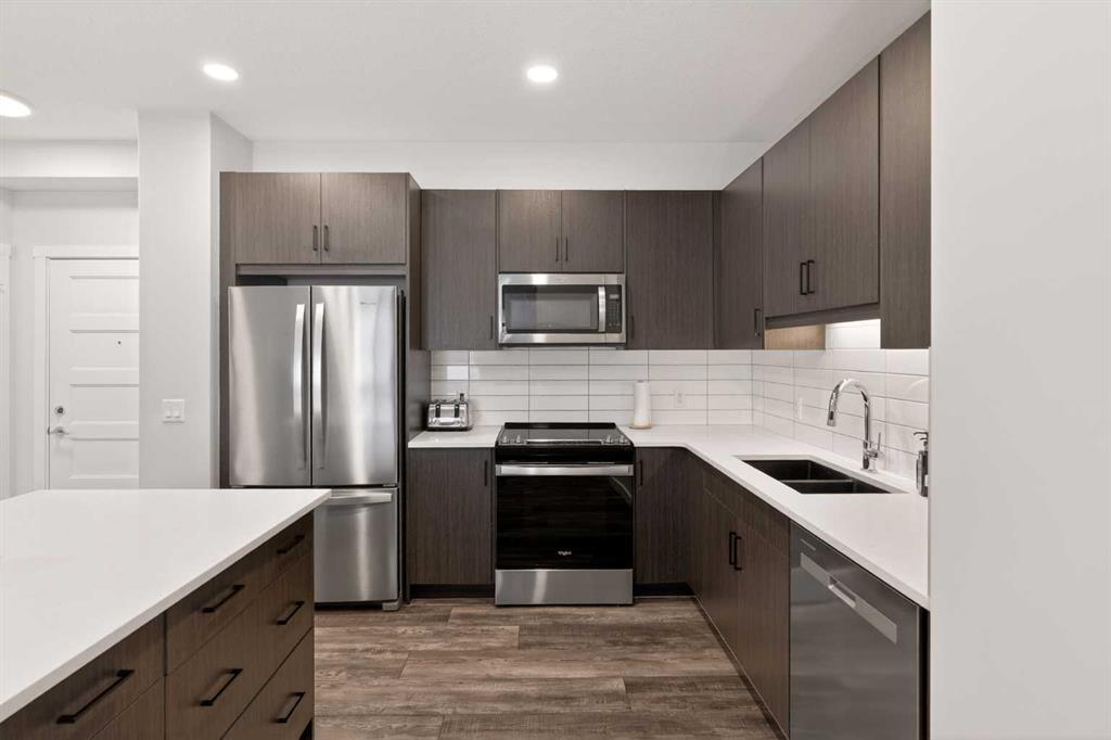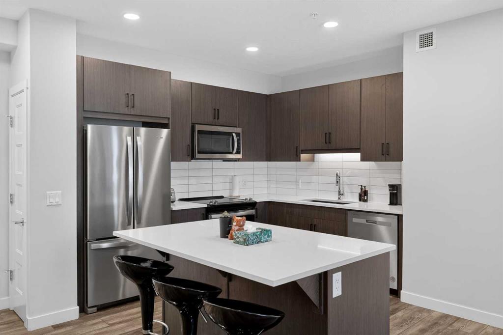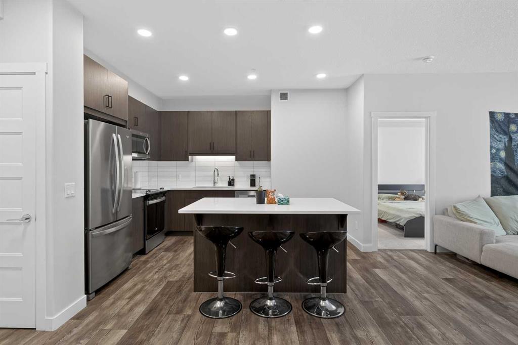 Experience elevated modern living in this exceptional third-floor condominium, perfectly situated in the vibrant new community of Wolf Willow. This home has been meticulously curated with premium upgrades, including soaring nine foot ceilings and durable luxury vinyl plank flooring, creating a sophisticated environment that seamlessly blends high-end style with everyday convenience. The heart of the home is a chef-inspired kitchen designed for both functionality and aesthetic appeal, featuring elegant quartz countertops, full-height cabinetry, and a versatile center island. The space is fully equipped with a top-tier KitchenAid stainless steel appliance package, while the open-concept layout extends naturally to a contemporary balcony offering unobstructed views. This residence accommodates two spacious bedrooms and two elegant full bathrooms, each thoughtfully designed with integrated vanity drawers to maximize storage. Beyond the living quarters, the property offers significant value with in-suite laundry, a titled underground parking stall, and a dedicated storage cage conveniently located directly in front of the parking space. Nestled along the Bow River Valley and adjacent to Fish Creek Park, the location provides unparalleled access to nature while remaining highly connected via Macleod Trail and Stoney Trail. With quick possession available, this professionally designed condo offers a premier turnkey opportunity in one of Calgary’s most desirable southern communities.