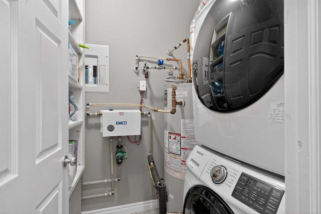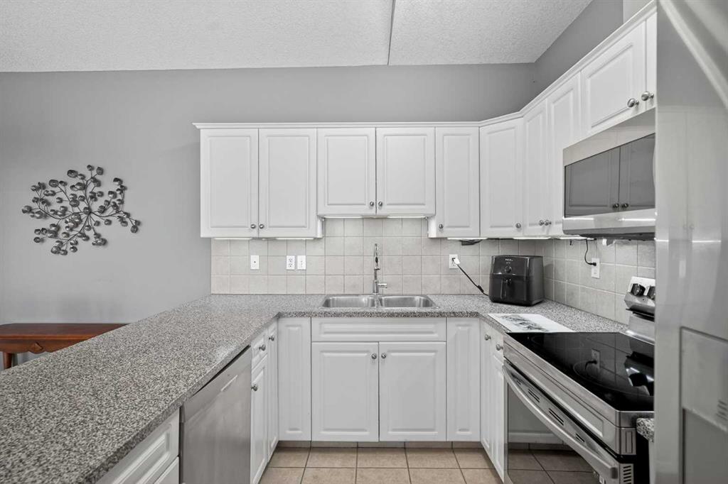 A rare find - top-floor corner unit with vaulted ceilings, offering 1066.71 sq ft of bright living space in the heart of downtown Heritage Okotoks. This spacious condo features two bedrooms and two full bathrooms. The vaulted ceilings in the living, dining, and kitchen areas make the space feel even larger and more inviting, while the kitchen offers plenty of white cabinetry. The oversized primary bedroom is extra bright with corner windows and includes a walk-through closet leading to a private ensuite with a window. The second bedroom is also generous in size and located next to another full 4-piece bathroom - good for guests, a roommate, or a home office. Step outside to your covered balcony with a gas line for your BBQ and a sunshade for added comfort. Additional features include a large storage room on the same floor, TWO titled heated underground parking stalls, security system in the parkade and entrances, and an automatic water shut-off safety system. Numerous upgrades have been completed in recent years, including stove range, refrigerator, washer and dryer, central A/C, microwave-hood, vinyl flooring and wall paint, updated higher-raised toilets, and window blinds. All of this in a well-kept 12-unit pet friendly building just steps from Elma Street, local coffee shops, boutique shopping, breweries, festivals, and the river pathways. Heritage is truly the heart of Okotoks - enjoy a walkable lifestyle and leave your car at home. It’s rare to find this much space, privacy, upgrades, and location at this price point. Book your showing - this one is worth seeing in person.