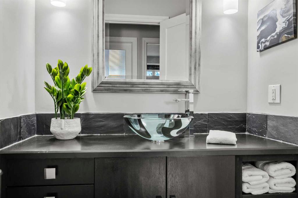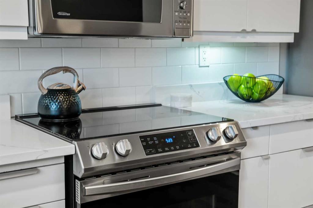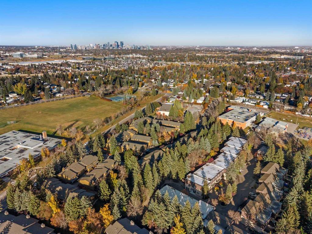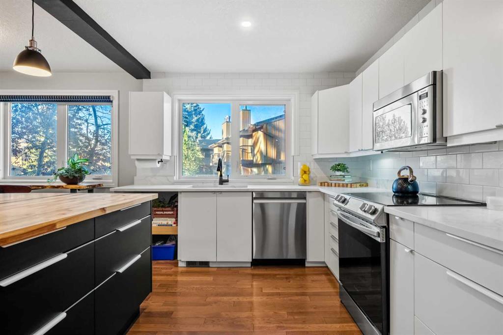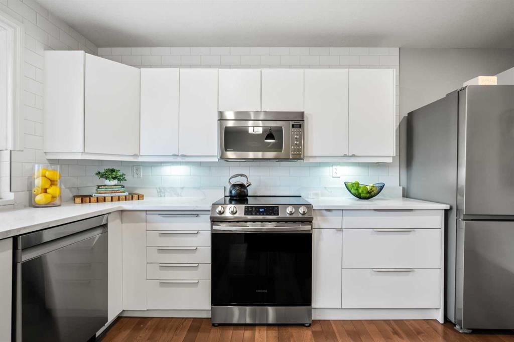 Welcome to Lakeview Greens, the pinnacle of desirable living in Calgary’s sought-after Lakeview community! This exceptional townhome boasts a sun-drenched, south-facing backyard and an unbeatable location that truly has it all. Families will appreciate being just steps away from top-rated schools, including Jennie Elliot Elementary, Bishop Pinkham Jr. High, and Connect Charter School. Take leisurely strolls along Lakeview’s charming, tree-lined pathways, or enjoy nearby outdoor gems like North Glenmore Park, Weaselhead Provincial Park, and the prestigious Earl Grey Golf Course. Commuters will love the quick drive to downtown Calgary, while mountain enthusiasts can escape to the Rockies in under 45 minutes. Step inside to find a beautifully designed townhome featuring gorgeous hardwood flooring throughout. The open riser stairs lead to a mid-century inspired layout, evoking warmth and calm. The chef-inspired kitchen includes white quartz countertops, a striking butcher block island, sleek modern cabinetry, stainless steel appliances, a subway tile backsplash, and a practical corner pantry. The spacious living room is flooded with natural light from large patio doors that open onto your private backyard, anchored by a cozy wood-burning fireplace — perfect for entertaining or unwinding after a long day. Upstairs, you’ll discover two generous bedrooms (which could easily be converted back into three), including a serene primary suite featuring a large walk-in shower, creating a peaceful retreat. The finished basement studio adds versatility, ideal for a home gym, creative space, or private office. Notable updates include a new Furnace (2023), Hot water tank (2021), Dishwasher (2024), Microwave hood fan (2025), Fridge (2021), and all windows replaced in 2017. This remarkable home is your opportunity—don’t miss the chance to make Lakeview Greens your new address. Book your private viewing today and experience the best of Lakeview living. Don’t forget to explore the immersive virtual tour of this exceptional home!