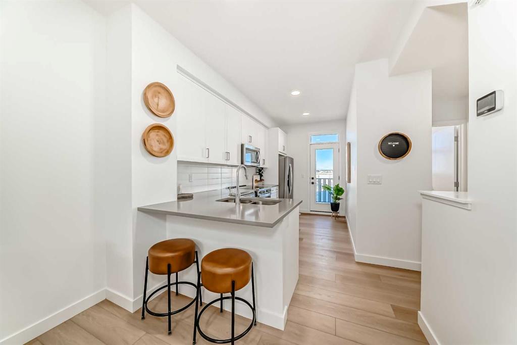 IF YOU’VE BEEN OVERLOOKING TOWNHOMES BECAUSE THEY ALL START TO BLUR TOGETHER, THIS ONE IS WORTH A SECOND LOOK. What sets it apart isn’t flash—it’s how intentionally the space is divided and how well it actually lives. This THREE-STOREY PLAN in Alpine Park is especially strong for buyers who want separation without wasted square footage. The entry level offers a FULL-SIZED DEN that truly functions—ideal for working from home, a bedroom for hosting guests, or creating space that doesn’t compete with daily living. A LARGE STORAGE ROOM and direct access to the SINGLE ATTACHED GARAGE quietly solve the practical pieces many townhomes gloss over. The main living level is open, calm, and well-proportioned. The kitchen anchors the space with warm white cabinetry, charcoal quartz, and a BREAKFAST BAR PENINSULA that handles real life without bottlenecks. Kitchen, dining, and living areas connect in a way that feels easy rather than compressed, and the FULL-WIDTH BALCONY adds genuinely usable outdoor space. Upstairs, DOUBLE MASTERS **TWO BEDROOMS—EACH WITH ITS OWN ENSUITE BATHROOM AND FULL-WIDTH CLOSET—**create flexibility that works for couples who don’t need a third bedroom, roommates who value privacy, or buyers thinking ahead to resale. Laundry is located on this level, right where you want it. With approximately 1,449 square feet above grade, modern construction, and the BALANCE OF THE BUILDER WARRANTY still in place, this home offers a low-maintenance entry into one of Calgary’s most design-forward west-side communities. Alpine Park continues to attract buyers who care about architecture, walkability, and long-term livability—and this plan fits that mindset precisely. This is a well-planned townhome, designed for buyers who want space to work, host, and unwind without compromise. If that sounds like you, THIS IS ONE YOU SHOULD SEE.