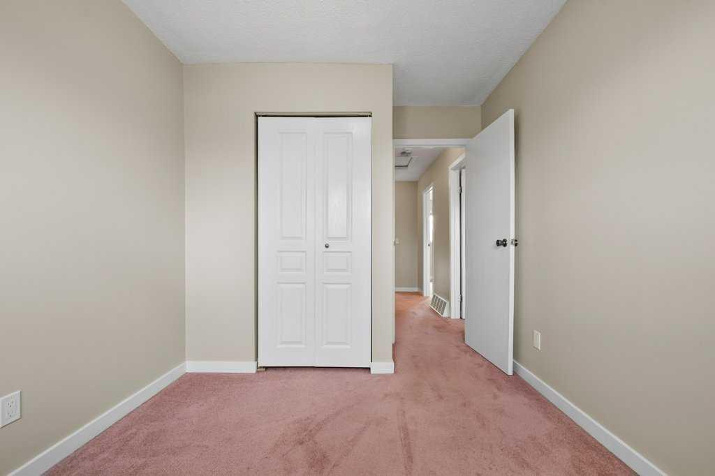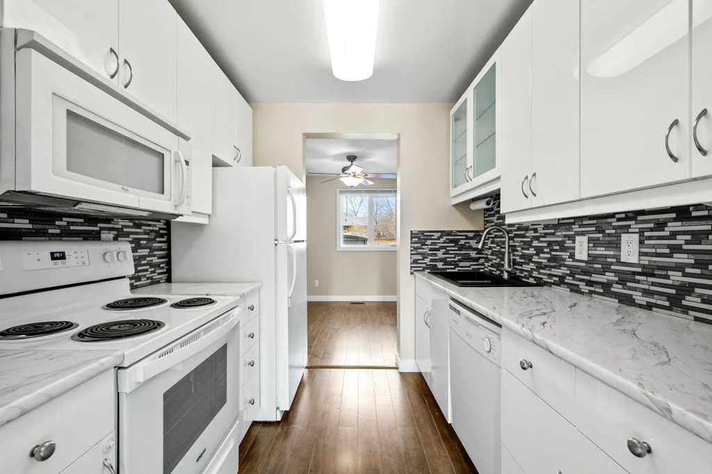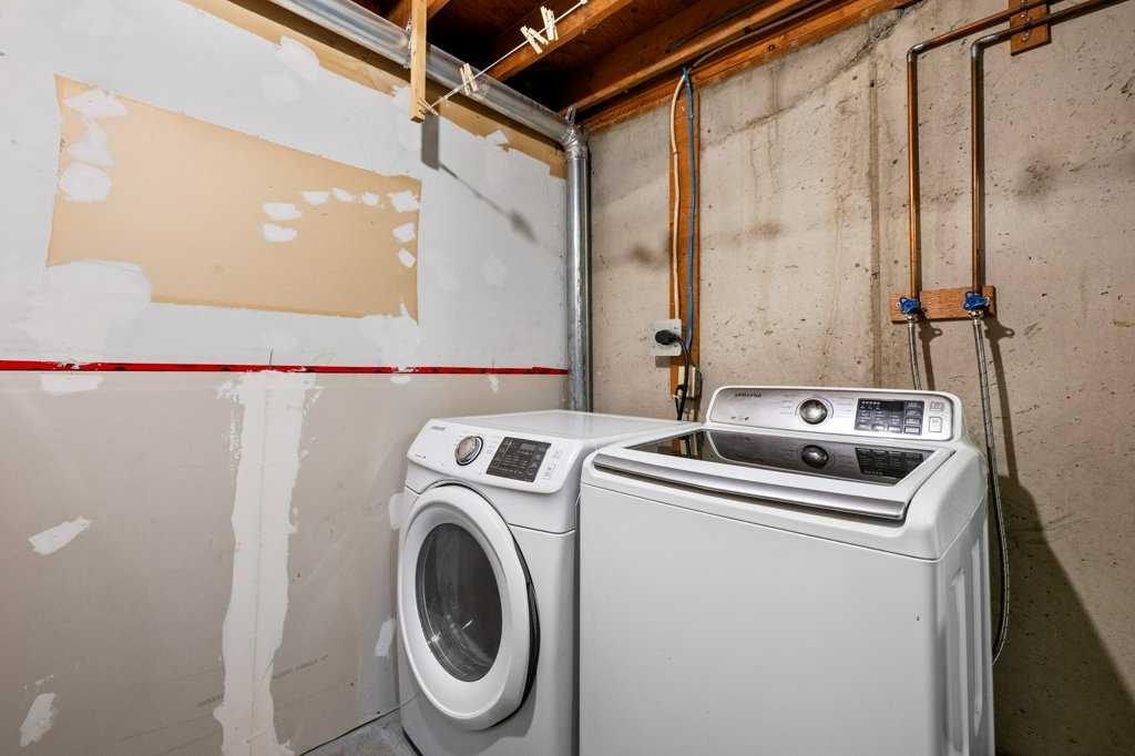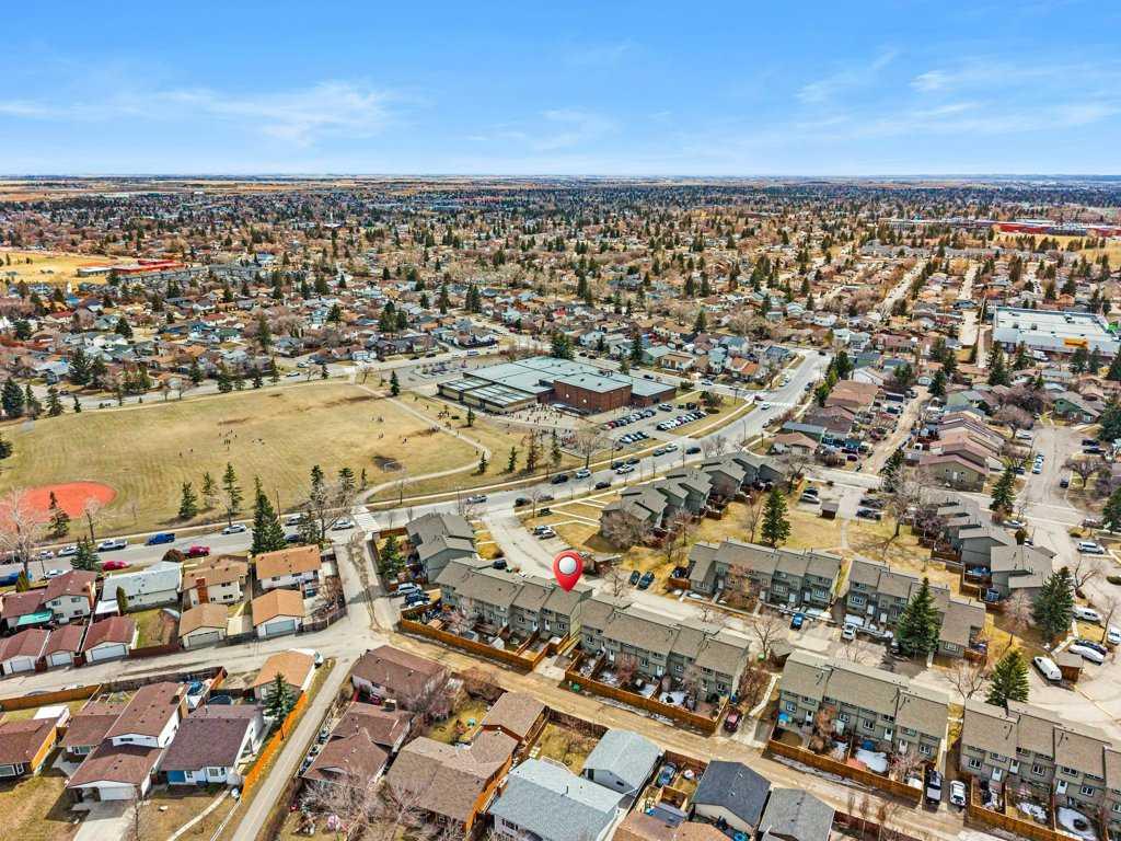 Welcome to this well-maintained and freshly painted end-unit townhome offering 1,100 sq ft above grade of comfortable living space and a fully fenced backyard, sectioned dedicated stall parking, across from Guy Weadick School! This home has seen numerous updates over the years, including vinyl windows, attic insulation upgraded in 2022, asphalt shingles, doors, and fencing, along with a hot water tank (approx. 3 years) and a serviced furnace with a newer motor, providing peace of mind for years to come. The main floor features laminate flooring and a functional layout with a bright front living room, convenient 2-piece bath, and a very spacious dining area with a garden door leading to the north-facing backyard complete with a storage shed and plenty of space for the kids and pets to play. The galley-style kitchen offers white cabinetry, tiled backsplash, extended-height cabinets, and a full appliance package. Upstairs, you’ll find three bedrooms, including a generous primary that comfortably fits a king-sized bed and offers dual closets. The updated 4-piece bathroom features a granite countertop, undermount sink, and a deep soaker tub with full tile surround. The fully finished basement adds additional living space with a flex room, media room, and laundry/utility area, all complemented by laminate and carpet flooring. Located in a well-managed complex, this home includes a rear assigned parking stall and is ideal for first-time buyers, families, or investors.