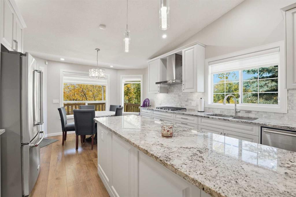HONEY! START THE CAR! Welcome home to this BEAUTIFUL corner lot, adjacent to GREENSPACE, where MODERN ELEGANCE meets FUNCTIONALITY. This spacious 2,382 square feet in total bi-level DETACHED home with a DOUBLE ATTACHED GARAGE is sure to IMPRESS! This property has many FEATURES that you will LOVE, including the unique floor-plan with the living room located on the main floor level, and the OPEN CONCEPT layout with MODERN flat textured high VAULTED CEILINGS. RECENT RENOVATIONS have been done inside this property from TOP to BOTTOM! This property FEATURES new high-end STAINLESS STEEL appliances, GRANITE counter tops, CUSTOM cabinetry with tons of storage space, a LARGE kitchen Island, BUILT-IN convection oven and microwave, a 5-burner GAS RANGE STOVETOP, GORGEOUS wide-plank scratch resistant flooring throughout, NEW carpets throughout, MODERN flat textured ceilings throughout, high-end CLASSY light fixtures and pot lights, CUSTOM window coverings, DECK access conveniently located off of the kitchen, 4 spacious sized bedrooms, including the primary bedroom with a WALK-IN CLOSET and 4-PIECE ENSUITE, 3 full bathrooms FEATURING TILE FLOORING, TILE BACKSPLASH, and GRANITE countertops, JETTED bathtub on the lower level, LOTS of windows throughout allowing for lots of NATURAL sunlight, the laundry room features a LARGE window and a LARGE sink, lots of STORAGE SPACE, a WELL-KEPT and spacious FULLY FENCED backyard, included with this property is an A/C unit for those hot spring and summer months, and the ICING ON THE CAKE - this property features high-end GEMSTONE EXTERIOR lighting!!! Make this IMPRESSIVE property your new home, this property will not last long, call your favourite realtor today!