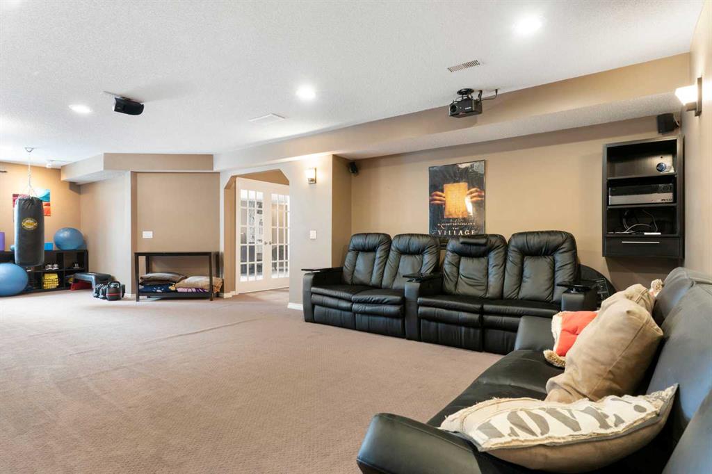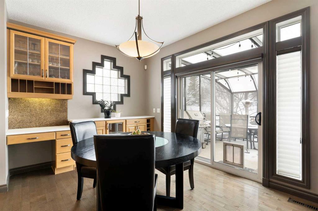 Welcome home to this beautifully designed, 3600+ sqft executive home with a 400+ sqft 3-season outdoor screen room, backing onto the 11th tee box of GlenEagles Golf Course. This home is perfectly positioned to enjoy tranquil views without the worry of stray balls in your back yard—zero in 20 years! Flooded with natural light, this home offers refined character blended with function, ideal for a growing family. Main highlights include hardwood floors, new plush carpet throughout the upper and main floor, charming archways, a wood-burning fireplace with gas lighter in the living room and a gourmet kitchen. Custom millwork cabinets and built-ins enhance both the living room and kitchen, which features a smart ‘triangle’ work flow of stainless steel gas stove, refrigerator with ice/water hookup and sink in the island. The kitchen also features premium quartz countertops with a slate backsplash, a corner pantry, Vacuflo floor sweeper, and extended sideboard with a built-in desk. A versatile flex room off the kitchen is perfect for a formal dining room, home office, or playroom. The patio doors off the dining nook feature a built-in pet door and opens to a fully screened-in large deck that spans the rear of the home, complete with a light-diffusing waterproof ceiling, built-in speakers, gas BBQ hookup, and secure pet access to the yard. The expansive screened in deck truly expands the main floor living space to the outdoors, enabling full enjoyment of the natural beauty surrounding this home and even allowing for BBQing in the rain. The backyard also offers a built in stone patio with a firepit and plenty of private greenspace for the kids or pets. The oversized double garage includes extra storage and a triple-wide driveway, so this home offers 5 private parking spaces (room for two inside & three out front!) The upper level offers a spacious primary suite across the back of the home and features a cozy gas fireplace, built-in speakers, and incredible golf course views. The spa-inspired ensuite is your private sanctuary, featuring a corner jetted tub, standalone shower, private lavatory, and a generous walk-in closet. The upstairs also offers 2 additional bedrooms which are equitably-sized, a stylish 4-piece main bath, a separate laundry room and ample closet space. Downstairs, the fully developed basement offers a large family / rec room for family movie or game nights, with a wine shelf and wet bar for effortless entertaining. There is a 5 piece bathroom and an enclosed room with french doors and an egress window that would be perfect as a guest bedroom suite, hobby space or a space to set up your home gym. This neighbourhood features walking paths with stunning, expansive views of the river valley and the Rocky mountains, playgrounds and easy access into Cochrane, or east on Hwy 1A to the City of Calgary. Don't miss the chance to make this one-of-a-kind golf course retreat, the backdrop to your family’s next chapter. It’s more than a home... it’s a lifestyle!