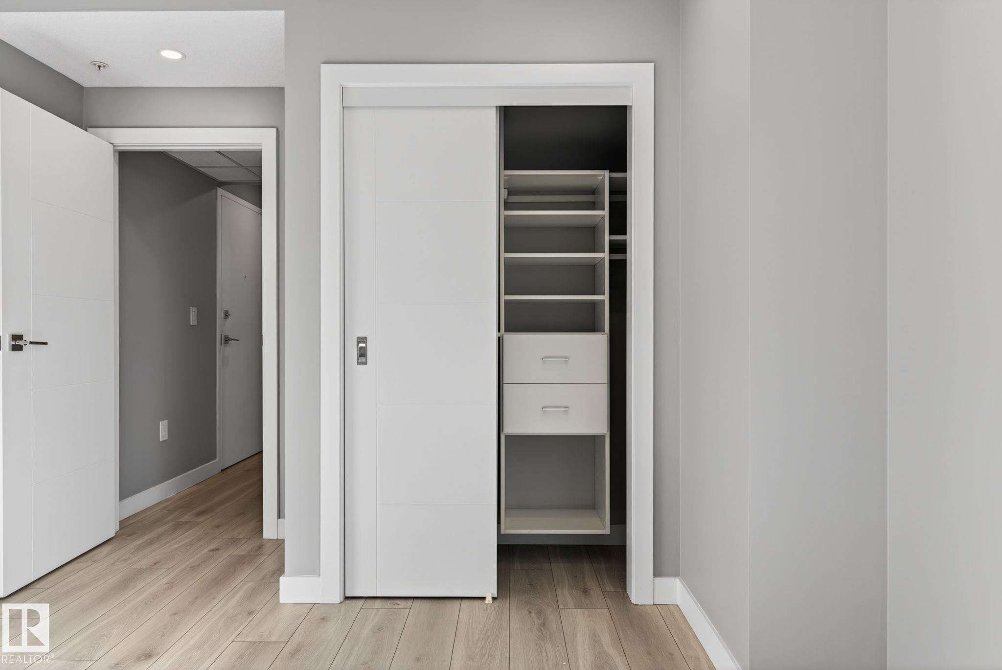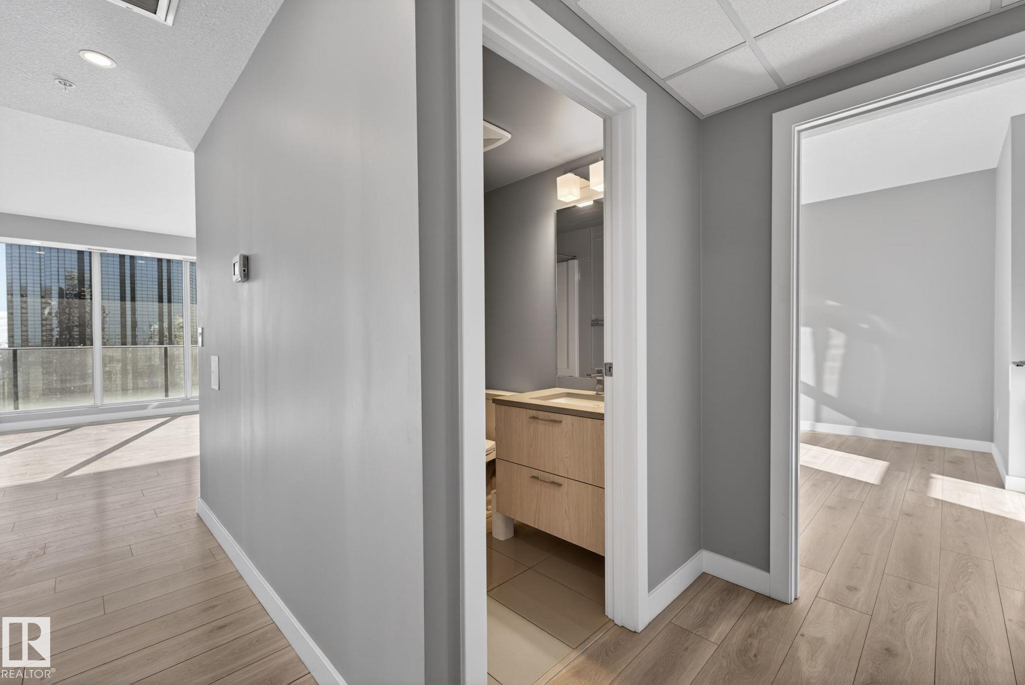 Perched on the 31st floor, this stunning condo offers breathtaking panoramic views—stretching from the north over Rogers Place & the vibrant Ice District, all the way south across the picturesque river valley. Step inside & be immediately captivated by floor-to-ceiling windows that flood the space with natural light, creating an airy and inviting atmosphere. The open-concept layout features a spacious living area with east-facing exposure, perfect for enjoying beautiful sunrises each morning. The modern kitchen is thoughtfully finished with sleek design elements and flows seamlessly into the adjacent dining area—ideal for both everyday living & entertaining. This unit is complete with two generously sized bedrooms, including a primary retreat featuring built-in wardrobes & a private ensuite. Additional highlights include in-suite laundry & underground titled parking for added convenience. Residents also enjoy access to excellent building amenities, including a 4th-floor social room, outdoor patio & gym!
