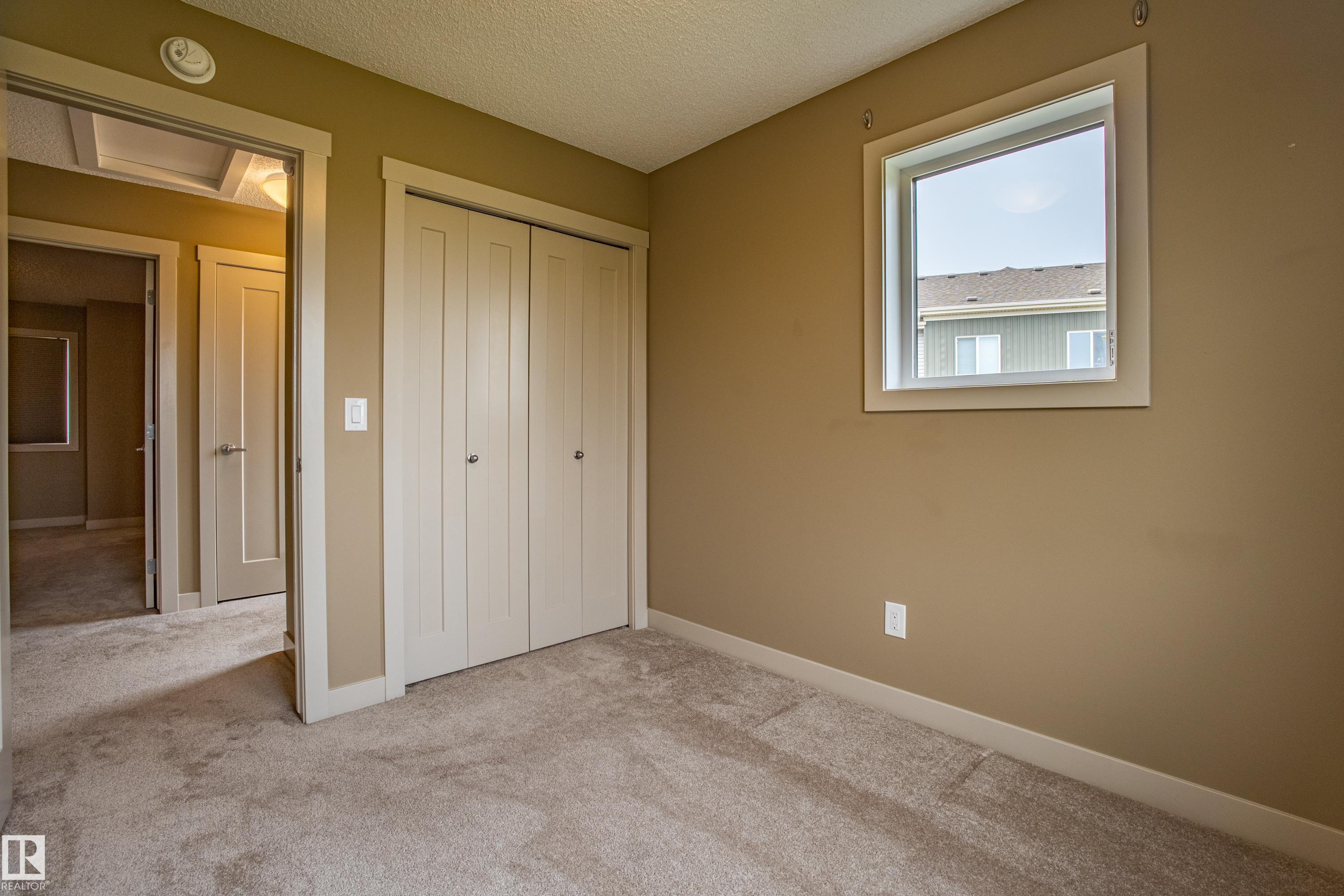 Welcome to Haddow Landing! This air-conditioned, bright south-facing 3-bedroom townhouse includes ***two titled parking stalls right in front of your door*** The two-storey layout is filled with natural light and features an unfinished basement ready for your customization. The main floor offers premium vinyl plank flooring, stainless steel appliances, ^black granite countertops^, and a half bath. Upstairs you’ll find 3 bedrooms and a full bath, with the primary boasting a large walk-in closet. The unit is quietly tucked into the interior of the complex, away from traffic noise. Out back, enjoy a private deck with natural gas BBQ hookup overlooking Haddow Community Park with the Ridge Community Center, playground, hockey rink, and sports fields just a short walk away. Fantastic location only one minute to Terwillegar Drive, close to The Currents at Windermere, and transit is right outside the complex. This home is ready for you!