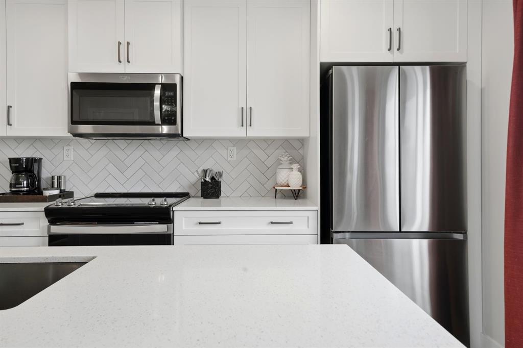 This 1,344 sq ft bright and modern end-unit townhome is located in the highly desirable community of Sixty West. Thoughtfully designed for those who appreciate both style and a connection to nature, the neighbourhood is surrounded by five acres of forest, a scenic pond, parks, and over 4 km of walking trails—offering breathtaking sunsets and a true sense of space and tranquility. The main floor features a stylish kitchen and dining area highlighted by quartz countertops, a statement herringbone tile backsplash, and a generous island. Step outside through the patio door to enjoy your peaceful views from the deck and yard, with convenient access to the double detached garage. Upstairs, you’ll find three spacious bedrooms and a four piece bathroom, including a comfortable primary bedroom complemented by a 3-piece ensuite and walk in closet. Convenient upper level laundry with FULL SIZE washer and dryer. Enjoy being within walking distance to the Gulls Stadium, making it easy to catch a game and be part of the vibrant community atmosphere. For added peace of mind, the balance of the original 10-year National New Home Warranty is transferable to the new owner, providing long-term protection and confidence in your investment. Close to shopping, restaurants, parks and schools. This home is a rare opportunity for both homeowners and investors and has NO CONDO FEES!