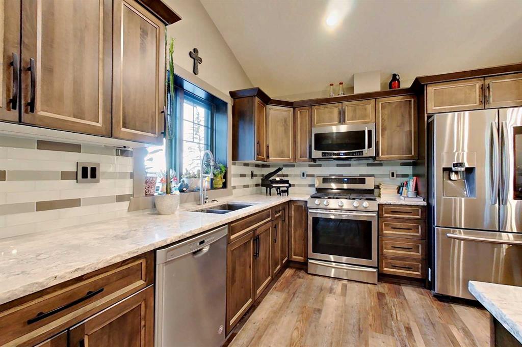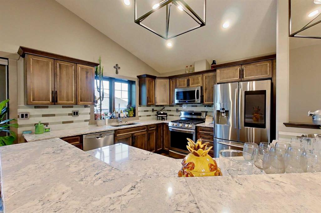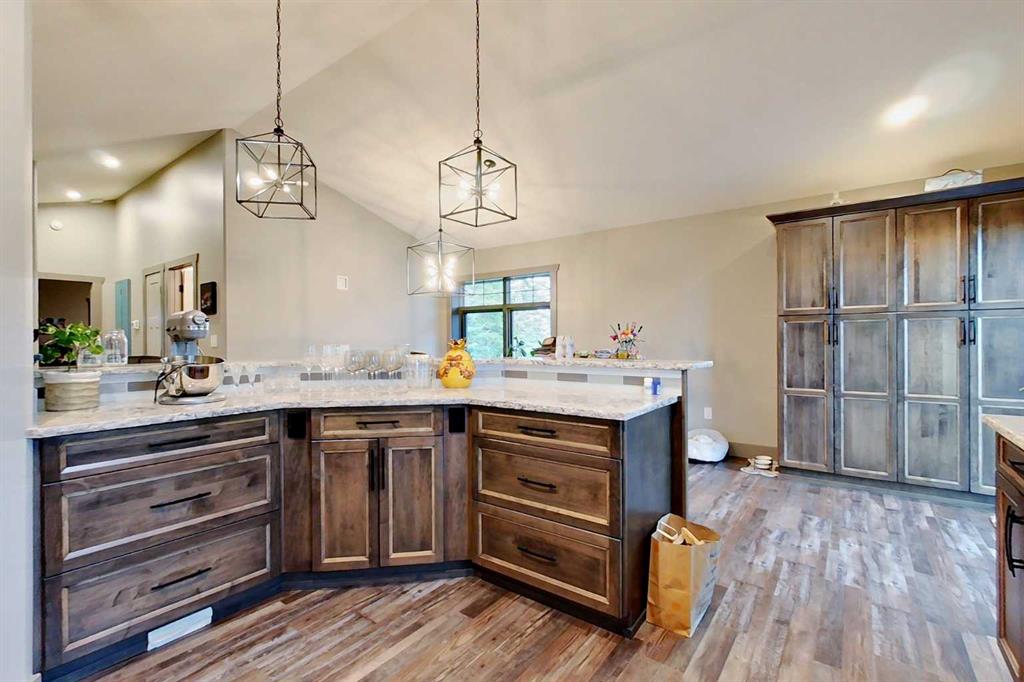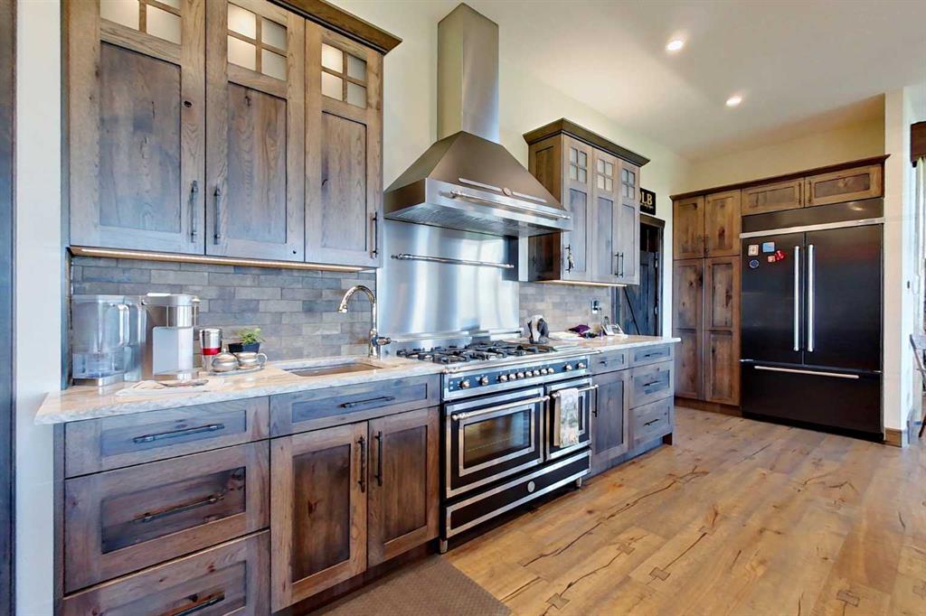 EXECUTIVE ACREAGE WITH STUNNING MOUNTAIN VIEWS AND A PARKLIKE SETTING! First time offered for sale and extremely rare opportunity to purchase this pristine 5.21 +/- Acres Located Just mins South of Olds on pavement. This is the perfect central Alberta location with Less than a 1hr drive to the Calgary airport and just 40 mins to Red Deer. The entire property sends a majestic mountain lodge feel where nature, towering trees, mature landscaping, gardens, family fire pit area, wide open spaces with waterfalls & streams soothe the soul. Executive touches greet you at the impressive main entrance with beautiful timbers, stonework, wrought iron fencing and over 46000 sqft (over 1 acre) of concrete driveway and stamped concrete edging inlays. The sprawling 3690sqft bungalow is loaded with features and class. Built with ICF Block foundation and a top of line list of mechanical features and sound system throughout. Rough edge quartz counter tops highlight a huge island kitchen with two dishwashers, a gas stove imported from overseas , under counter lighting, custom detailed wood artwork and more! The wide open concept and massive west facing windows allow for natural sunlight to stream throughout the entire main floor. Two Large fireplaces on the main floor & main floor laundry. The Primary bedroom is fit for a queen offering the most luxury built-in closet organizers and a massive ensuite with heated floors, two sinks and huge quartz shower. Two more large bedrooms, a 4pc and 2pc bath on the main floor. The basement features a large rec room, bar rough in and future room for even more development. The custom details don't stop in the 62' x 48' attached and heated garage with epoxy floors, 2pc bath, in-floor heart and a hot-water make up heater for quick recovery of heat. The concrete apron just outside the garage doors is also heated. Outbuildings include a fully finished 28' x 28 'detached garage and a massive fully finished 50' x 100' shop with bright LED lighting, in-floor heat, an RV sani-dump station and separate 1542 sqft legal suite. The legal suite includes two full 4pc baths, two bedrooms, large bonus room with custom fireplace mantel, custom kitchen and more! A true 10/10 showing is guranteed! Your best move starts here!