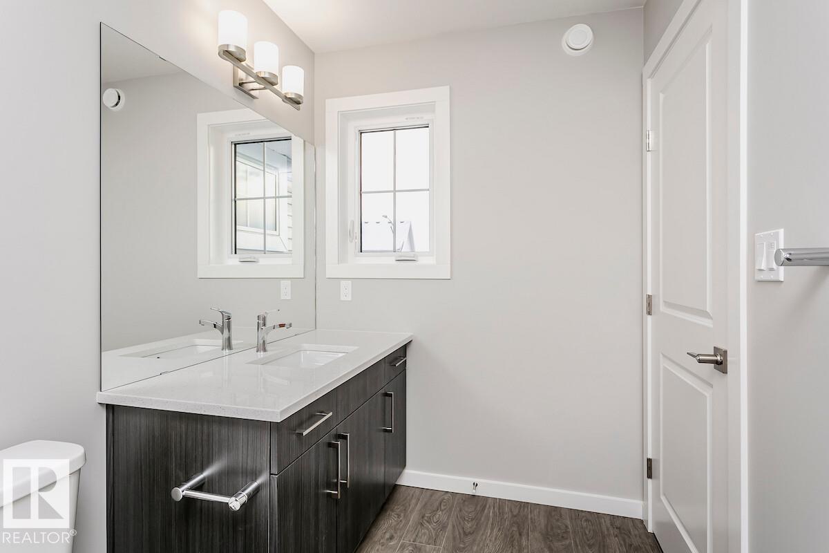 Backing onto a park with no neighbours behind -Side entrance with direct basement access. -9’ basement walls with two windows and a 3-piece bathroom rough-in for future development. -Bright open-to-below design with open-concept living spaces and vaulted ceiling. -Electric Fire & Ice linear fireplace with timer and color controls, flanked by windows for added natural light. -Main floor mudroom with walk-in closet, built-in bench, shelving, and hooks. -Dedicated main floor office / flex room. -L-shaped kitchen with large island and walk-through corner pantry. -Kitchen upgrades include ceiling-height cabinetry and a chimney-style hood fan. -Quartz countertops with undermount sinks throughout. -Second-floor laundry with built-in shelving. -Luxurious 5-piece primary ensuite with dual vanities, tiled shower, tub, and private toilet. -High-efficiency furnace, hot water tank, and HRV system for energy efficiency. Photos are representative.