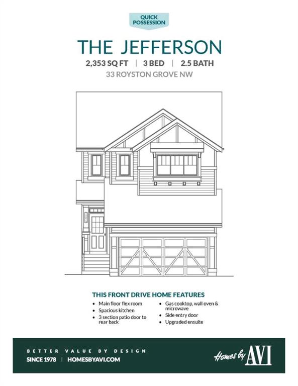 SOME HOMES DON’T JUST CHECK BOXES—THEY REWRITE WHAT “MOVE-IN READY” SHOULD MEAN. Welcome to 33 Royston Grove NW, where the Jefferson model from Homes by Avi proves you can build for comfort and conscience in the same breath. Tucked inside Rockland Park—a community rooted in sustainability and connection—this home feels calm, grounded, and quietly ahead of its time. The main floor opens with a FLEX ROOM right off the foyer—ready to moonlight as an office, library, or the spot where backpacks go to disappear. The kitchen takes centre stage, anchored between the front and back of the home so everyday traffic moves without collision. It’s equipped with a 30" GAS COOKTOP, WALL OVEN, BUILT-IN MICROWAVE, and CHIMNEY HOOD FAN. QUARTZ COUNTERS, a SILGRANIT UNDERMOUNT SINK, and 50" UPPER CABINETS keep the look crisp and clutter-free, while the dining nook connects to an 11' × 10' REAR DECK through an upgraded three-panel patio door. The great room’s FIREPLACE FEATURE WALL pulls the whole main floor together—a little drama, a lot of comfort. Upstairs, a bonus room gives the household breathing room between the PRIMARY RETREAT and two secondary bedrooms. The ensuite earns its upgrades with a SOAKER TUB, GLASS-AND-TILE SHOWER, DUAL-SINK VANITY, and a WALK-IN CLOSET big enough to end the seasonal rotation ritual. Both secondary bedrooms have their own walk-in closets, and the UPPER LAUNDRY ROOM includes a folding counter—because piles happen. The unfinished basement with 9' FOUNDATION WALLS and SEPARATE SIDE ENTRY is ready for whatever version of “next” comes along. Built for the long game, this home layers its durability and efficiency from the inside out: UPGRADED JAMES HARDIE SIDING, R-19 BASEMENT INSULATION, R-50 ATTIC, SOLAR ROUGH-IN CONDUIT, and EV CHARGER ROUGH-IN all contribute to its BUILD GREEN REGISTRATION and future-proof credentials. Rockland Park isn’t just another new northwest community—it’s Calgary’s first MASTER-PLANNED WELLNESS COMMUNITY, built around connection to nature and long-term sustainability. Tree-lined streets lead to a PRIVATE RESIDENTS’ CLUBHOUSE with a POOL, FITNESS CENTRE, and event spaces, and a network of pathways, playgrounds, and scenic lookouts ties it all together. It’s a community where sustainability isn’t a slogan—it’s a standard. It’s not just about living well—it’s about living smart, in a home that gets the assignment. • PLEASE NOTE: Photos are of a DIFFERENT Spec Home of the same model – fit and finish may differ. Interior selections and floorplans shown in photos.