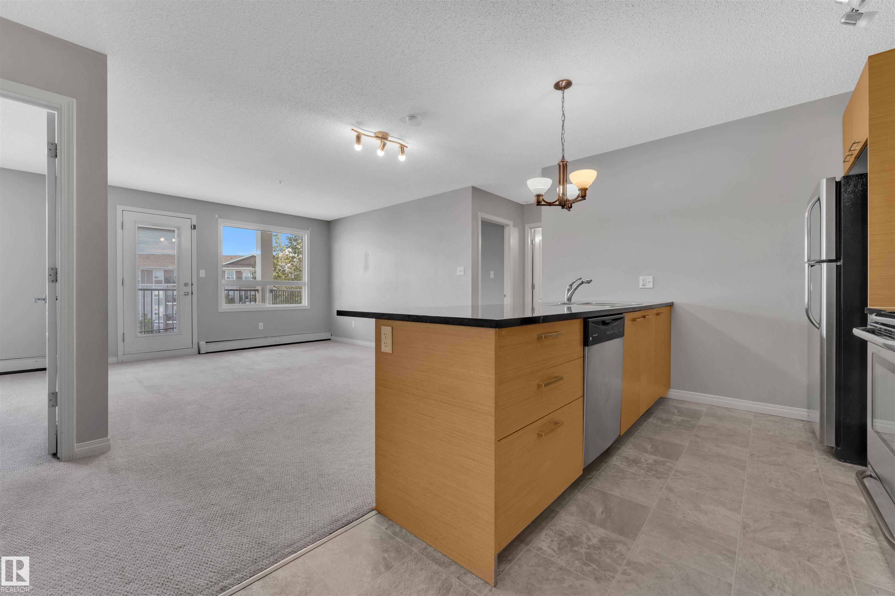 This modern, south-facing third-floor unit offers style and convenience. Featuring an open-concept design, the gourmet kitchen boasts granite countertops, soft-close cabinetry, and Frigidaire stainless steel appliances. The primary bedroom includes a walk-in closet and a private ensuite with extra storage for towels and linens. A second bedroom, full bathroom, and a spacious in-suite laundry/storage room add functionality. Two titled, energized parking stalls are included. Enjoy building amenities such as a fitness center, guest suite, and social room. Condo fees cover water, heat, snow removal, landscaping, and exterior maintenance. Located near the Anthony Henday, Terwillegar Rec Centre, and scenic MacTaggart walking trails, this unit combines comfort with accessibility—perfect for modern living!