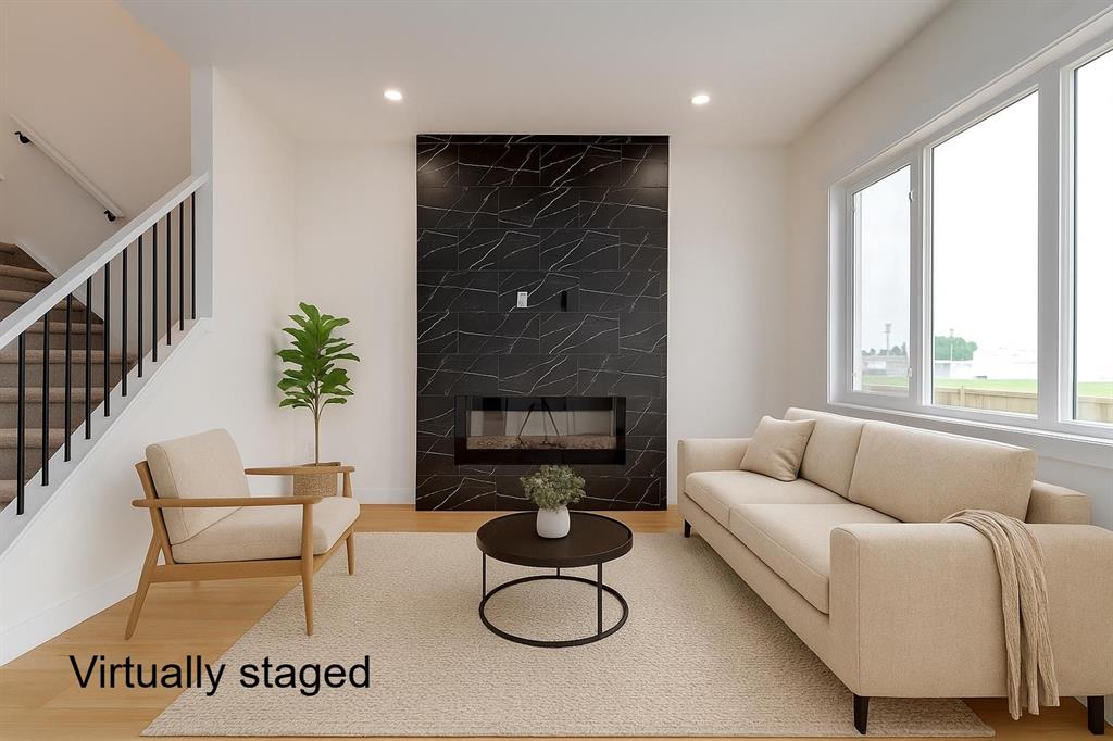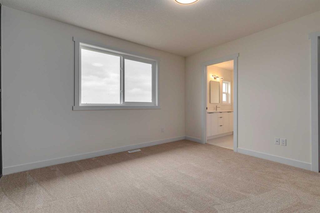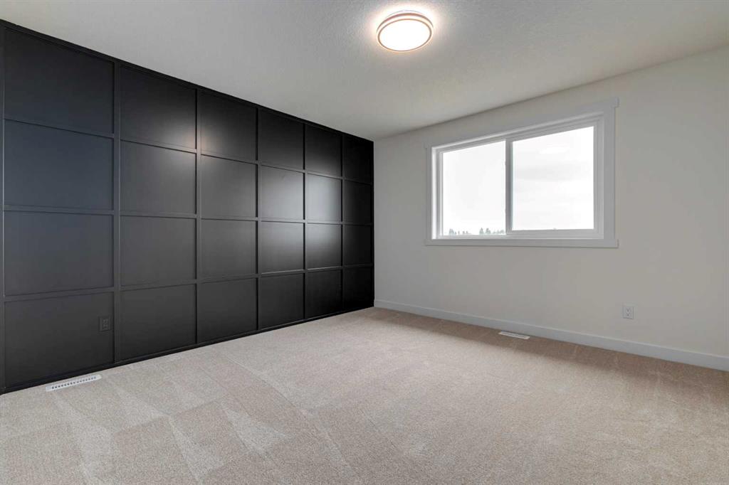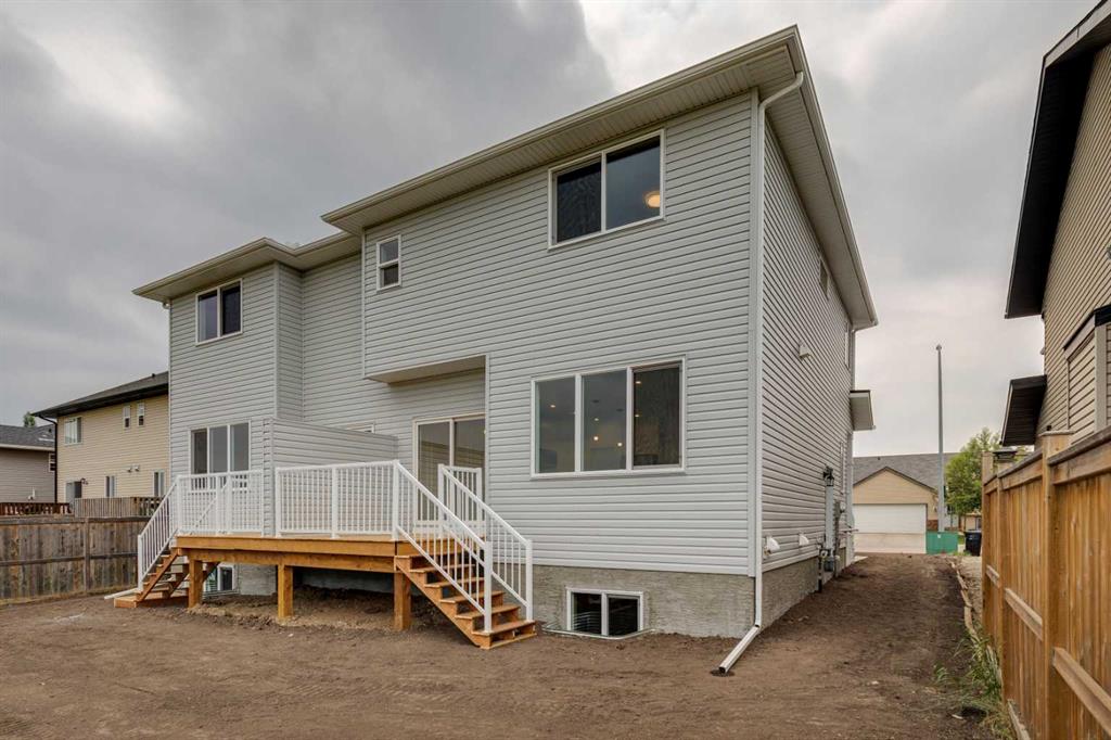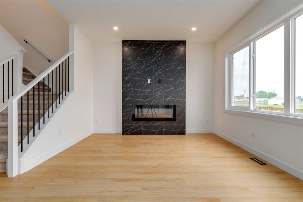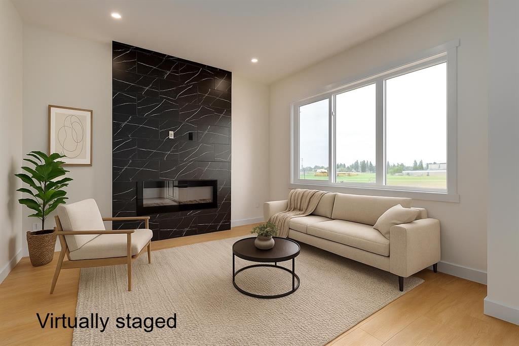 Welcome to this stunning newly built ½ duplex in the peaceful and growing town of Didsbury, where small-town charm meets modern living. Your new home was expertly constructed by Trailmark Homes, thoughtfully designed with no expense spared! This home is packed with high-end finishes, unique architectural touches, and smart construction upgrades that make it a standout in its class. Step inside and you’ll immediately notice the attention to detail. The main floor features beautiful 6.5mm luxury vinyl plank flooring, sleek black accents, spindle railing, and a wood feature wall in the dining area that adds warmth and character. The living room offers an inviting space with a striking electric linear fireplace surrounded by full-height tile. The spacious powder room includes a full vanity—an elevated and rare touch in similar homes. The designer kitchen is truly impressive, boasting quartz countertops with dramatic waterfall edges on the island, a stylish two-tone cabinet design with painted MDF uppers and melamine lowers, full-height cabinets, soft-close drawers and doors, and a massive walk-in pantry. High-end Samsung Bespoke AI Home appliances make this space as functional as it is beautiful. Upstairs, you’ll find three generously sized bedrooms. The primary suite includes a bold black wood feature wall, a large walk-in closet, and a luxurious ensuite with an oversized shower, dual vanities, and anti-fog, LED-lit multifunction mirrors. The additional two bedrooms are bright and well-sized, and the upper floor also features a full main bathroom and a convenient laundry area with Samsung Bespoke washer and dryer included. The basement is undeveloped and offers excellent potential for a future legal suite (subject to town approval). It includes a private side entrance, rough-ins for a bathroom and kitchenette, and full-span floor joists—meaning there are no posts, allowing for an open and functional layout when finished. This home also includes an Ecobee smart thermostat, upgraded carpet and underlay, Moen faucets throughout, and a driveway constructed with fiberglass rebar to help reduce the chance of cracking. The backyard is spacious and backs onto the high school field, offering a peaceful view and extra privacy. A back deck is already built and includes a gas line, you also get a $500 landscaping credit. The home is also covered by full new home warranty for added peace of mind. Located just 40 minutes north of Calgary, Didsbury is a welcoming and well-serviced community offering schools, shopping, parks, medical facilities, and a golf course—all with the feel of a close-knit town. Whether you're a first-time buyer, investor, or looking for a stylish new home with future suite potential (subject to town approval), this property offers unmatched value, functionality, and style. Don’t miss your chance to own a thoughtfully built, beautifully finished new home in one of Alberta’s most charming small towns. Book your private showing today!
