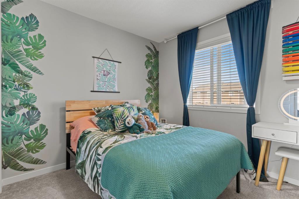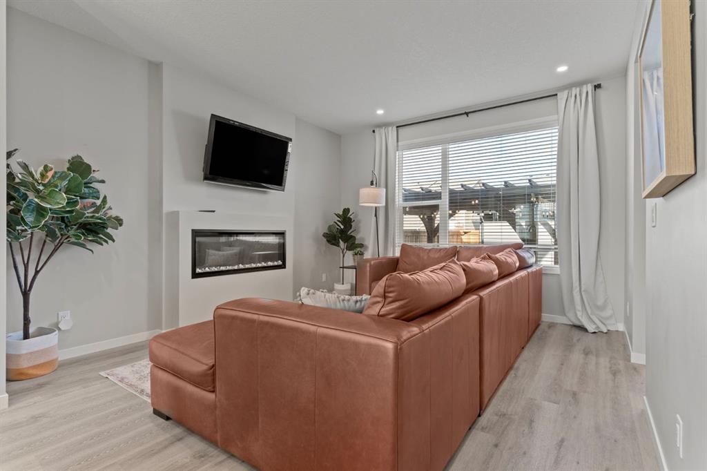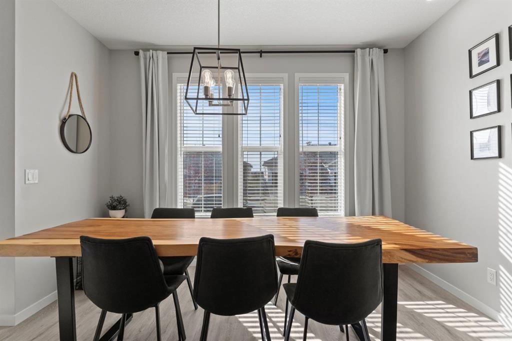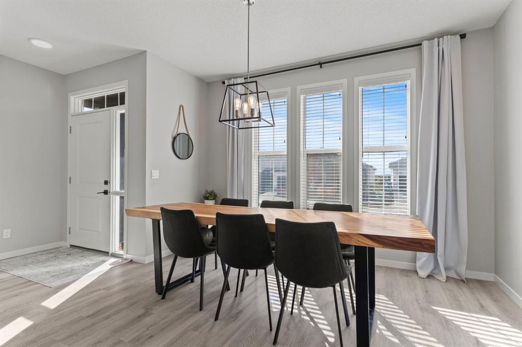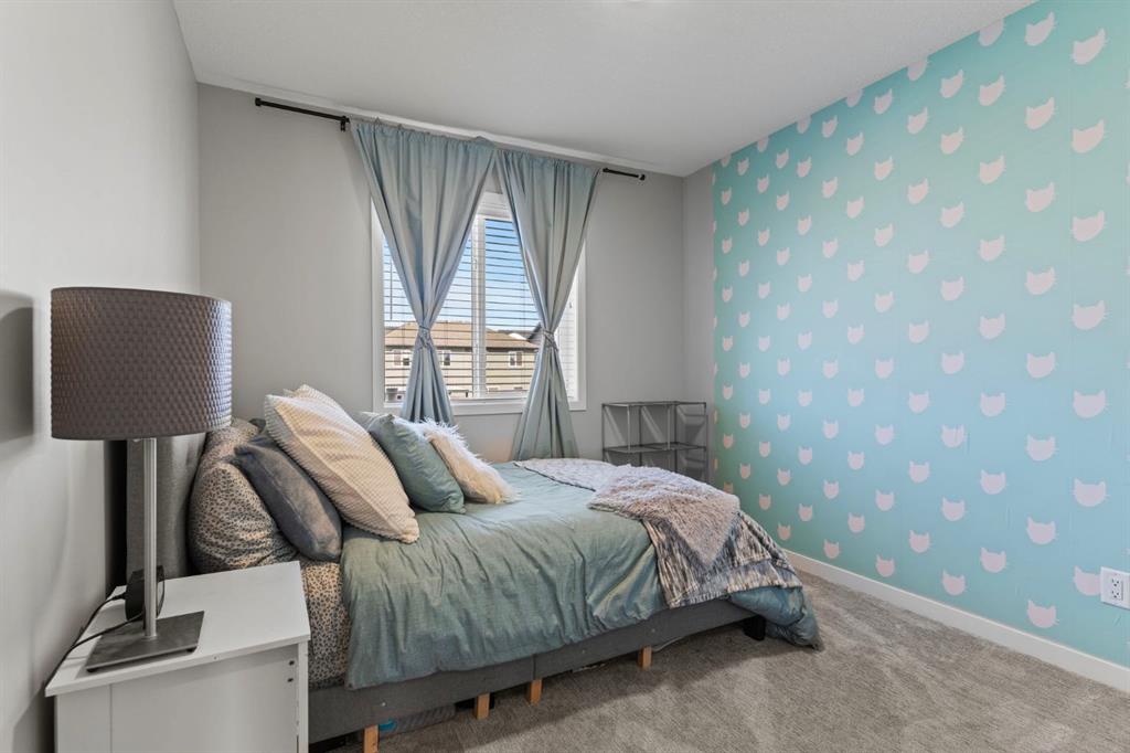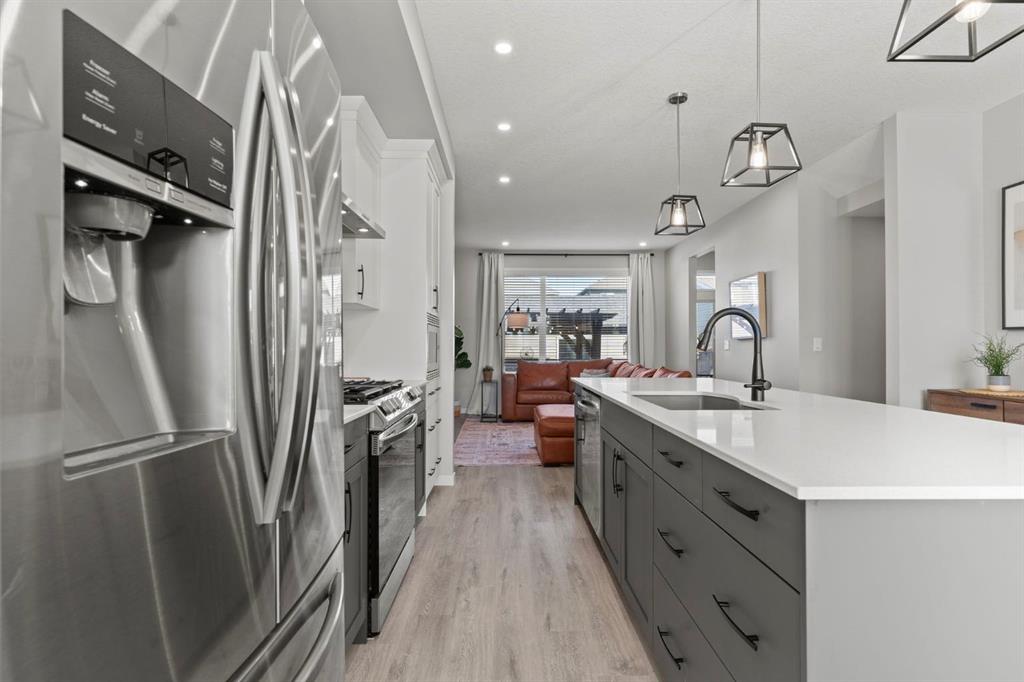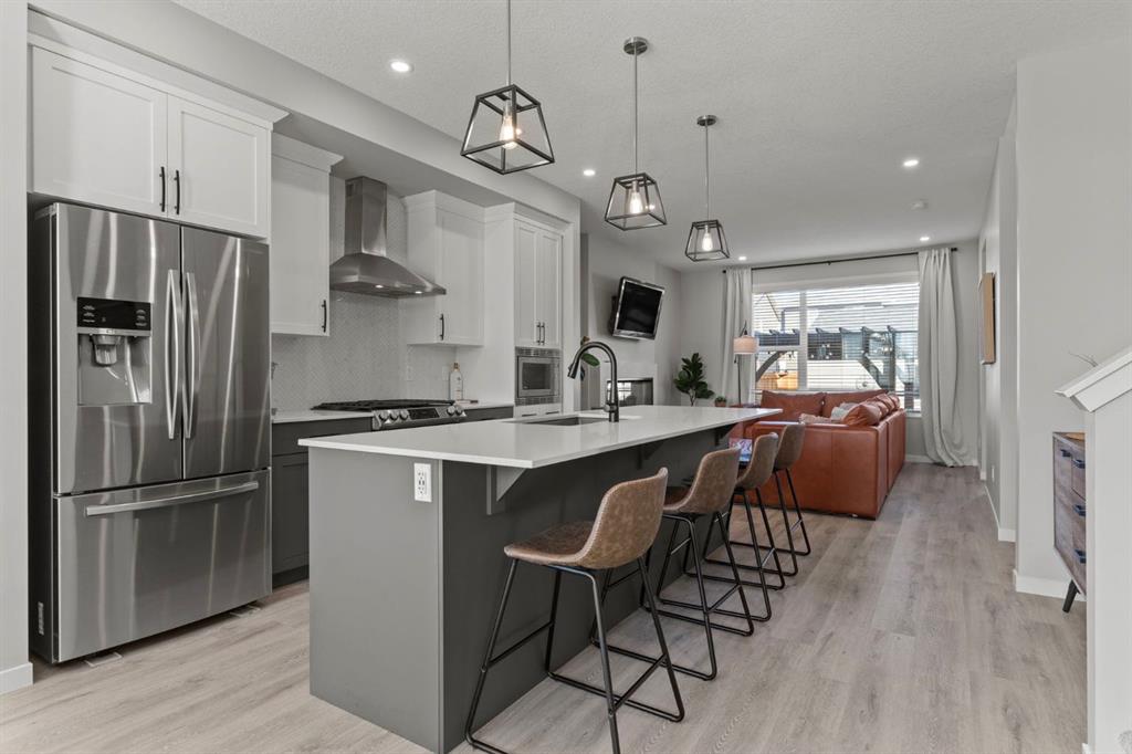 Welcome to this stunning, semi-detached 2-storey home in the sought-after community of Wedderburn in Okotoks -where modern design meets small-town charm. Offering over 2,100 sq. ft. of total living space, this 5-bedroom, 3.5-bath home provides exceptional comfort for growing families, busy professionals, or anyone looking for a move-in-ready property that has it all. The stylish and inviting main floor features a bright and open layout with large windows that fill the space with natural light. The designer kitchen combines beauty and performance showcasing quartz countertops, upgraded stainless steel appliances including a gas range and ceiling -height cabinetry. The central island is perfect for casual meals or for ease in entertaining and there is a spacious dining area creating an ideal gathering space for family and friends. A convenient 2 pce powder room and versatile back entry space with built in bench and hooks complete the main level. Upstairs, you’ll find three comfortable and spacious bedrooms, including the warm and welcoming primary retreat complete with a convenient walk-in closet for all your storage needs. The ensuite offers thoughtful touches with dual sinks, a large stand-up shower, and warm modern finishes — the perfect start and end to your day. A full main bath and upper-level laundry add everyday functionality. The basement is fully finished and expands your living options with a cozy family room, two additional bedrooms, and a 4-piece bathroom perfect for guests, teens, or a home office setup. Step outside and enjoy your private low-maintenance backyard oasis, highlighted by a stamped concrete patio, charming pergola with café lights, and a hot tub for year-round relaxation. There’s no grass to mow, just space to unwind and entertain in your backyard oasis. The property also features air conditioning for summer comfort and a double detached garage off the back lane for parking and storage options. You are ideally located close to community walking paths, playgrounds, and the many amenities that Okotoks has to offer, this home truly combines modern living with community warmth.