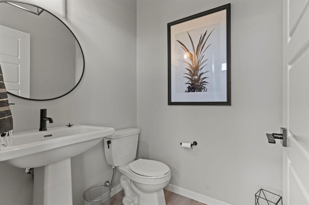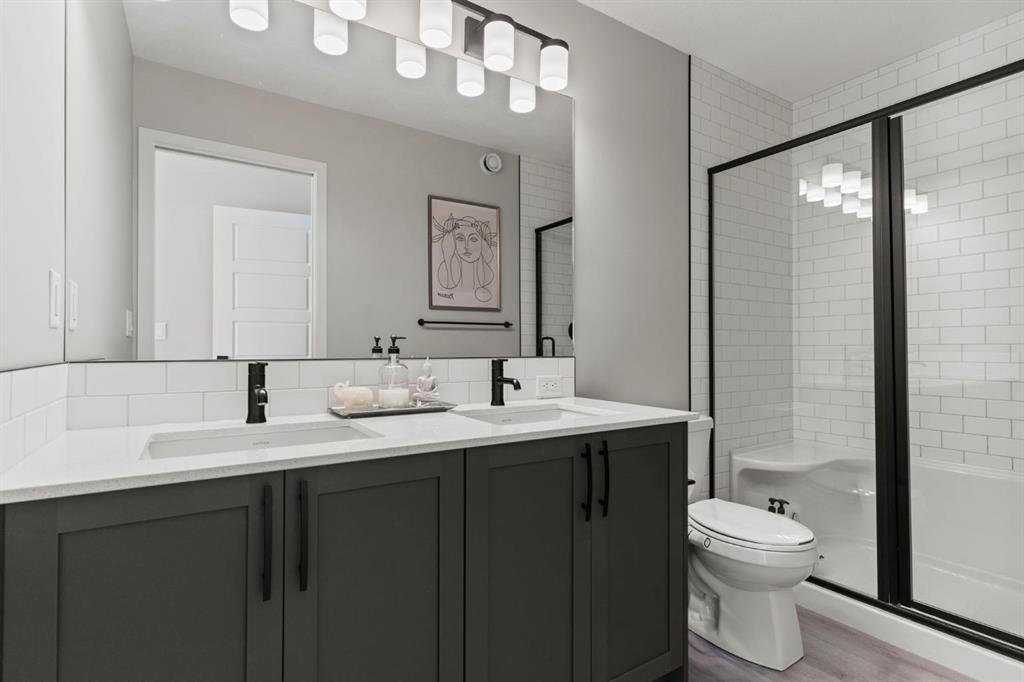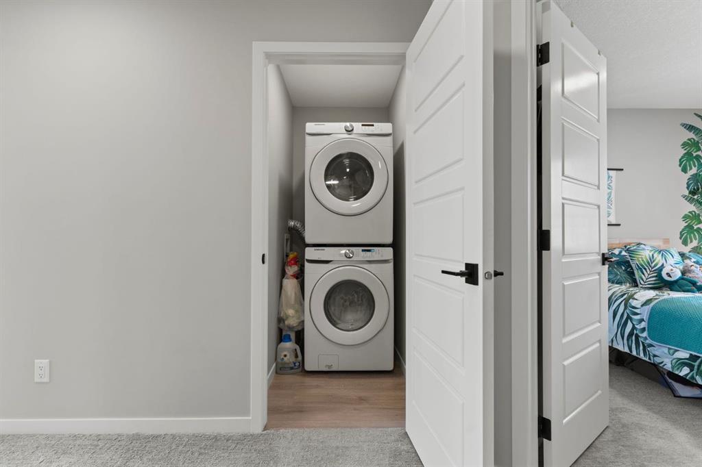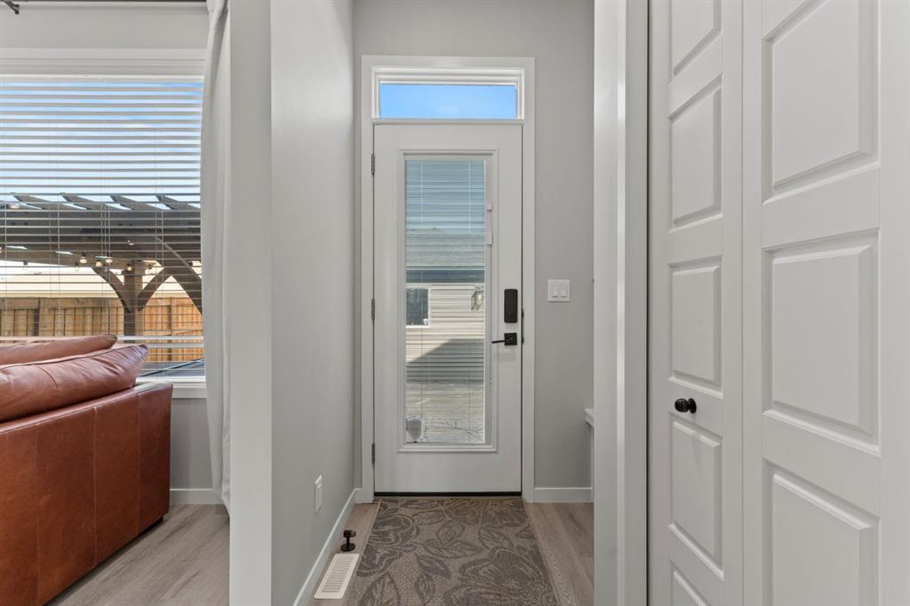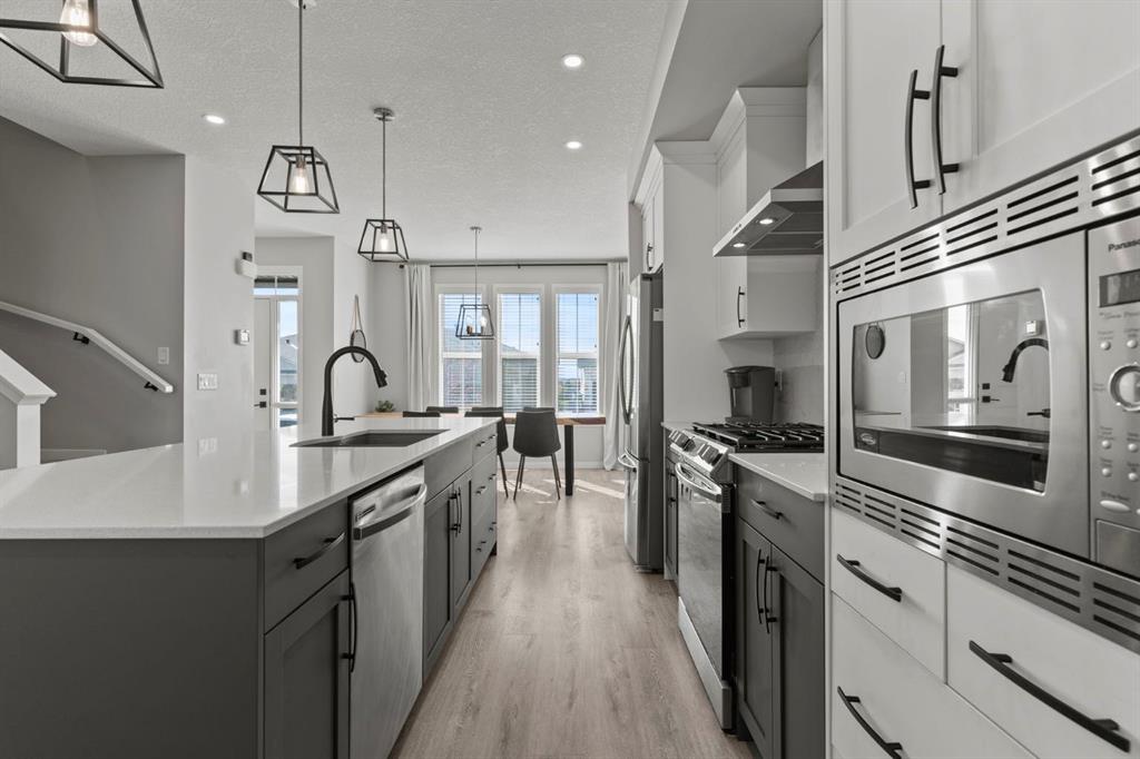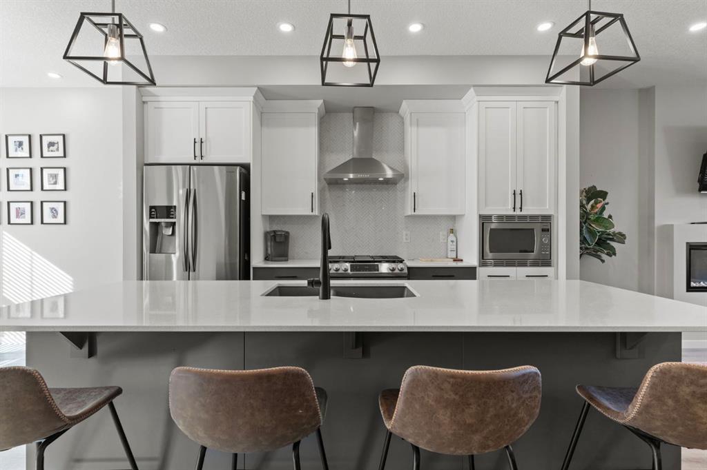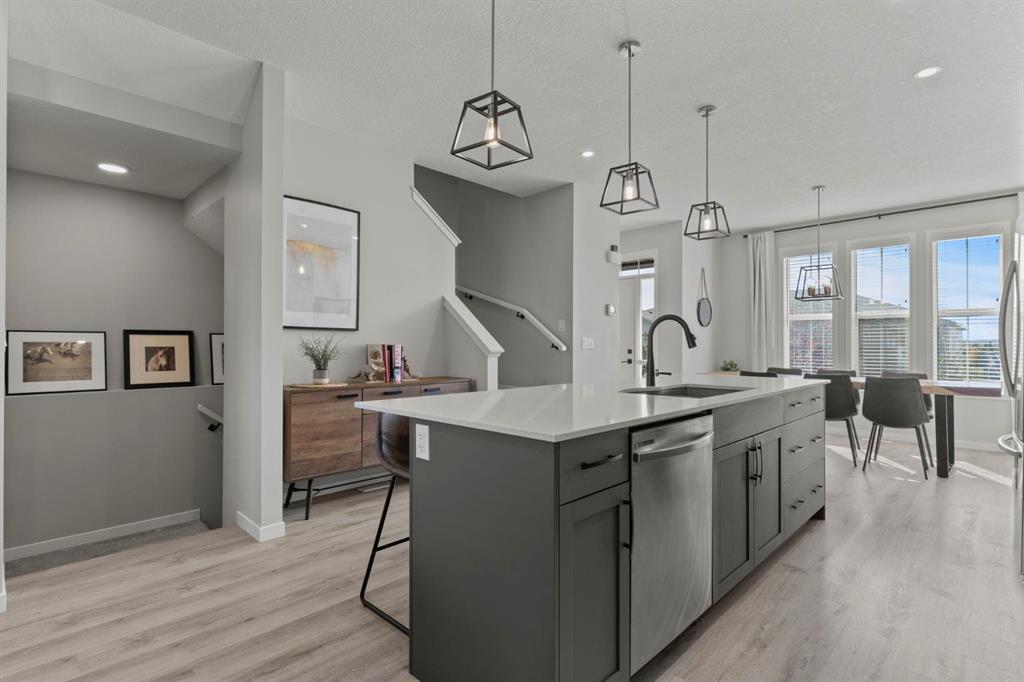 Welcome to this stunning, semi-detached 2-storey home in the sought-after community of Wedderburn in Okotoks -where modern design meets small-town charm. Offering over 2,100 sq. ft. of total living space, this 5-bedroom, 3.5-bath home provides exceptional comfort for growing families, busy professionals, or anyone looking for a move-in-ready property that has it all. The stylish and inviting main floor features a bright and open layout with large windows that fill the space with natural light. The designer kitchen combines beauty and performance showcasing quartz countertops, upgraded stainless steel appliances including a gas range and ceiling -height cabinetry. The central island is perfect for casual meals or for ease in entertaining and there is a spacious dining area creating an ideal gathering space for family and friends. A convenient 2 pce powder room and versatile back entry space with built in bench and hooks complete the main level. Upstairs, you’ll find three comfortable and spacious bedrooms, including the warm and welcoming primary retreat complete with a convenient walk-in closet for all your storage needs. The ensuite offers thoughtful touches with dual sinks, a large stand-up shower, and warm modern finishes — the perfect start and end to your day. A full main bath and upper-level laundry add everyday functionality. The basement is fully finished and expands your living options with a cozy family room, two additional bedrooms, and a 4-piece bathroom perfect for guests, teens, or a home office setup. Step outside and enjoy your private low-maintenance backyard oasis, highlighted by a stamped concrete patio, charming pergola with café lights, and a hot tub for year-round relaxation. There’s no grass to mow, just space to unwind and entertain in your backyard oasis. The property also features air conditioning for summer comfort and a double detached garage off the back lane for parking and storage options. You are ideally located close to community walking paths, playgrounds, and the many amenities that Okotoks has to offer, this home truly combines modern living with community warmth.