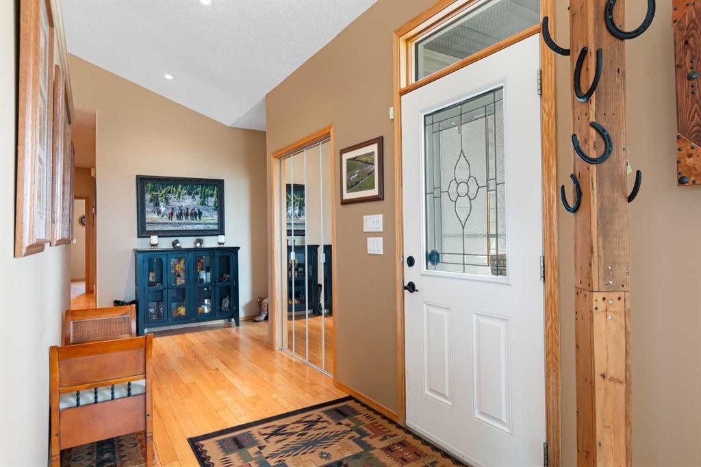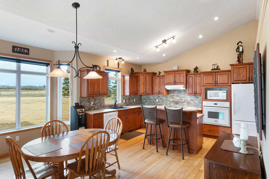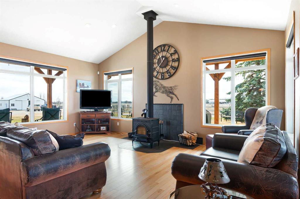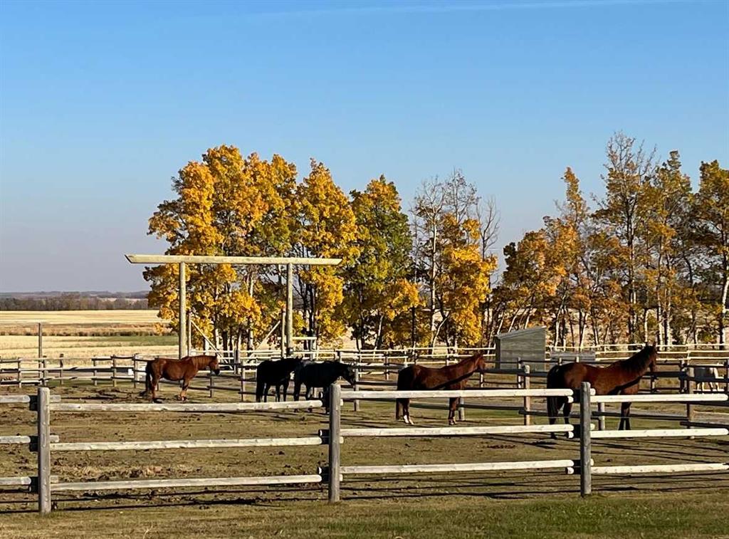 Welcome to this immaculate 153-acre property in Red Deer County, just 12 minutes NW of Olds, less than an hour to Calgary and 30 minutes to Red Deer. The main home is a 1,667 sq ft bungalow with a double heated attached garage. Inside, you’ll find three bedrooms on the main floor, including a spacious primary suite with a four-piece ensuite, plus another full bathroom and a well-appointed laundry room with access to the garage. The open-concept kitchen, dining, and living area is bright and inviting, with large windows offering stunning views from every angle. The kitchen features warm wood cabinetry and a large island, while the living room adds a cozy charm with its wood-burning stove. Hunter Douglas blinds are installed throughout for comfort and efficiency. A screened-in sunroom with a patio door and fully opening windows provides a peaceful space to enjoy the views and all four seasons. The finished basement includes another bedroom, a three-piece bathroom, a large rec room and a hobby room. There is in-floor heat in the basement, instant hot water, and a 50-gallon automatic water heater. The home also has A/C. Equestrian or livestock amenities include a professionally built, insulated and heated 80x180 INDOOR RIDING ARENA with humidity control, four forced-air heaters, a 14x14 overhead door and air circulation fans. The arena ground footing was professional done. A roll-up door connects to the 20x120 BARN with in-floor and overhead heat , four soft-cushioned stalls, a wash bay, large tack room with a sink, and built-in saddle racks. A 20x60 lean-to adds more storage and shelter. The arena is monitored by seven professionally installed, Wi-Fi-compatible security cameras. Attached to the arena is a beautiful 1,701 sq ft home with a full wraparound veranda. It offers two bedrooms, including a generous primary suite with a five-piece ensuite and a massive walk-in closet, plus an office with a window overlooking the arena. The kitchen offers abundant cabinetry and a central island, while the dining area features patio doors and the living room boasts another cozy wood stove. A spacious mudroom/laundry room and ample storage throughout make this home as practical as it is charming. Outbuildings include a partially heated 60x90 SHOP, a heated 30x36 MAIN BARN with two stalls—one convertible to a foaling stall with a camera monitor—and a heated tack room with hot and cold water. The massive 70x43 hay shed holds up to 300 large square bales. Aviation lovers will appreciate the 42x36 airplane hangar with a bi-fold door, a tower and a private runway stretching nearly the full length of the quarter. The land is thoughtfully fenced with all-rail fencing—NO BARBED WIRE—and includes a mix of pasture and paddocks, including introduction pens, automatic waterers, and 2 OUTDOOR RIDING ARENAS. There are also 3 high producing water wells on the property. Approximately 80 acres of cultivated farmland with two dugouts complete this versatile and truly impressive property.